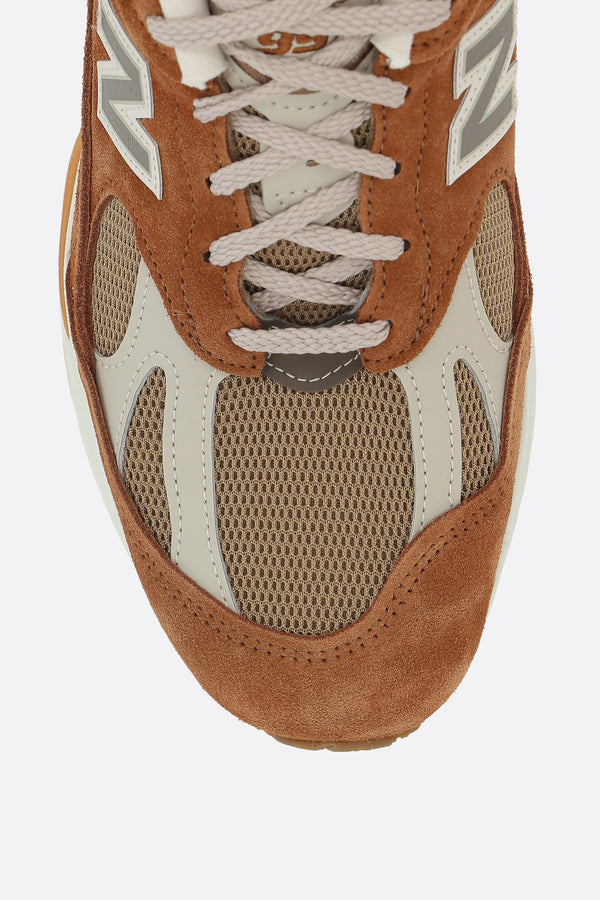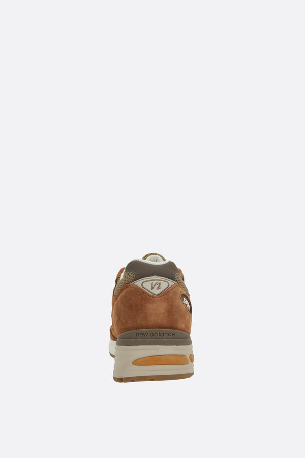 New Balance low-top sneakers crafted from brown-toned mesh and suede. Featuring lace-up closure, round toe, fabric lining, FuelCell midsole, and rubber sole. The design is completed with embroidered “N” patches on the sides and “Made in England 991” embroidery on the tongue.