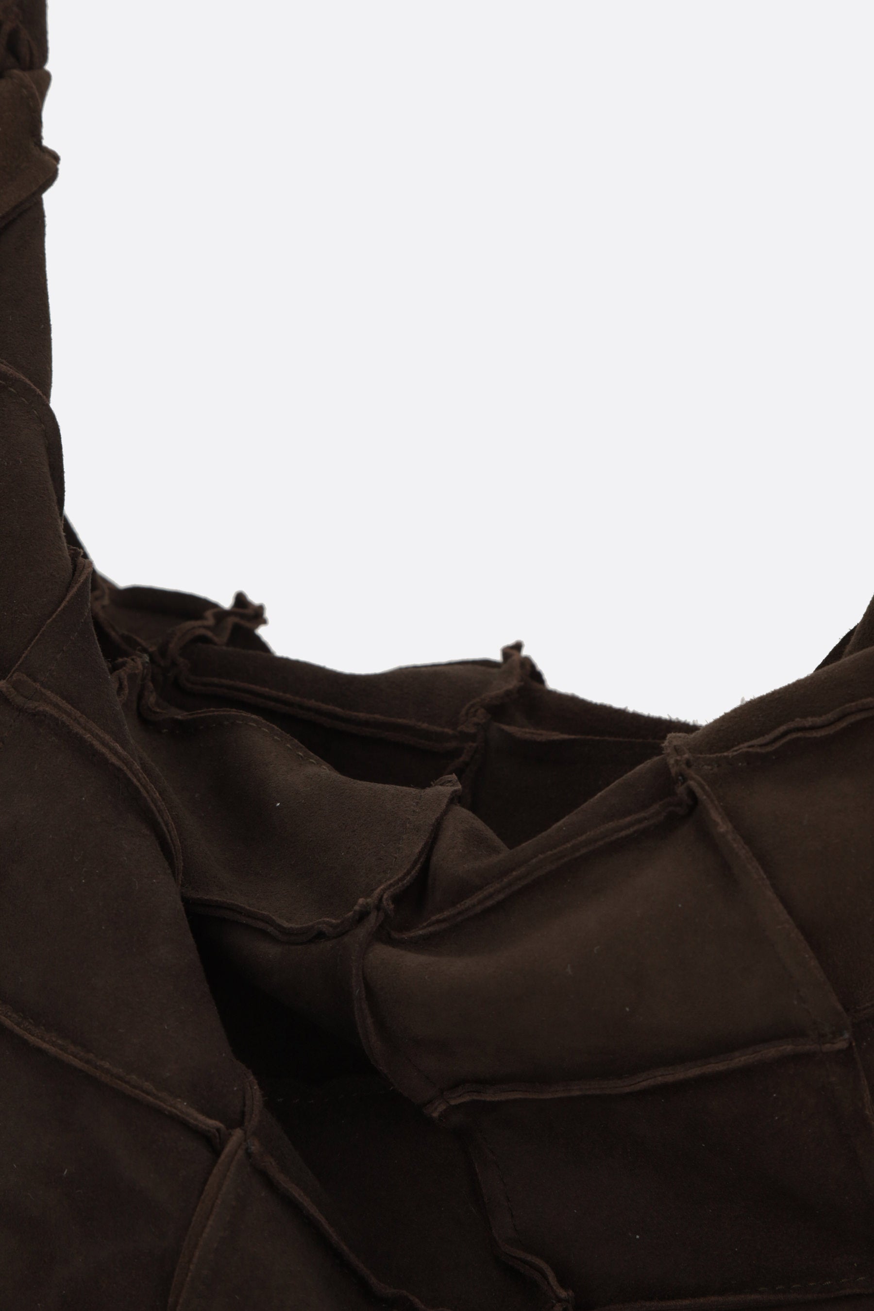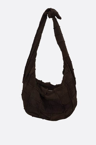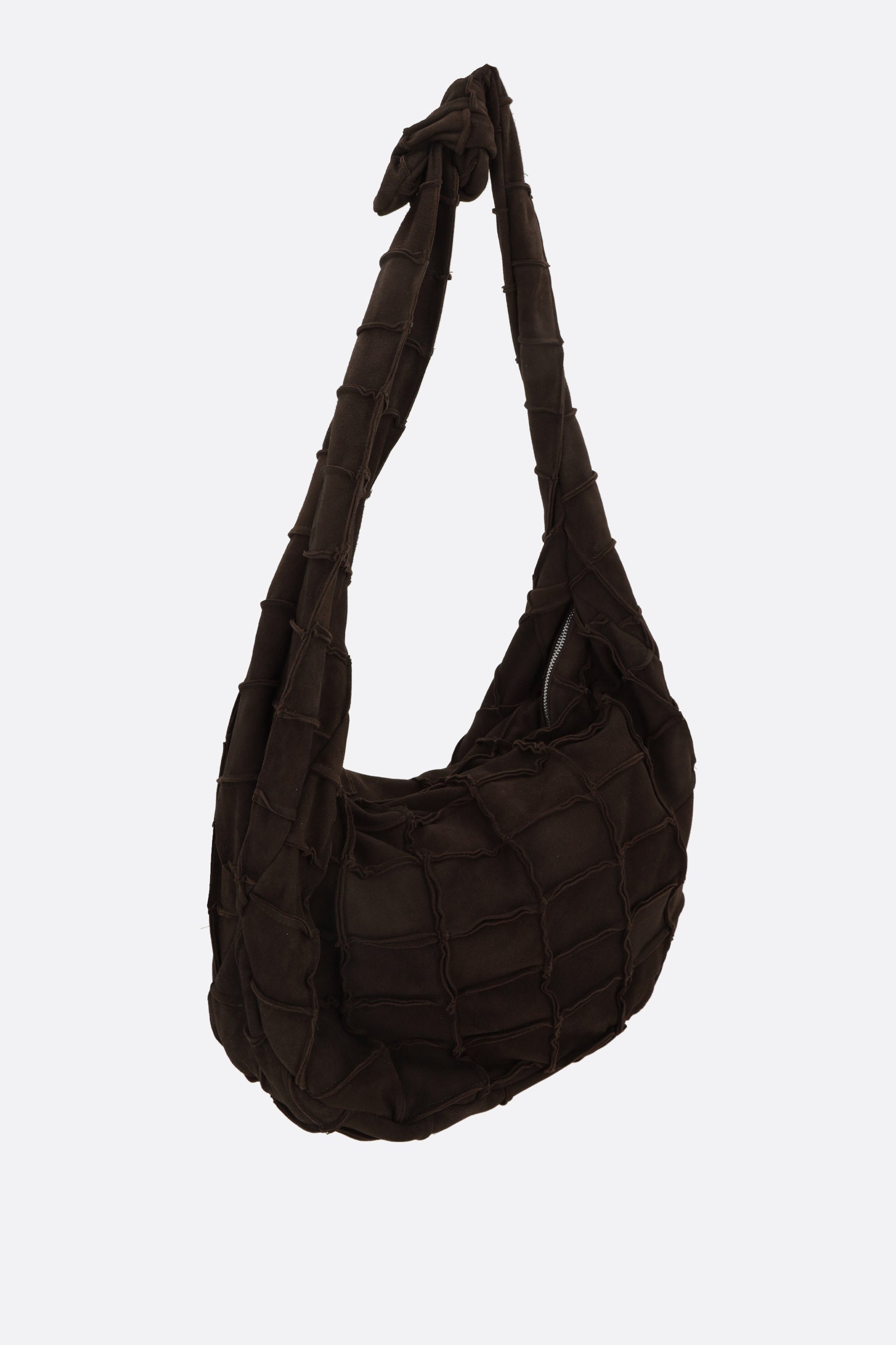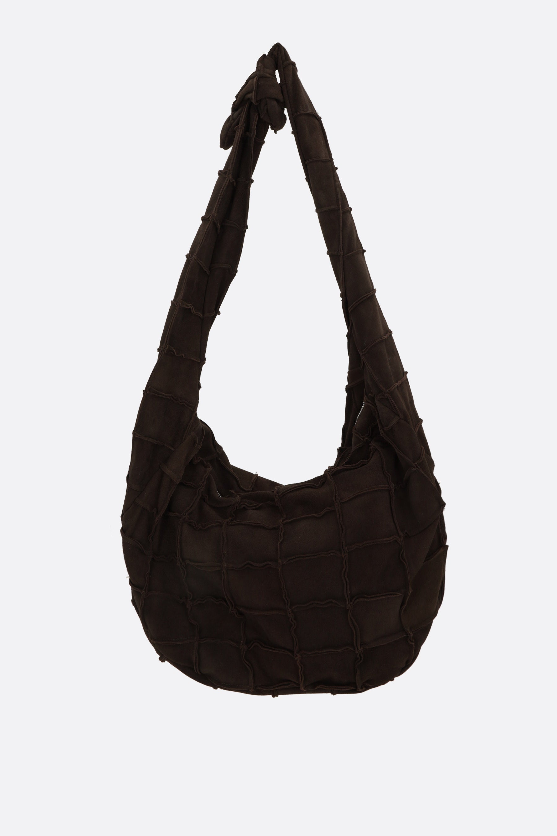 Niccolò Pasqualetti hobo bag made of dark brown patchwork suede. It features silver-tone hardware, a zip closure, and an adjustable shoulder strap with a knot. The black satin-lined interior includes a flat pocket.