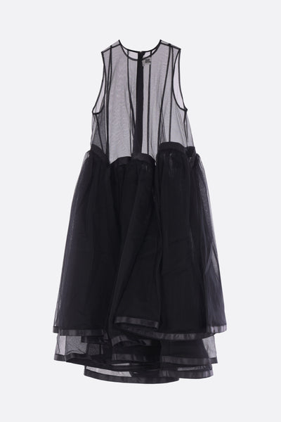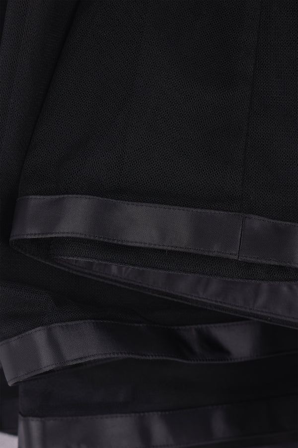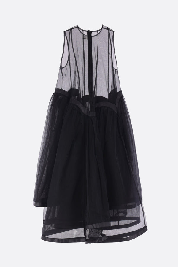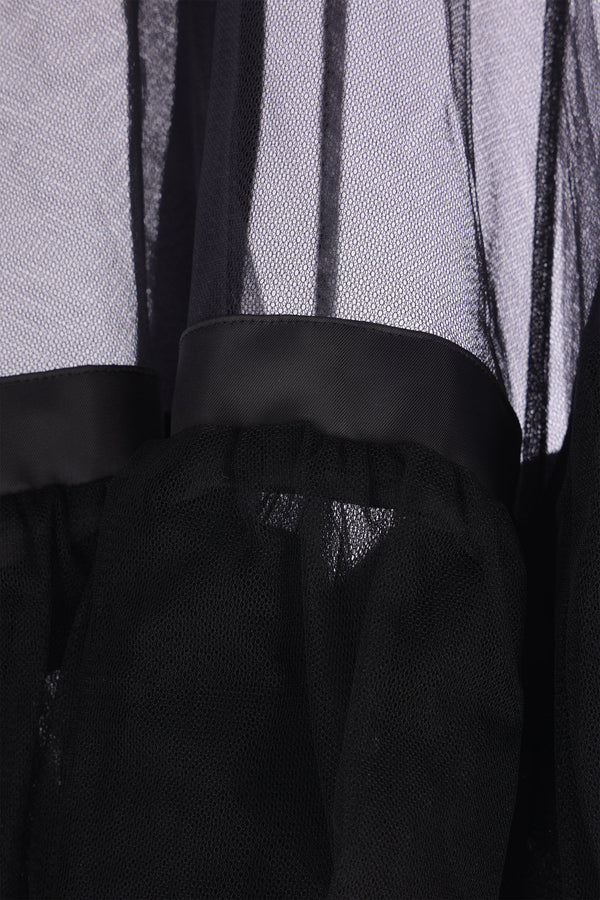 Noir Kei Ninomiya sleeveless dress made from black tulle. Features a crew neckline, invisible back zip closure, scalloped waist details with overlapping drapes, and unlined interior.