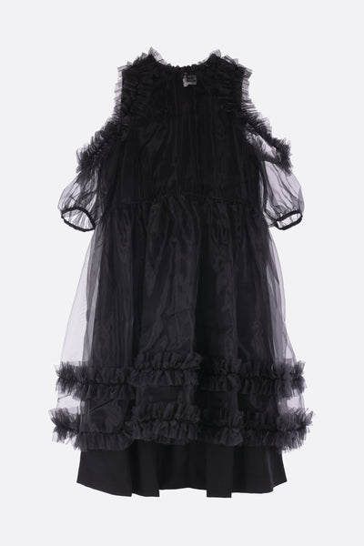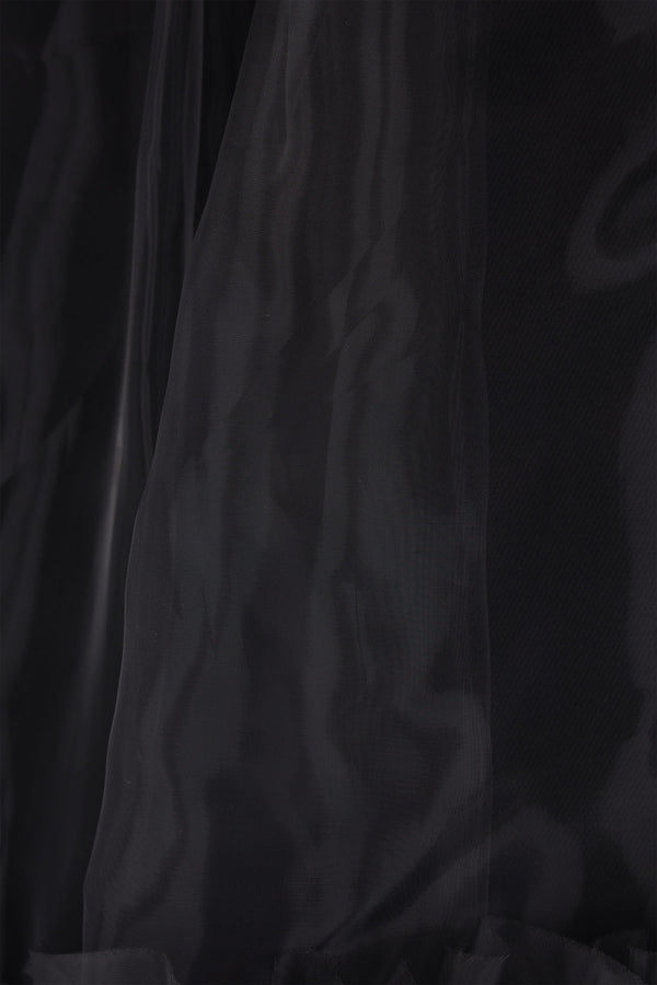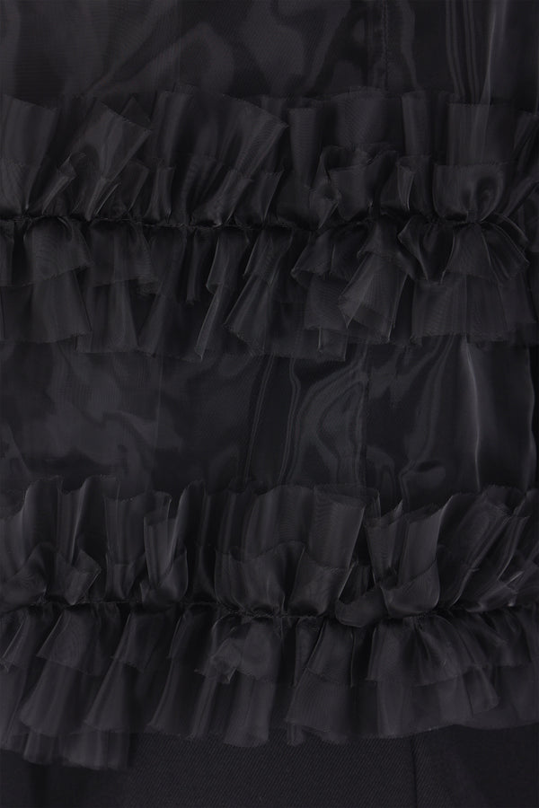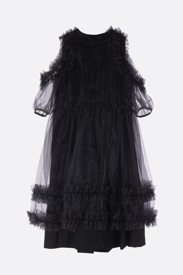 Noir Kei Ninomiya midi dress made from black wool gabardine with organza overlay. Features a crew neckline, back zip closure, short sleeves with shoulder cut-outs, gathered waist, ruffle detailing along the edges, and lined interior.