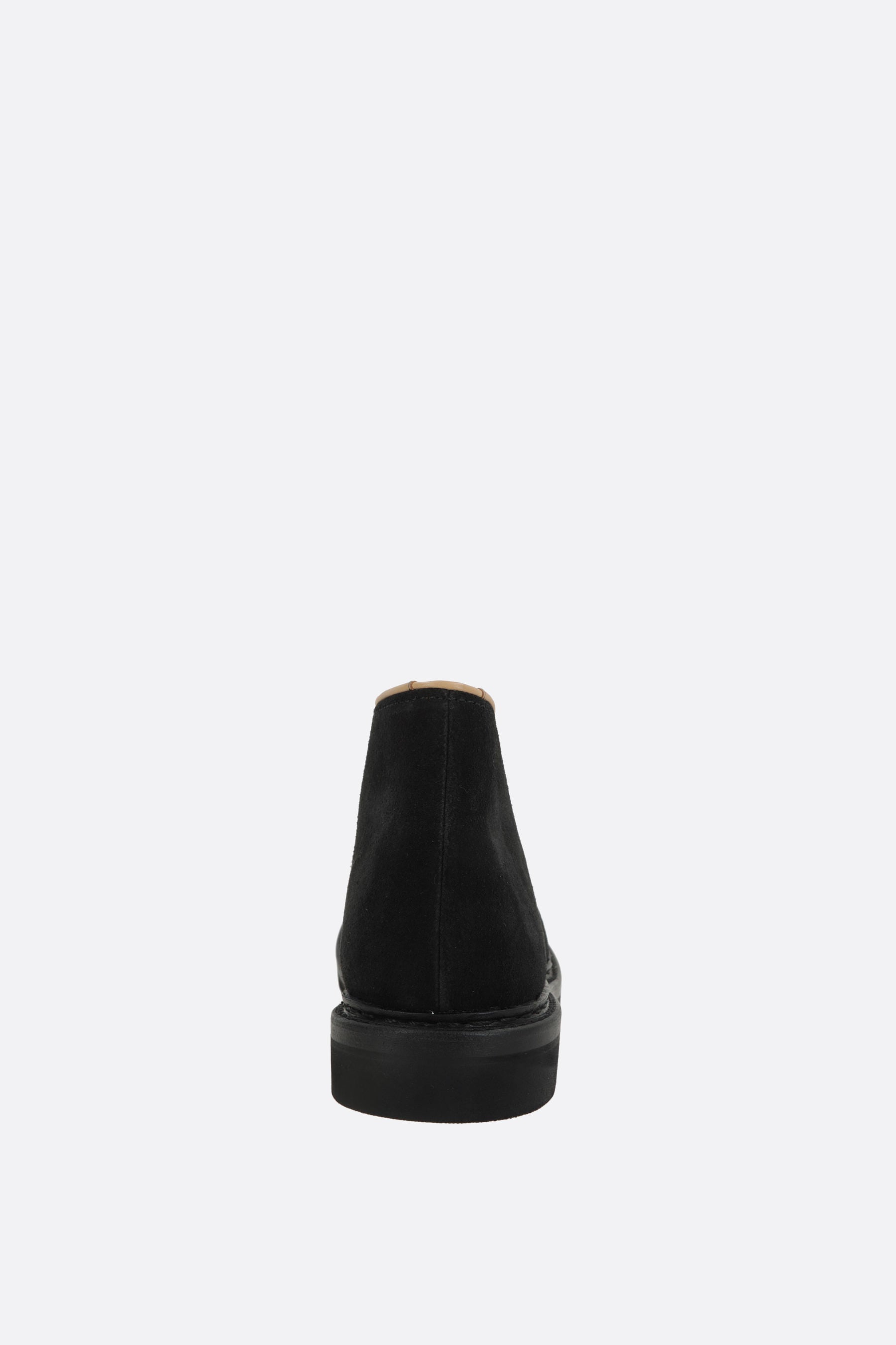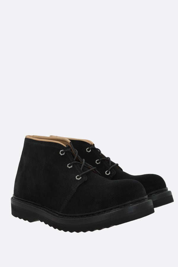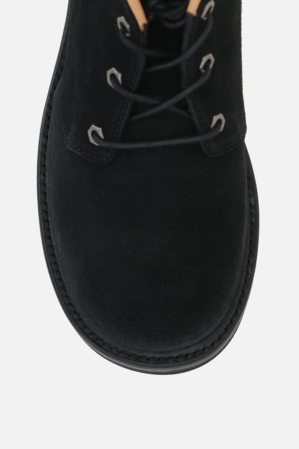 Our Legacy chukka boots crafted from black suede. Featuring a round toe, lace-up closure, leather lining, and Vibram rubber sole. The design is completed with a metal logo plaque on the tongue.