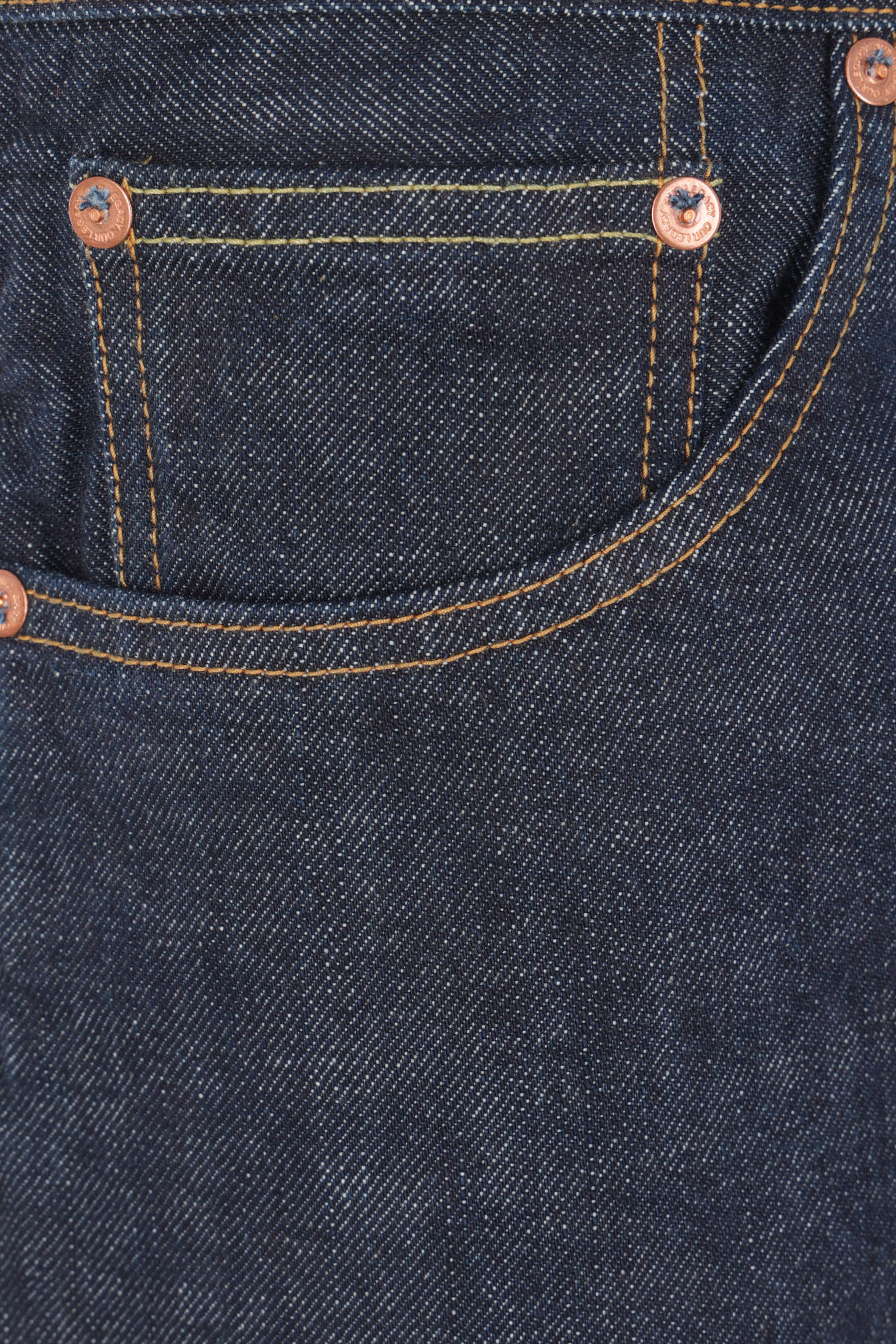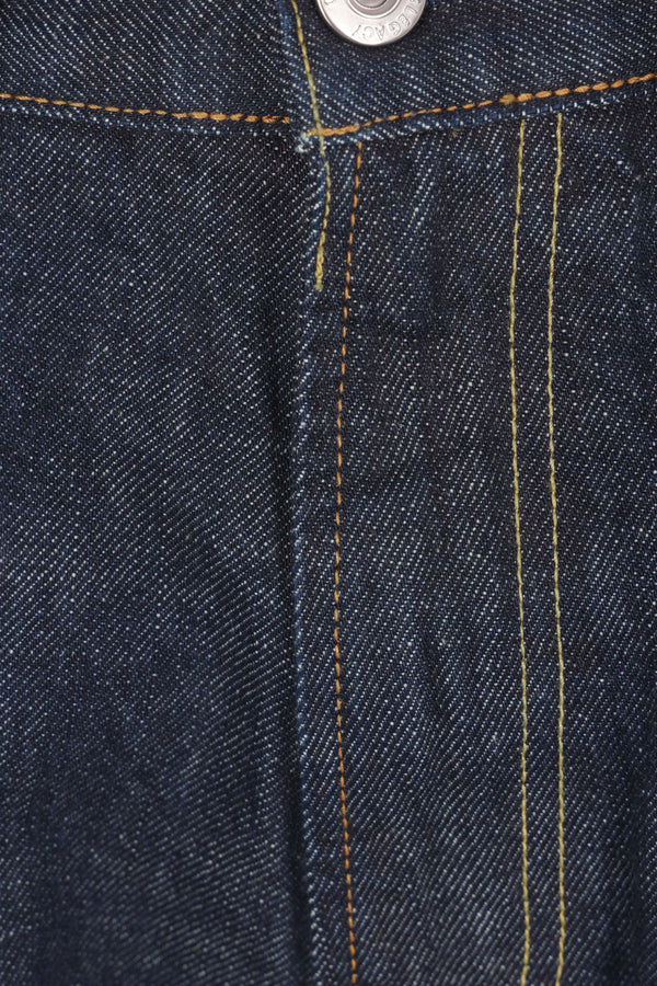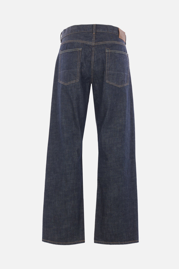 Our Legacy relaxed-fit jeans made from dark blue cotton denim. Features a front closure with metal button and zip, belt loops, five classic pockets, and a leather logo patch on the back.