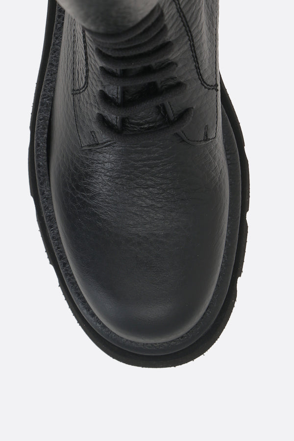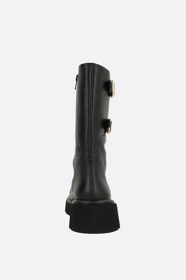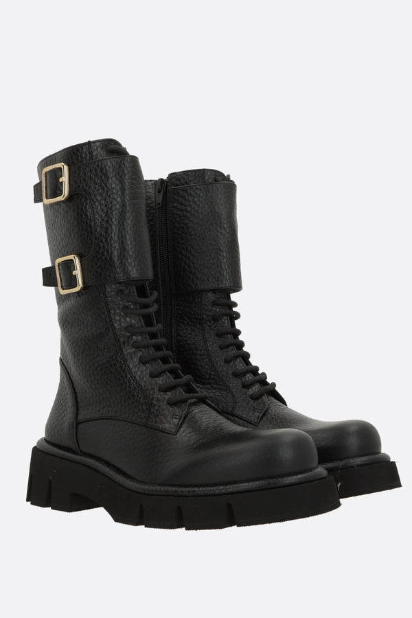 Paloma Barceló combat boot crafted in black grained nappa leather. Featuring a round toe, lace-up front, side zip closure, and adjustable straps with gold-finish metal buckles. Finished with leather lining and a rubber lug sole.