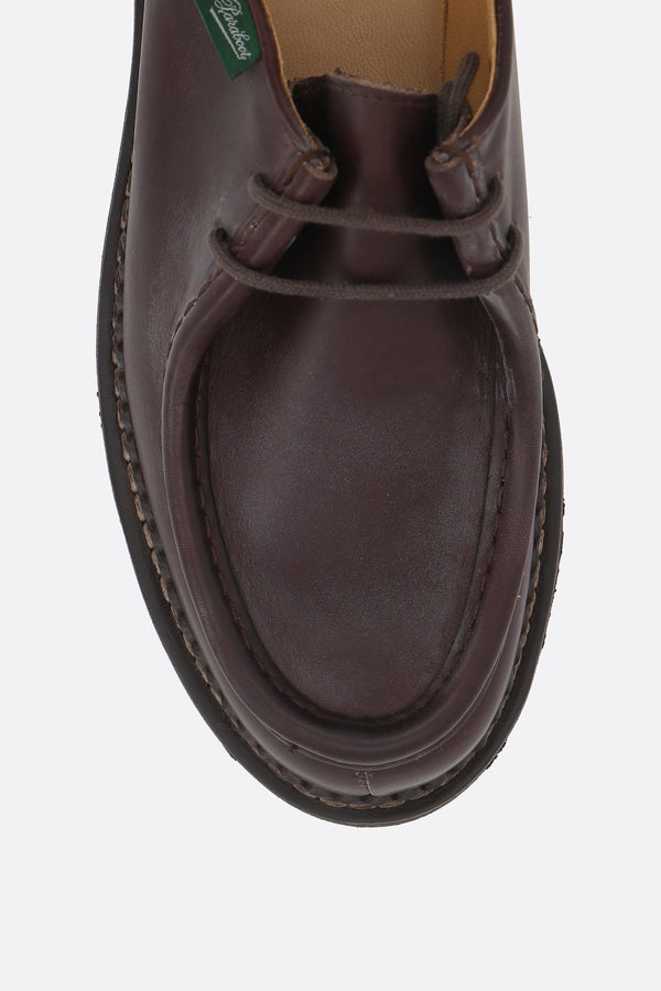 Derby shoe by Paraboot crafted from smooth dark brown leather. Featuring lace-up closure, round toe, leather lining, and rubber sole. The design is completed with the unmistakable logo tag applied on the side.