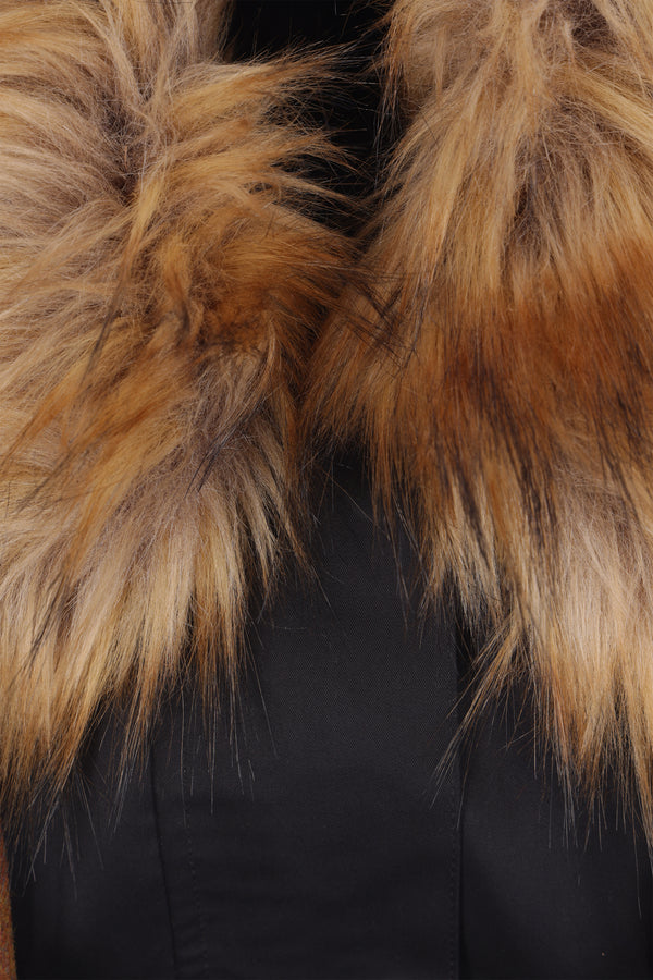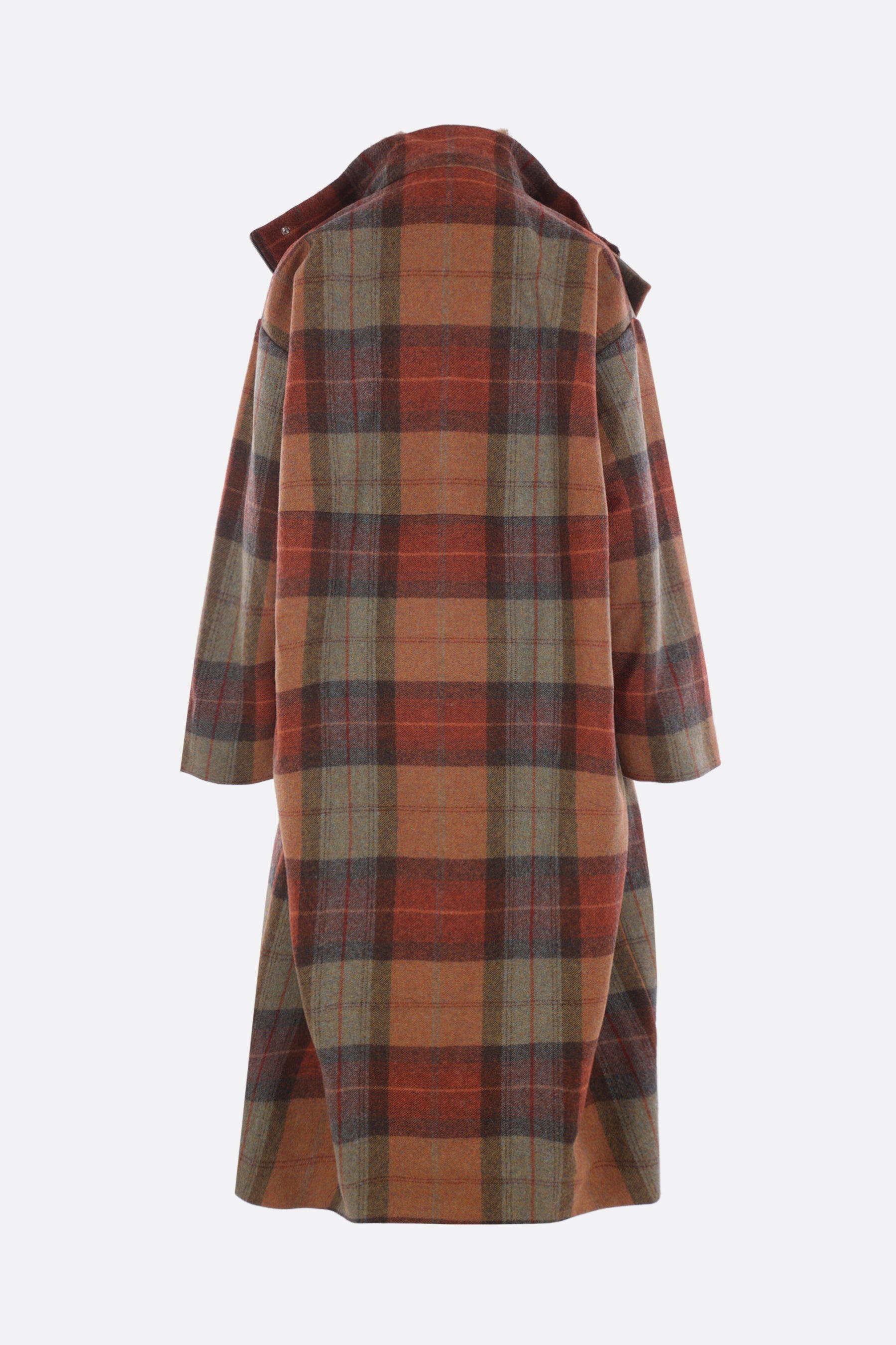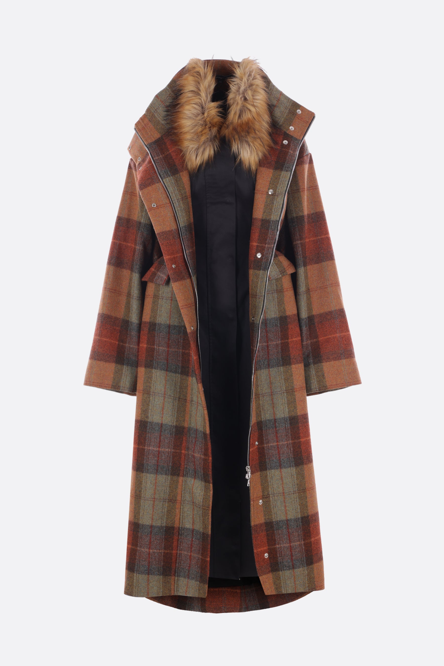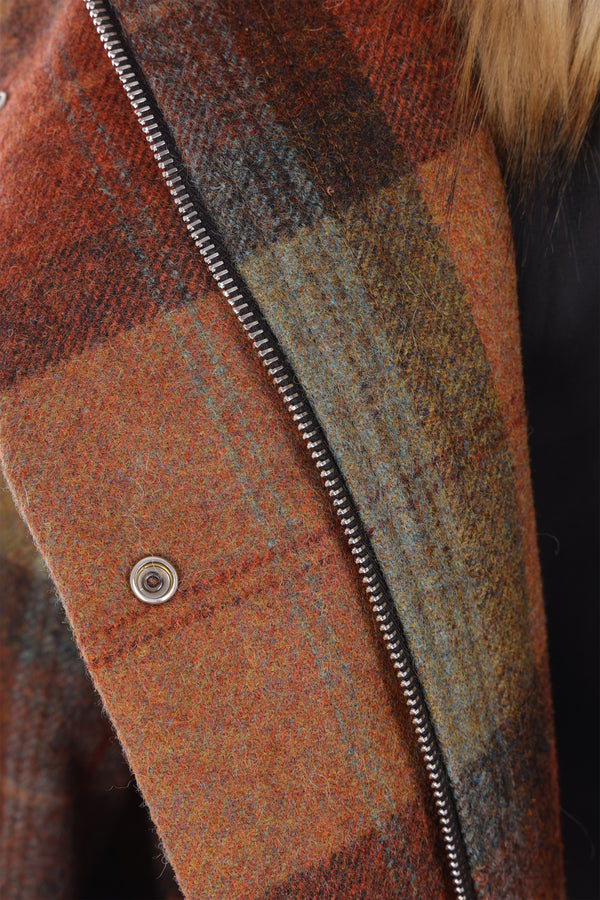 Petra Fagerstrom deconstructed coat crafted from wool check flannel with a front blazer-style black cotton canvas yoke. Featuring a high collar, inner faux-fur collar, double closure with zip and snap buttons, multiple pockets, long sleeves, and an internal adjustable elasticated band.