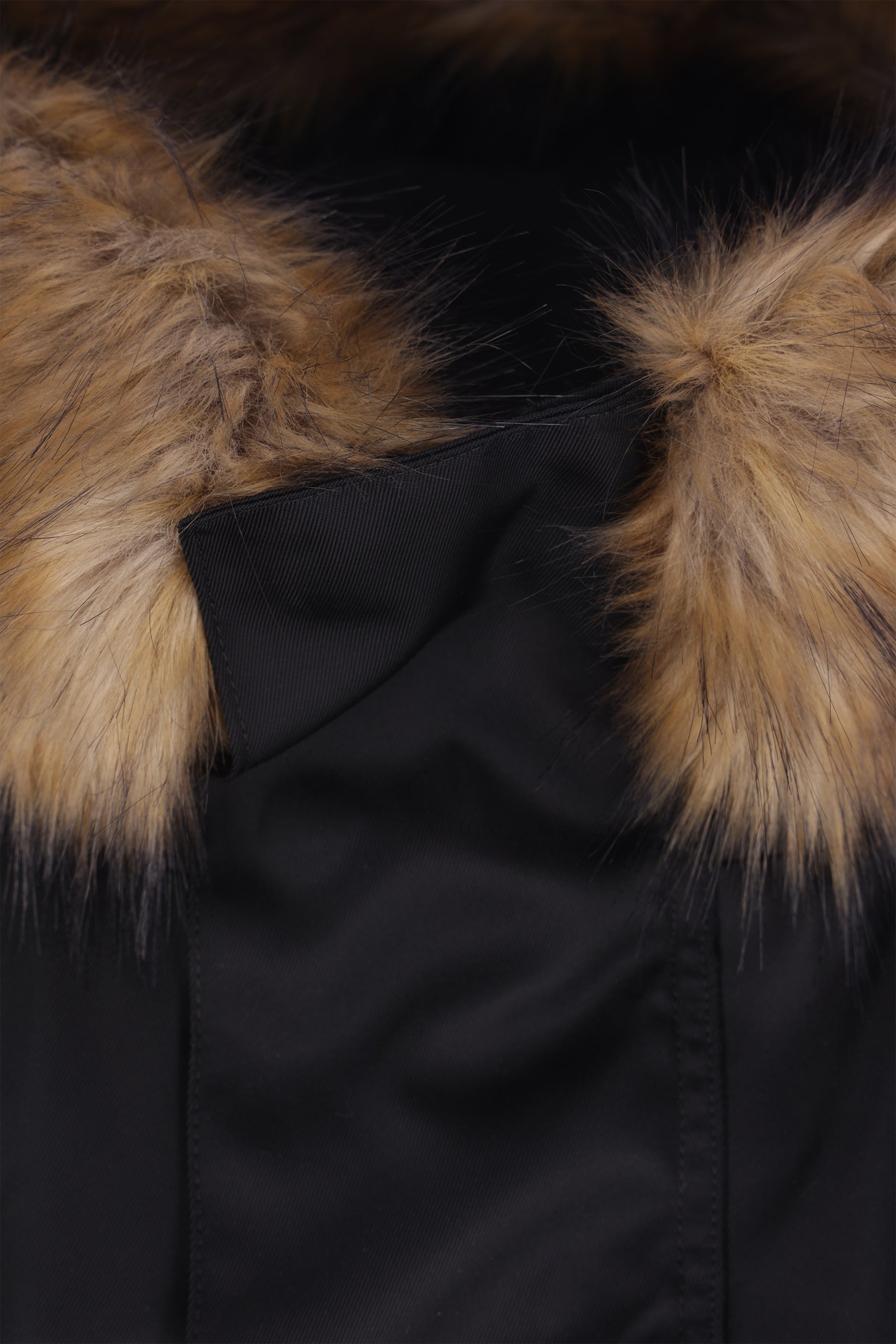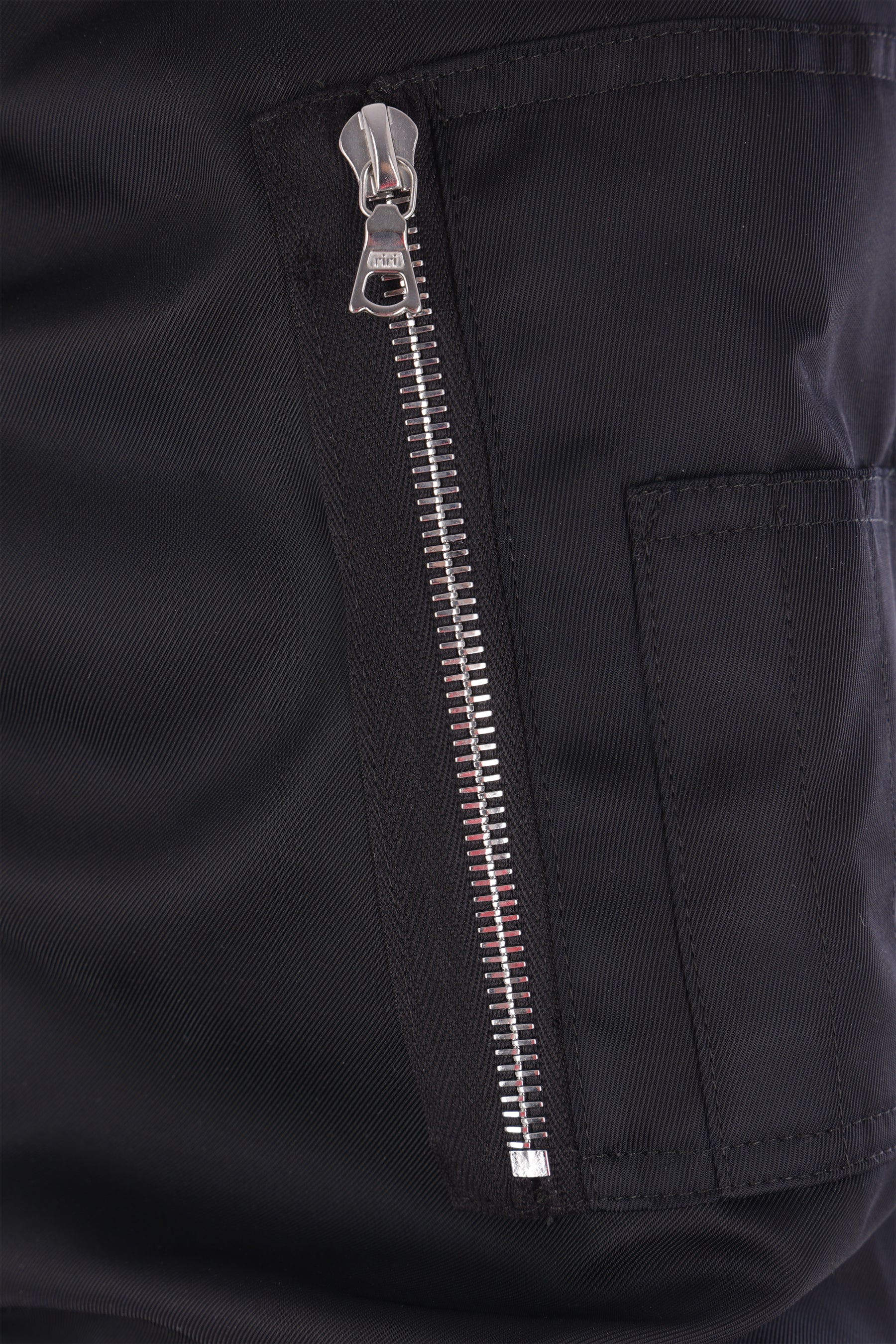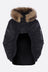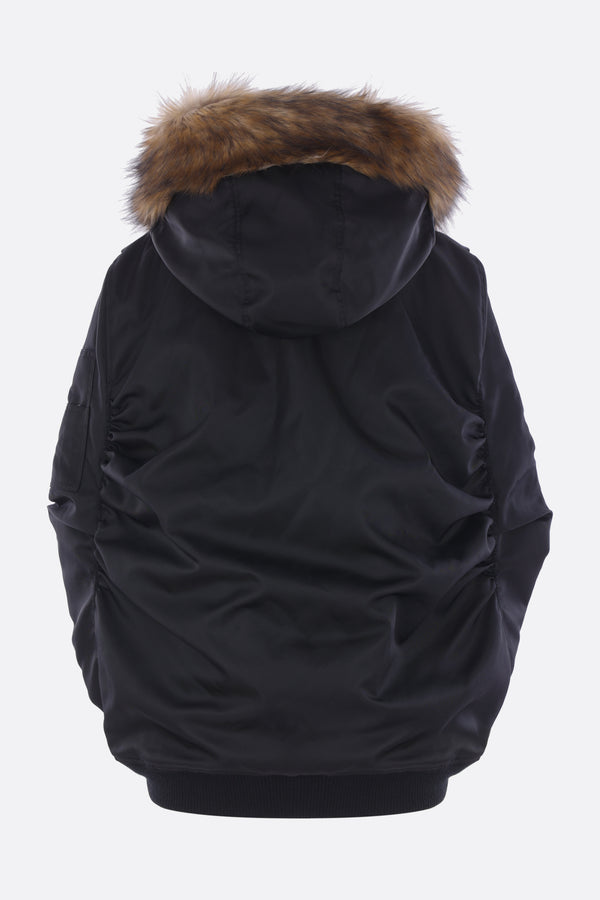 Cape bomber by Petra Fagerstrom made of black nylon. Featuring a high collar with faux fur trim, double zip and snap button closure, side zip pocket, sleeve openings, and ribbed edges. Quilted lining.