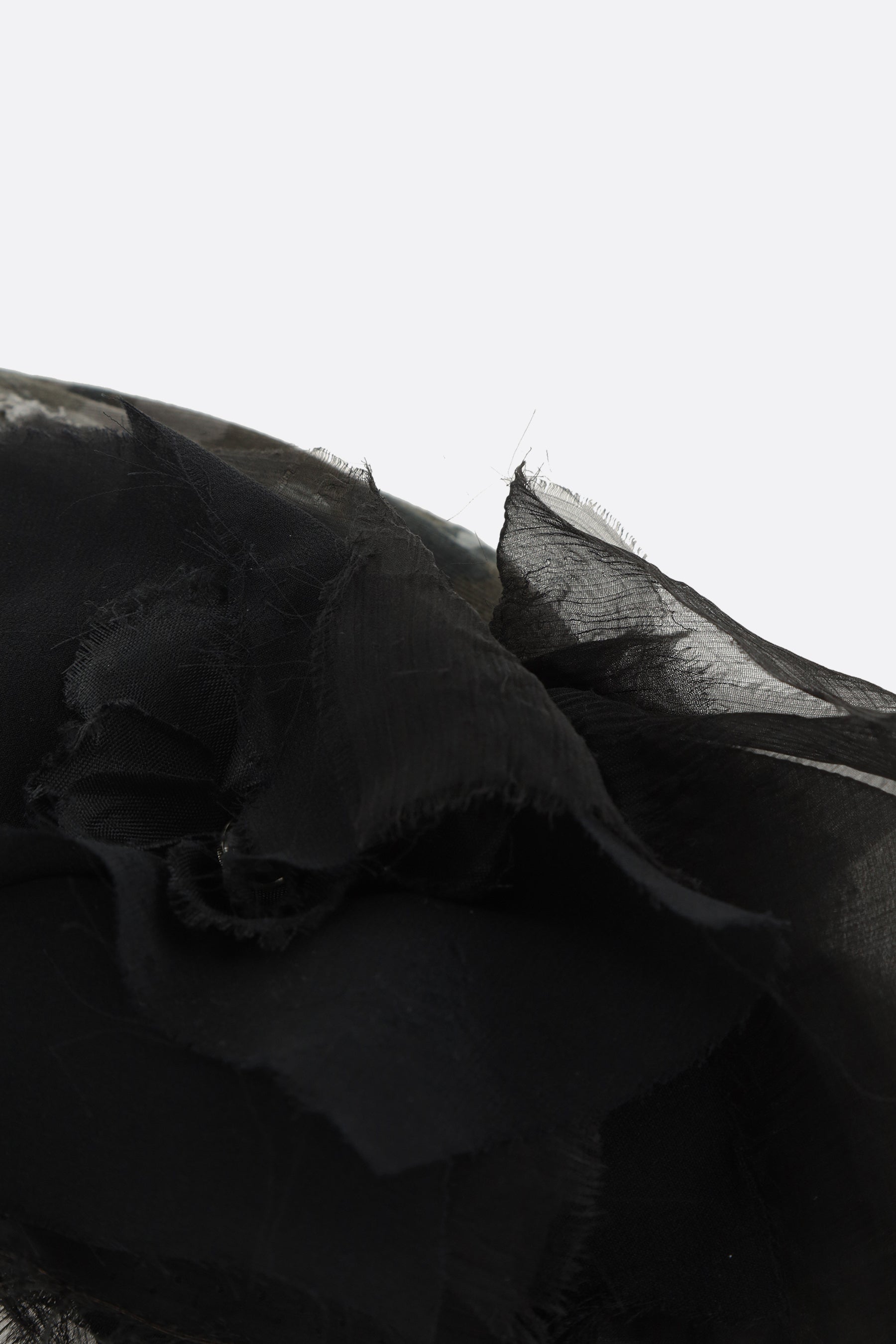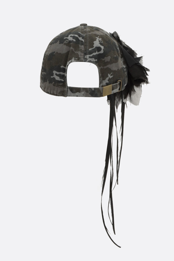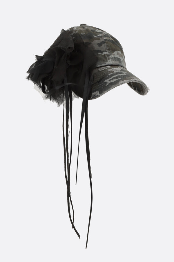 Baseball cap by Petra Fagerstrom crafted in distressed-effect camouflage gabardine with 3D flower embellishment. Featuring an adjustable back closure and unlined interior.