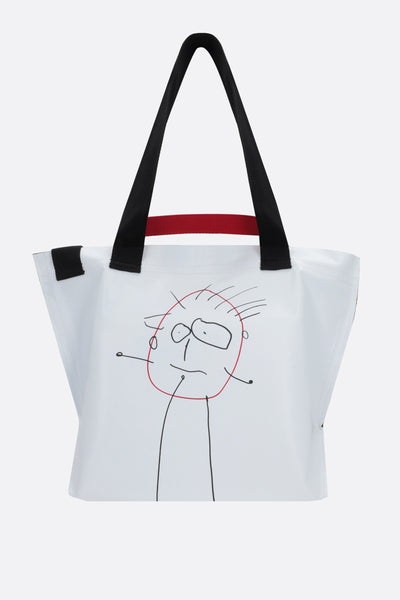 Plan C shopping bag crafted in black coated canvas with contrasting Pili e Bianca print. It features silver-tone hardware, zip fastening, short handles, long handles and adjustable shoulder strap. Brown canvas-lined interior with zip pocket.