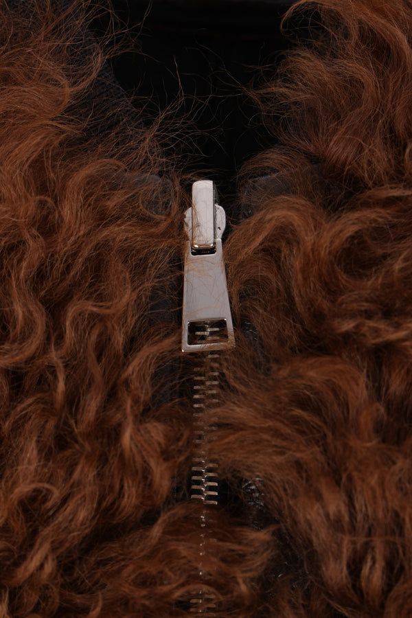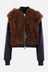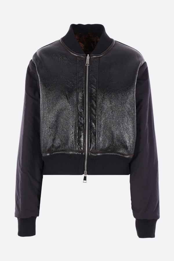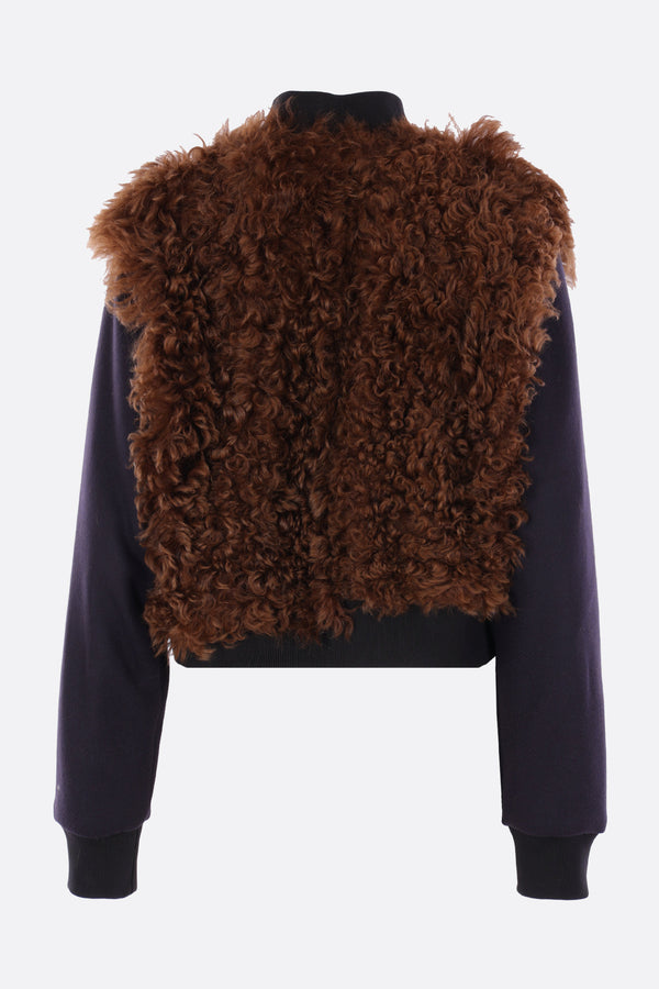 Plan C cropped padded jacket with reversible design, made of shearling with wool sleeves and trim. Featuring a bomber collar, double-slider zip closure, front pockets, straight hem, and ribbed edges. Partially lined.