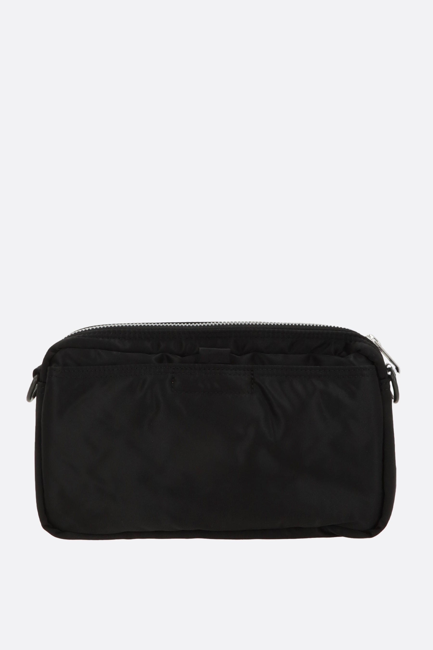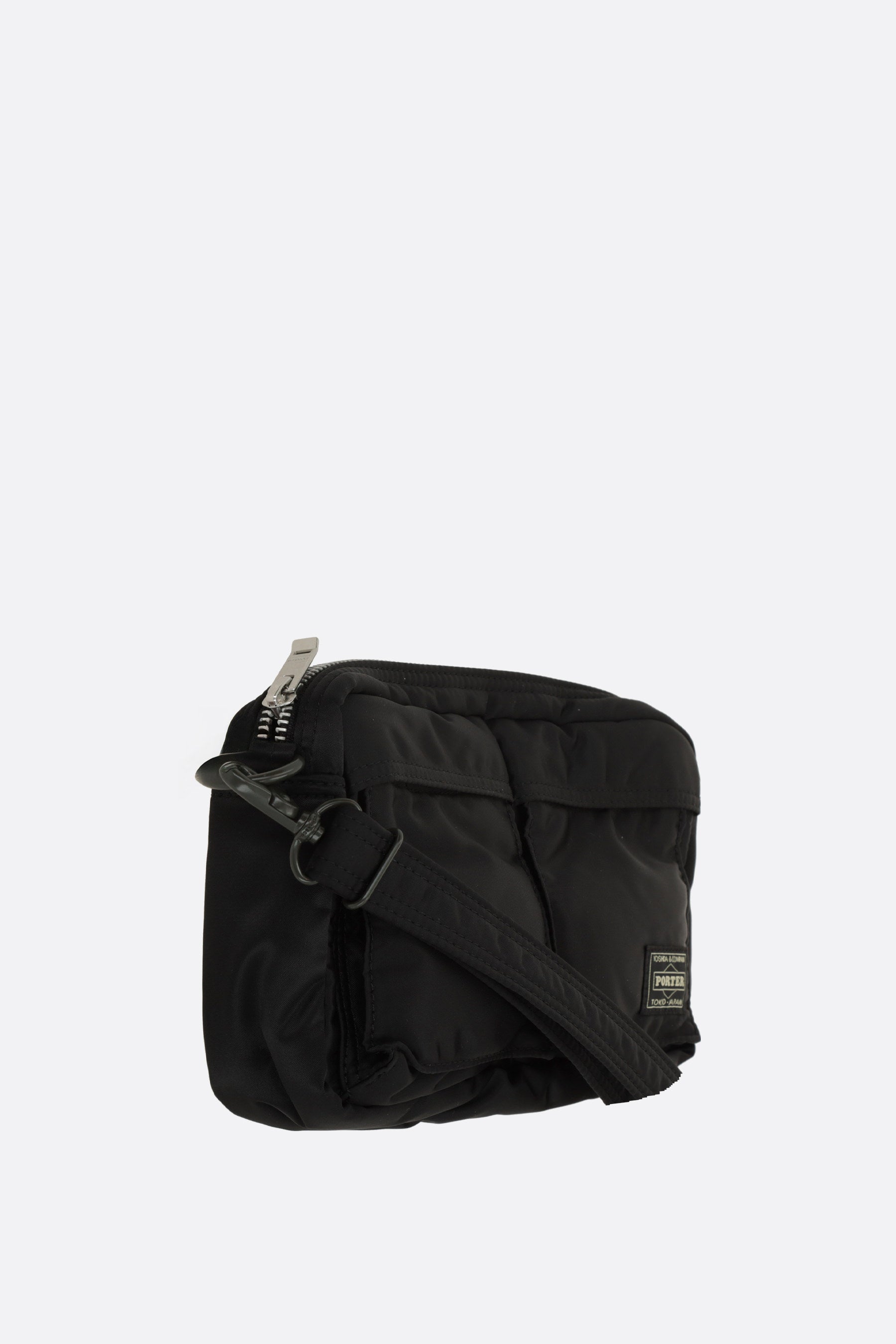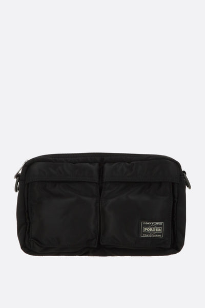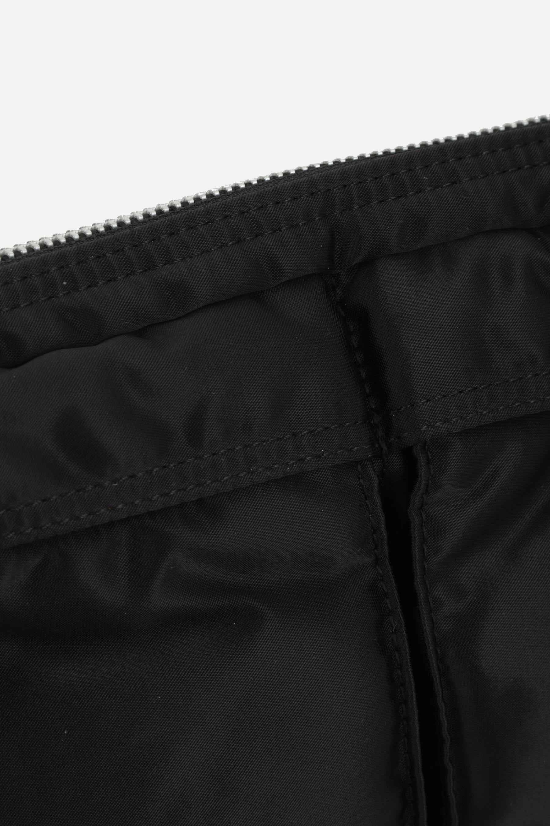 Shoulder bag by Porter Yoshida & Co, crafted in black nylon with a front logo patch. Featuring grey-tone hardware, zip closure, and an adjustable/removable shoulder strap. The interior, lined in orange and black nylon, includes a flat pocket. The design is completed with two front pockets and a flat pocket on the back.