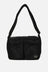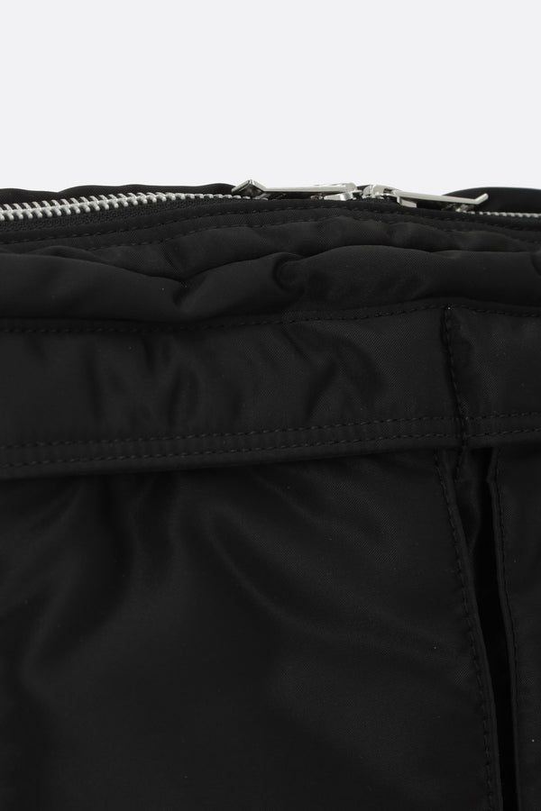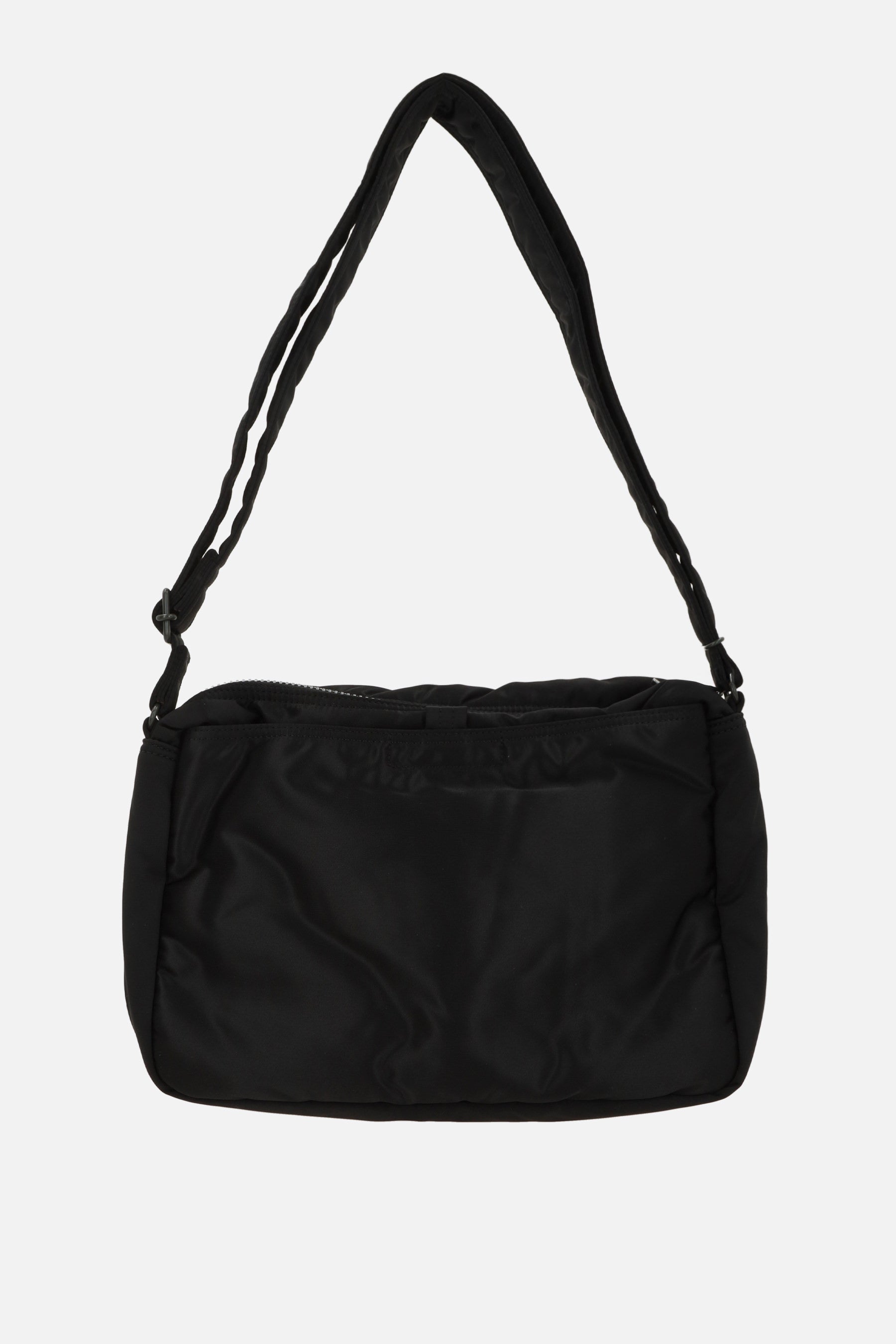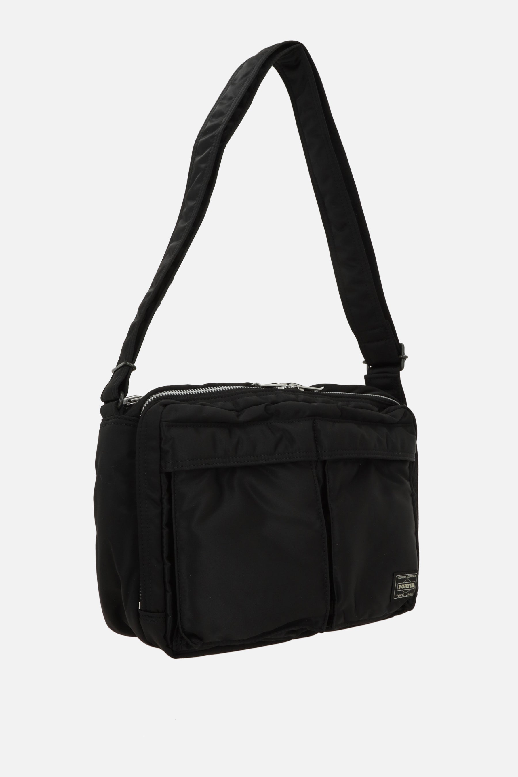 Shoulder bag by Porter Yoshida & Co, crafted in black nylon with a front logo patch. Featuring grey-tone hardware, double compartments, and an adjustable/removable shoulder strap. The interior, lined in orange and black nylon, includes multiple pockets. The design is completed with two front pockets and a flat pocket on the back.