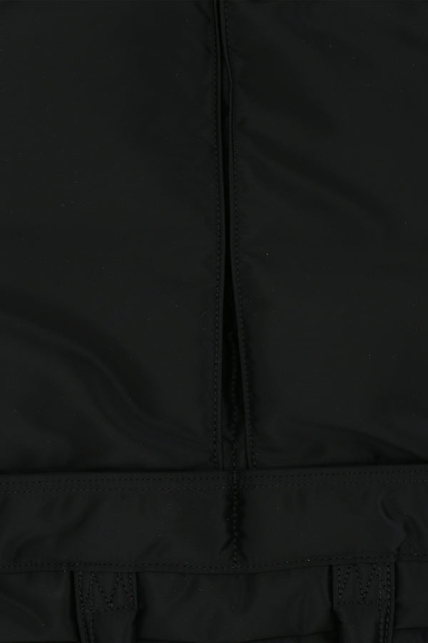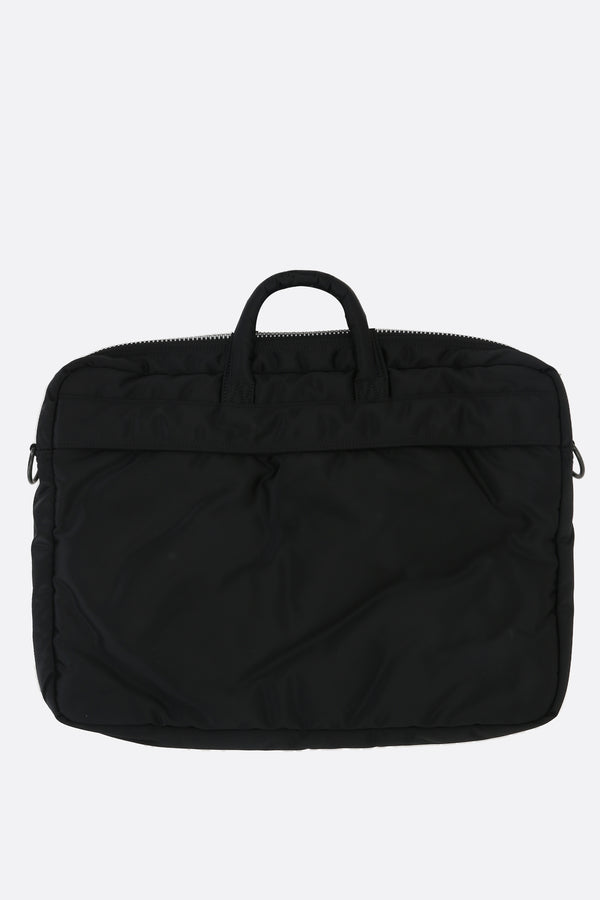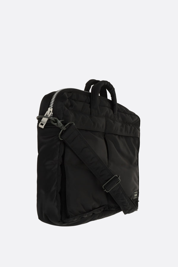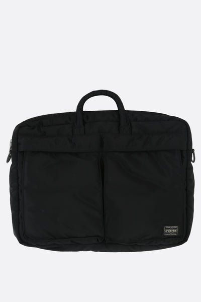 Porter Yoshida & Co business bag crafted from black nylon twill with front logo patch. Featuring silver-tone hardware, zip closure, double handles, and adjustable/removable crossbody strap. The orange nylon-lined interior includes multiple pockets. The design is completed by three exterior pockets.