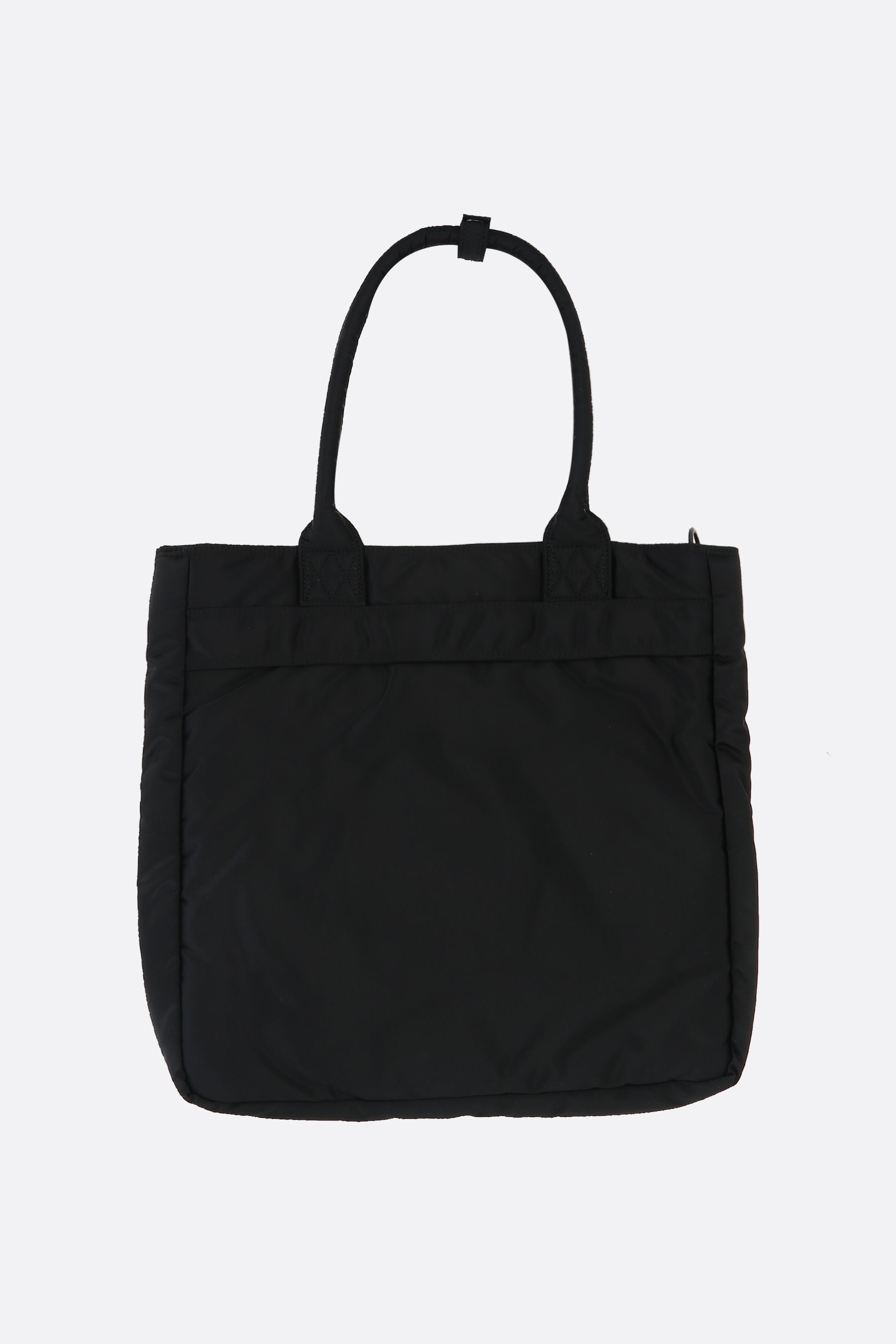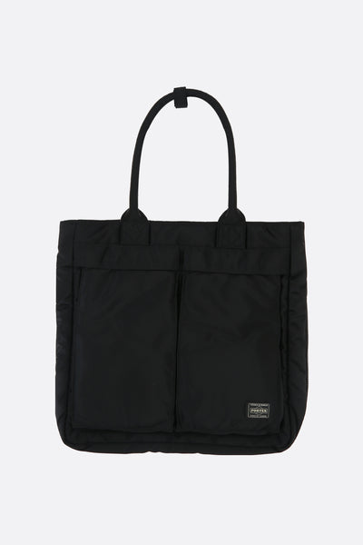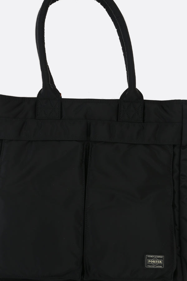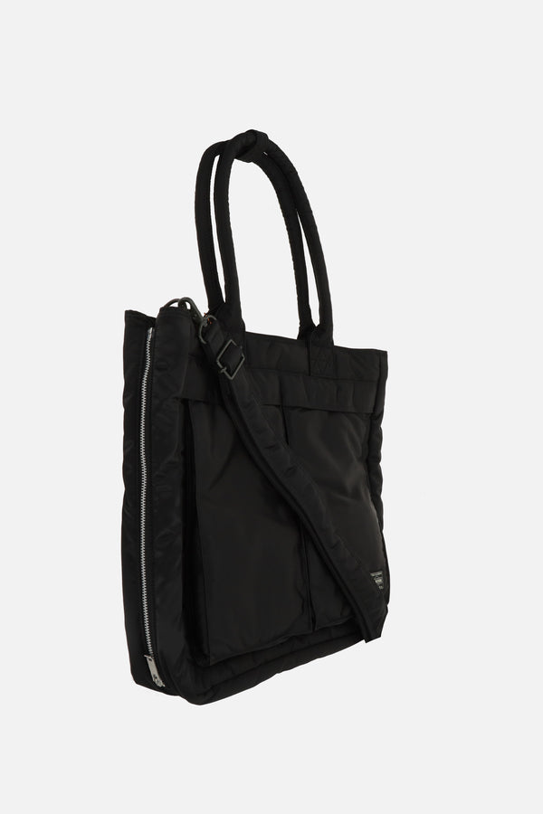 Tote bag by Porter Yoshida & Co, crafted in black nylon with a front logo patch. Featuring grey-tone hardware, internal snap-button closure, double handles, an adjustable/removable shoulder strap, and side zips to adjust the width. The interior, lined in orange and black nylon, is equipped with multiple pockets. The design is completed with three external pockets.