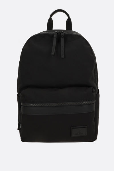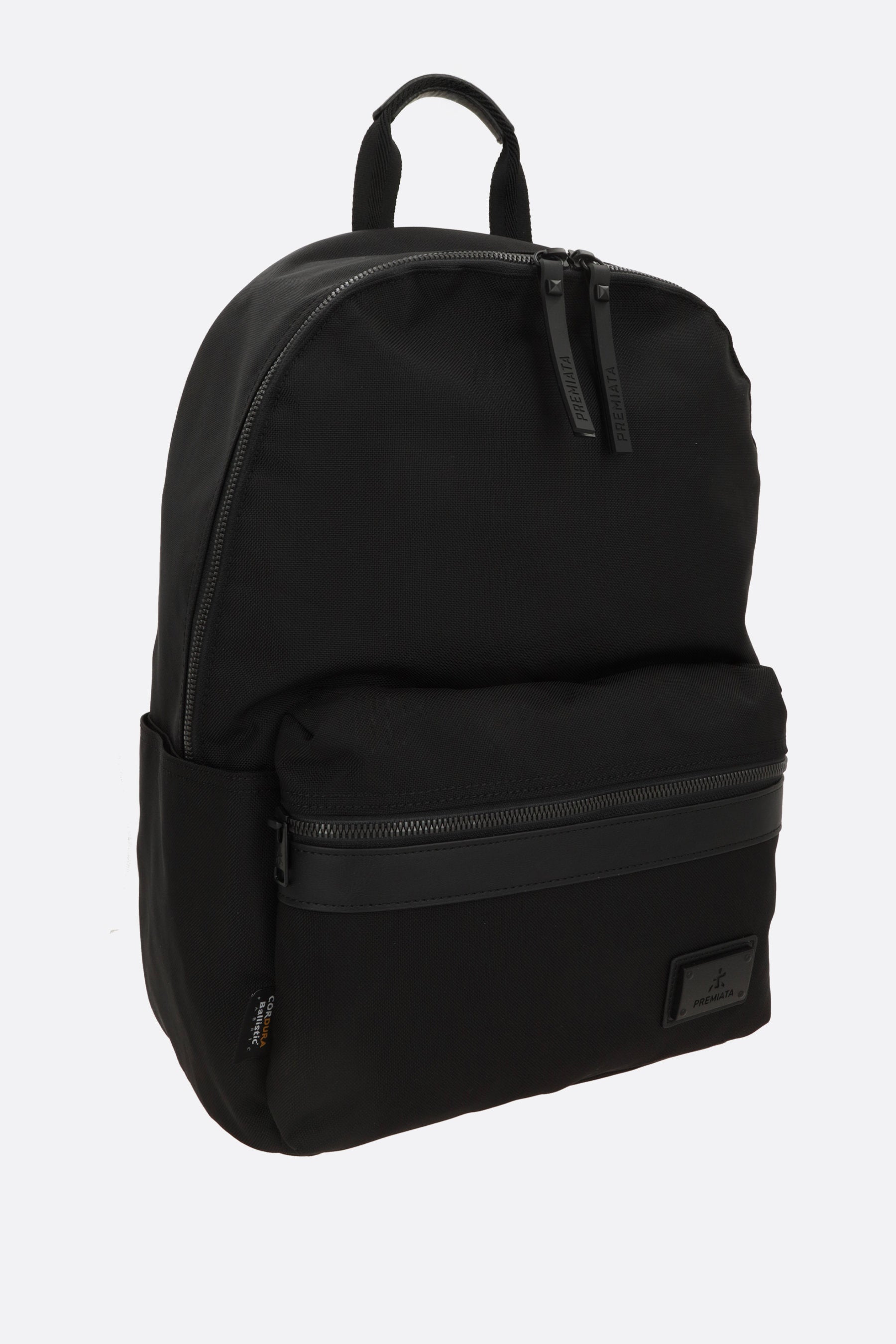 Premiata backpack crafted in black nylon with tone-on-tone leather trims. Featuring black hardware, double-zip closure, top handle, and adjustable shoulder straps. The logo-printed nylon-lined interior includes multiple pockets. The design is completed by exterior pockets and a front-applied logo patch.