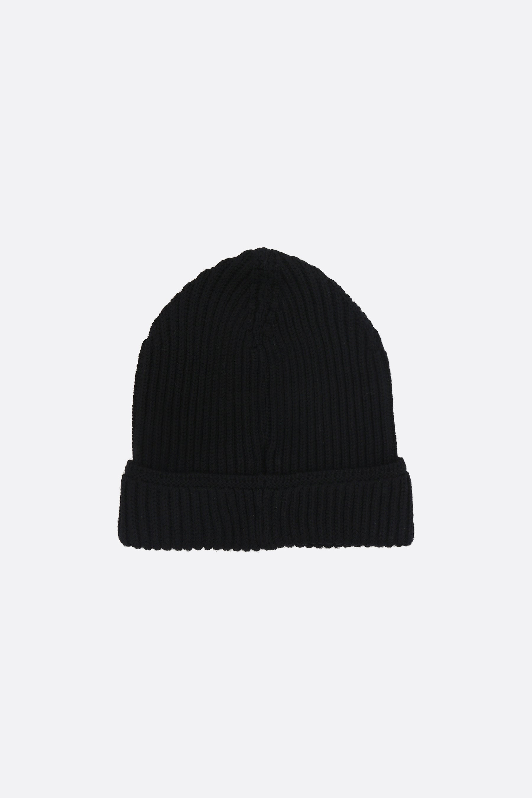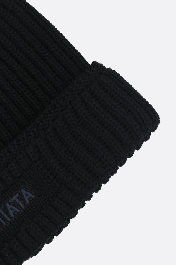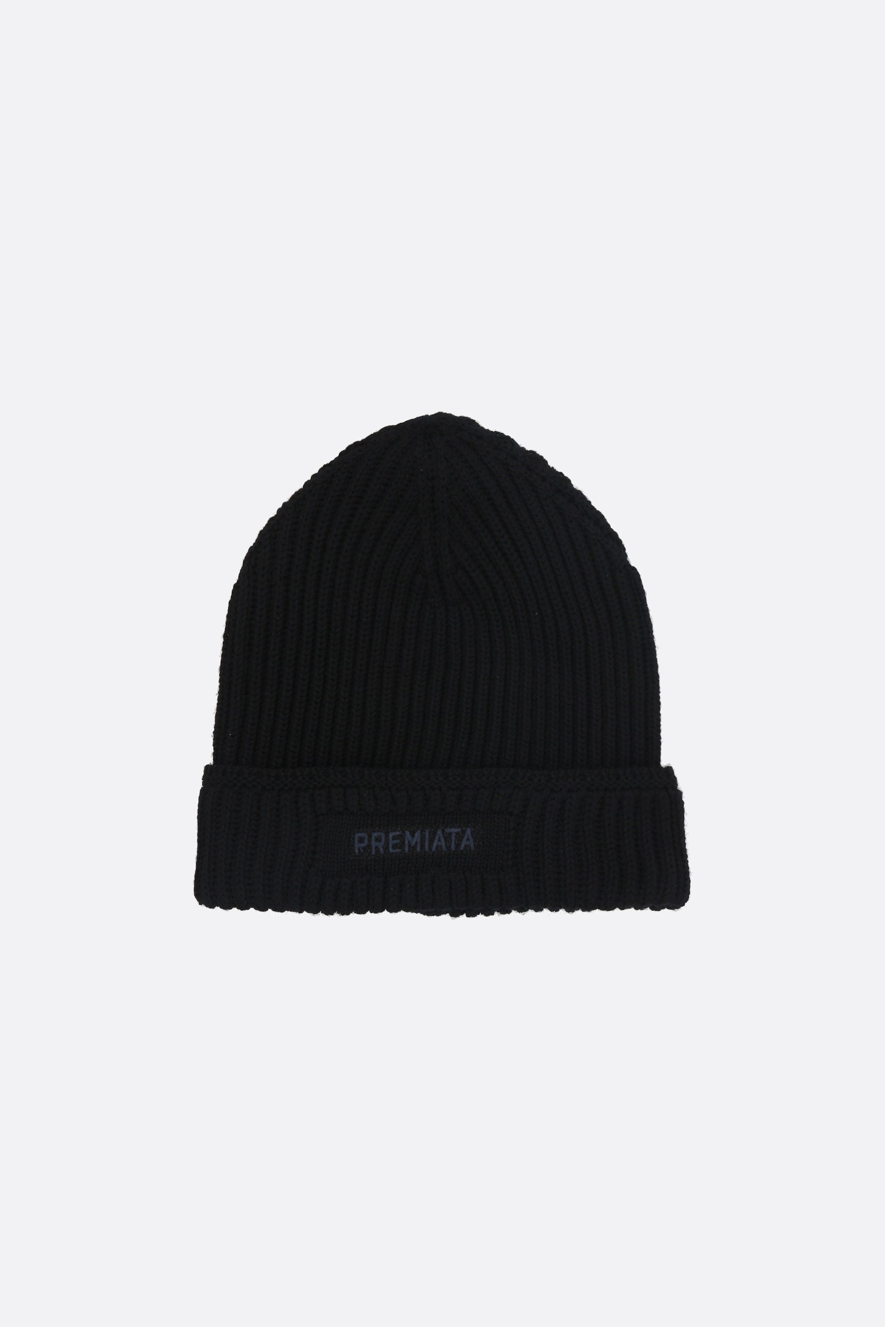 Premiata beanie made of black ribbed wool knit with embroidered logo lettering on the front turn-up.