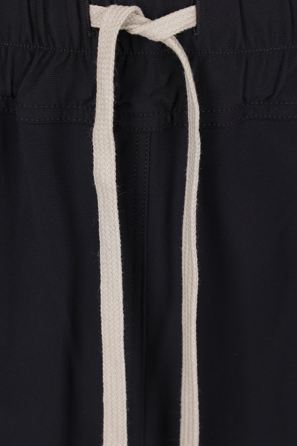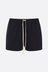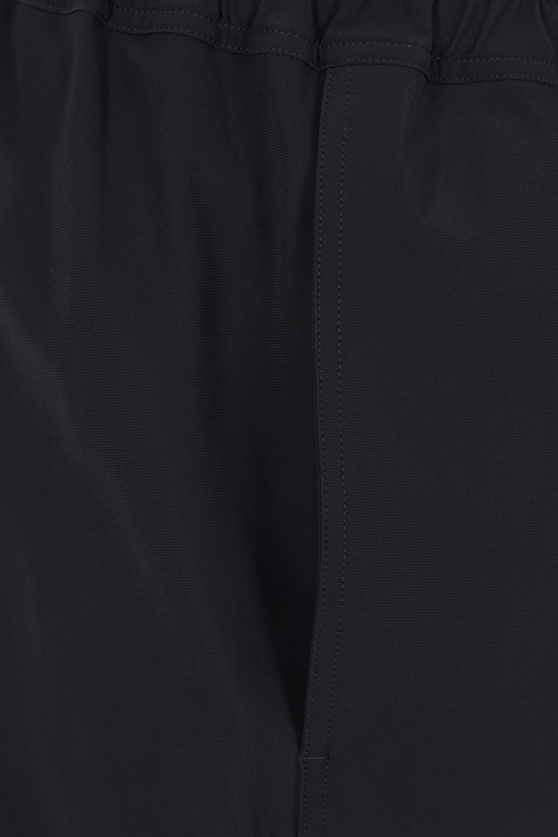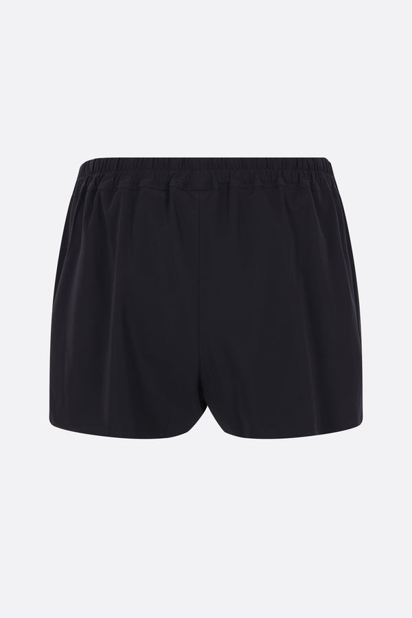 Rick Owens swim shorts crafted from black stretch nylon. Featuring an elasticated waistband with drawstring, hidden side pockets, small side slits, and internal mesh briefs.