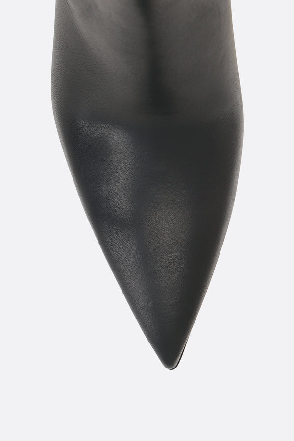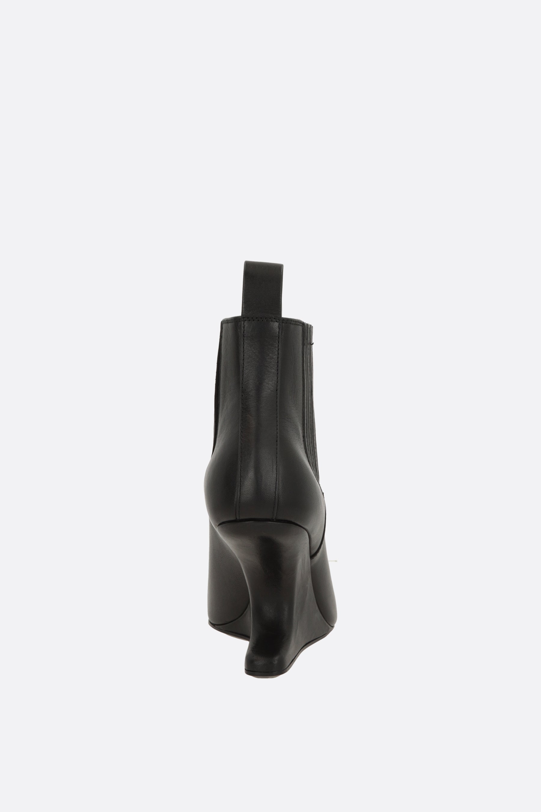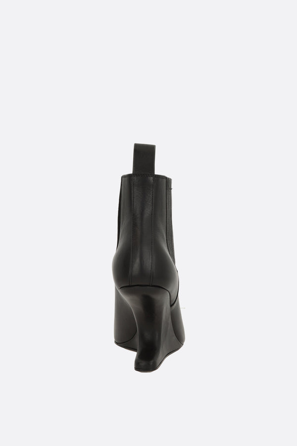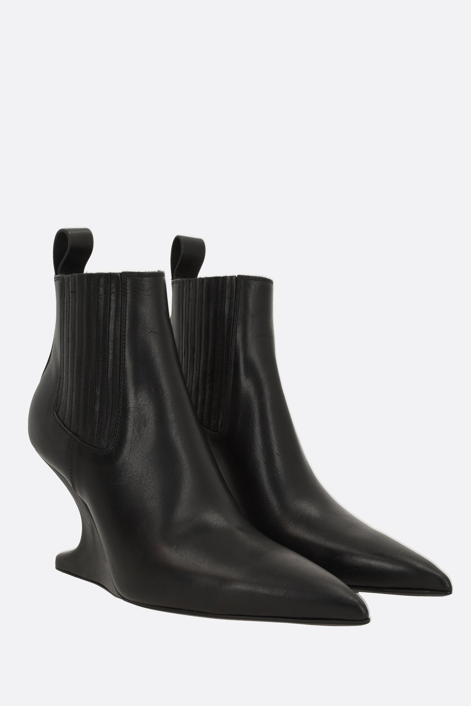 Ankle boot by Rick Owens made of smooth black leather. Featuring elastic side panels, a pointed toe, leather lining, and a leather/rubber sole. Sharped wedge heel covered in leather.