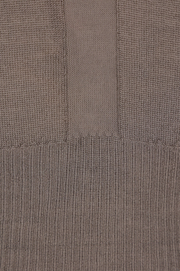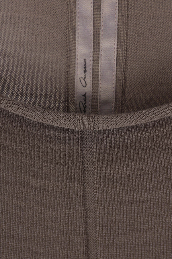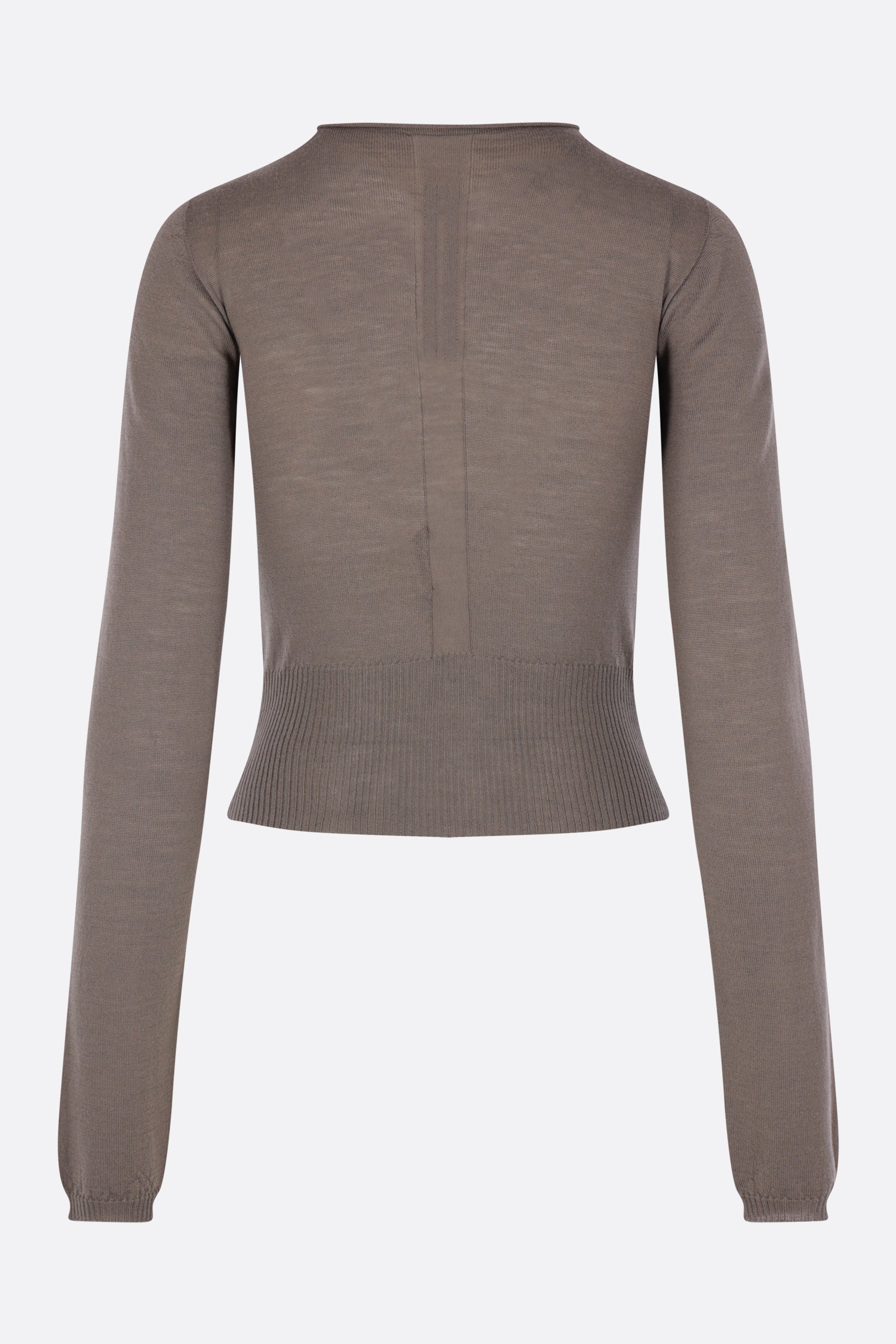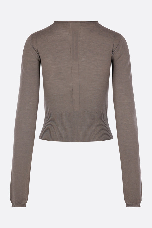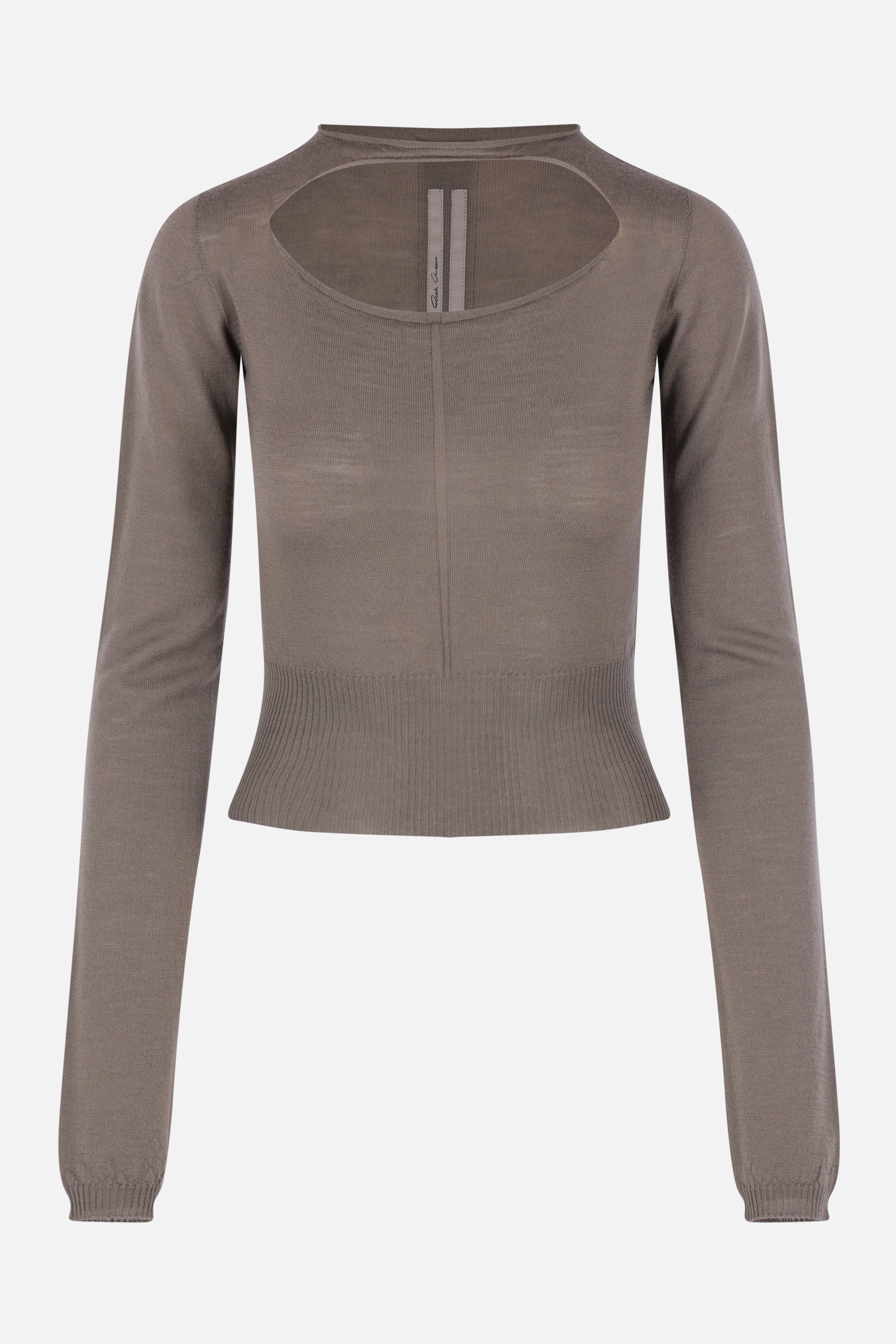Rick Owens cropped sweater crafted from grey wool knit. Featuring a crew neckline, chest cut-out, long sleeves, and ribbed trims.