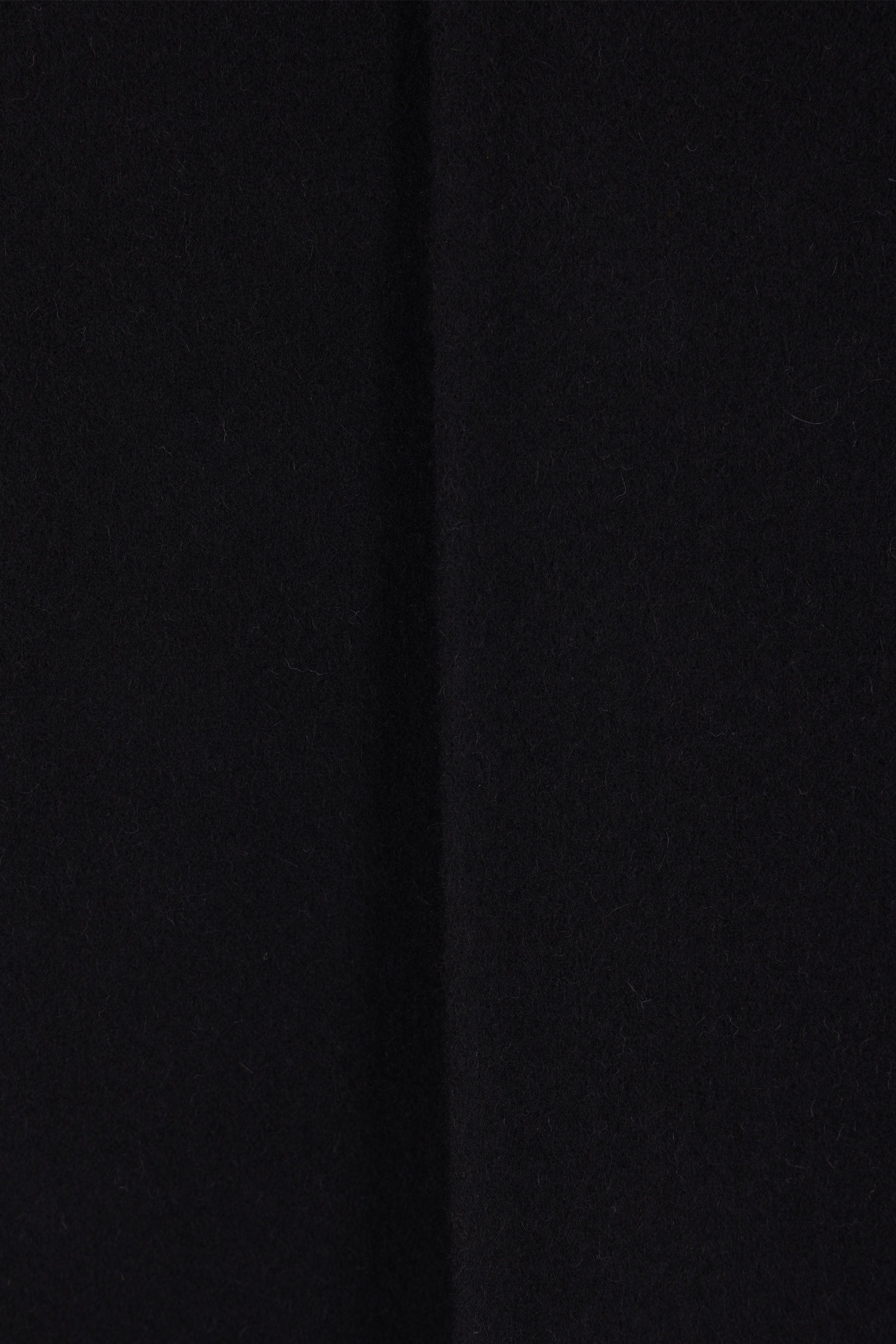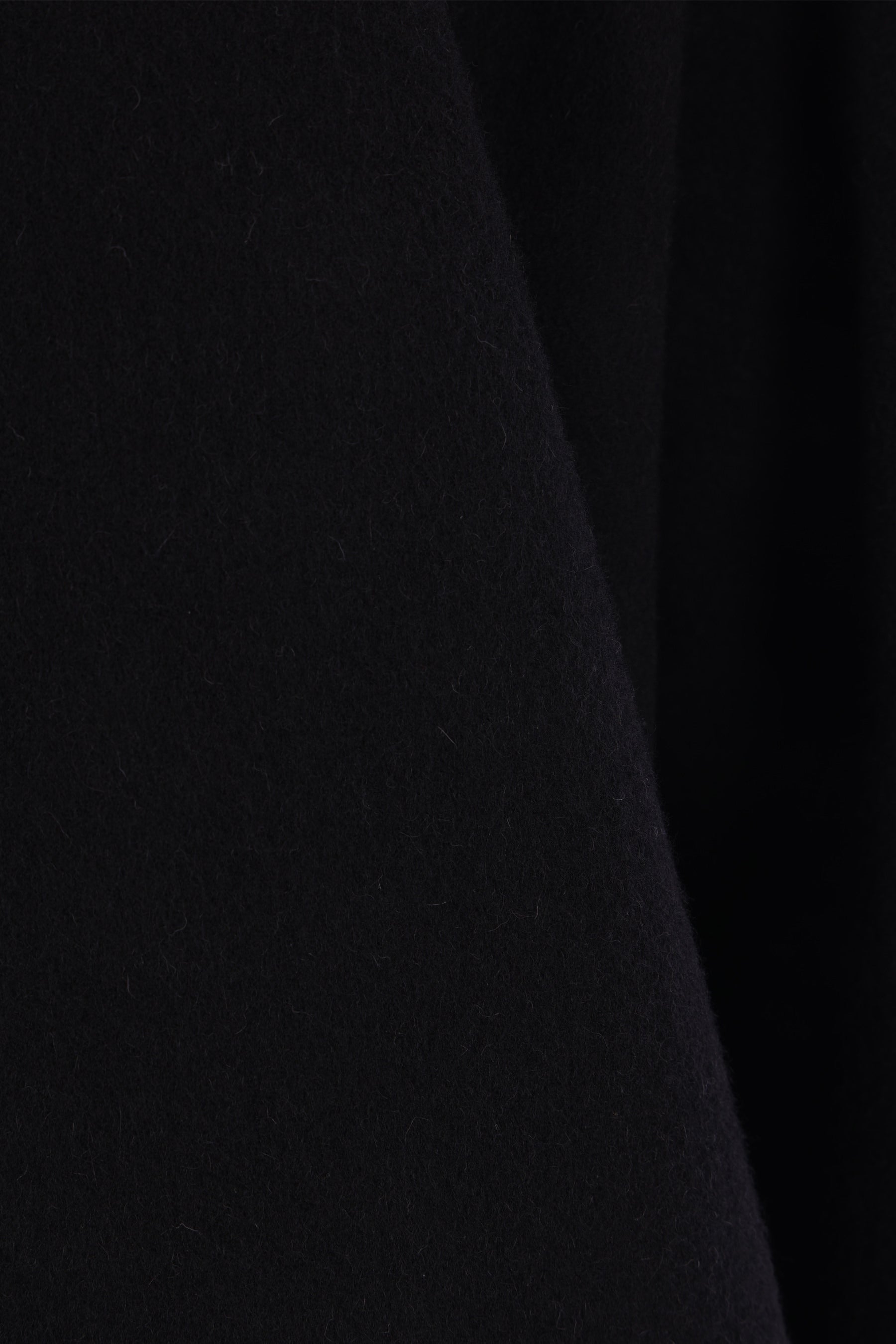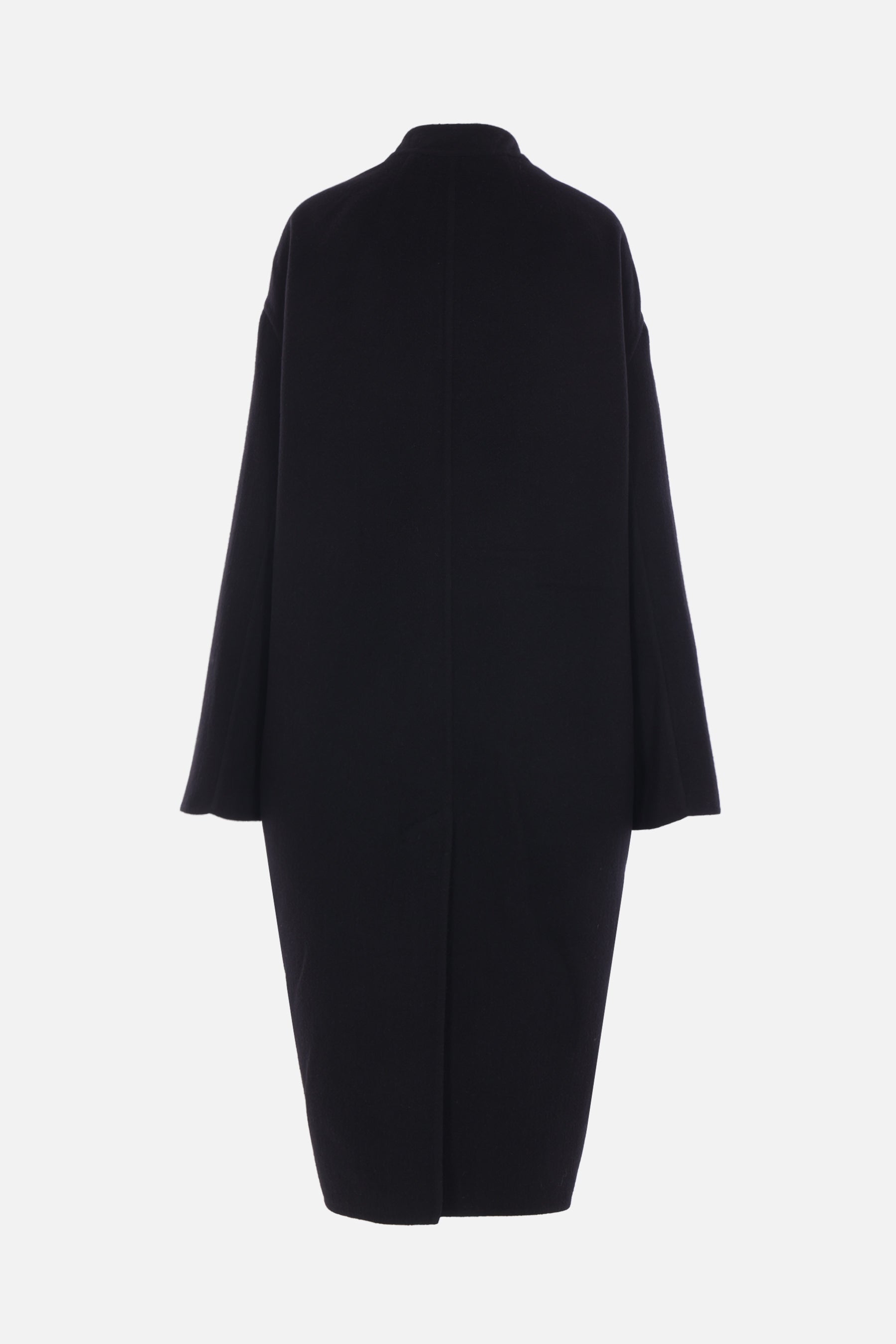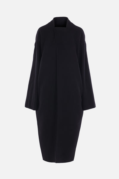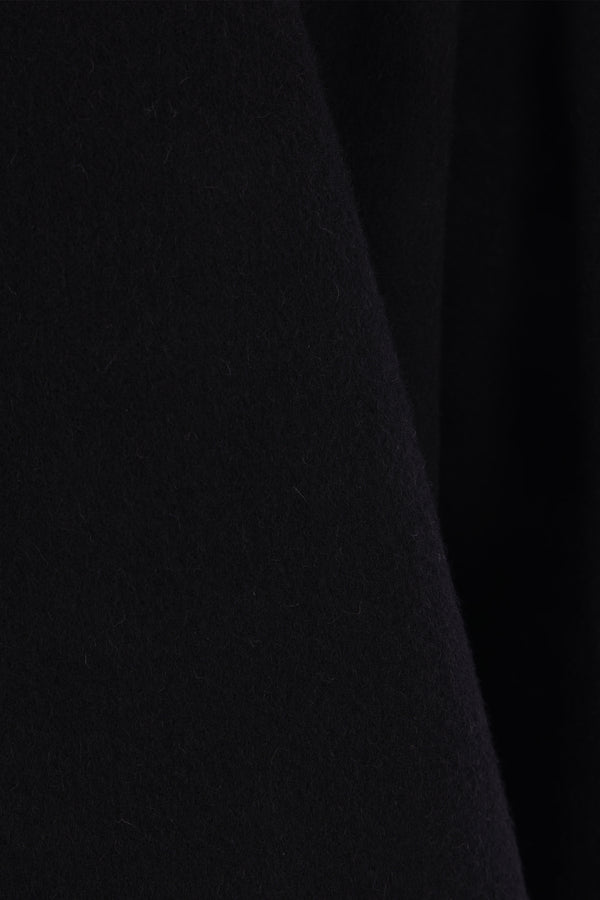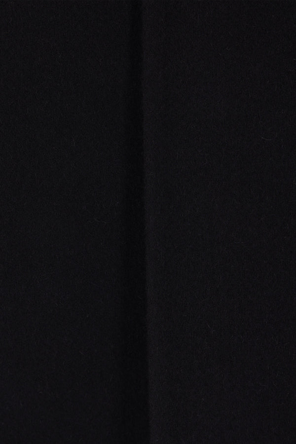Rick Owens coat made of black camel hair and wool felt. Featuring a geometric neckline with snap-button closure, slanted pockets, long sleeves, and a central back vent. Unlined interior.