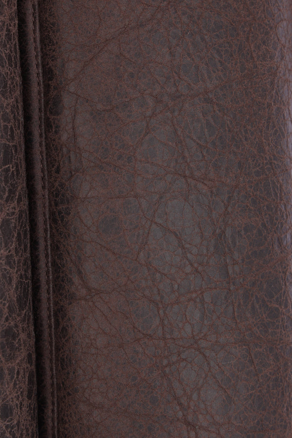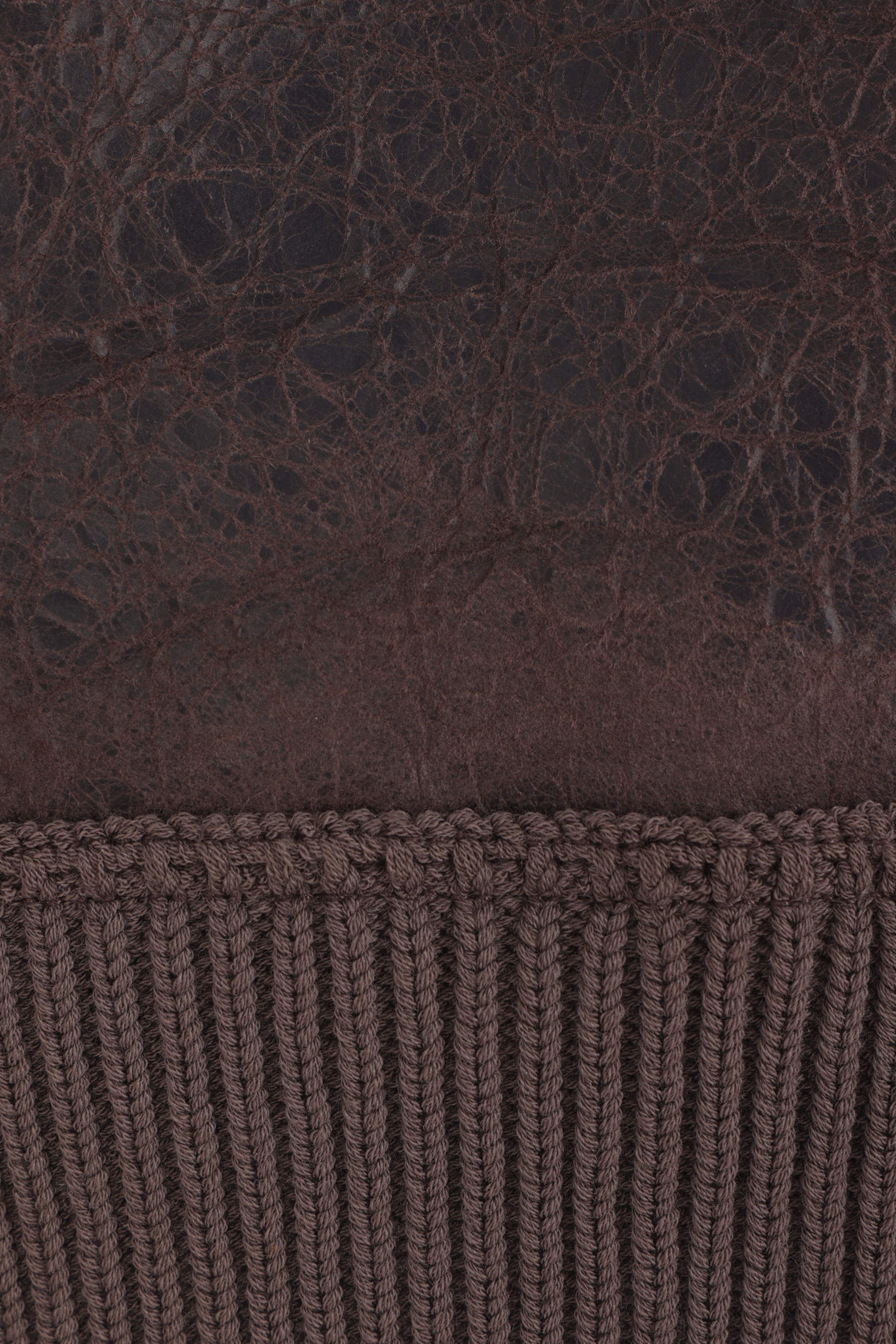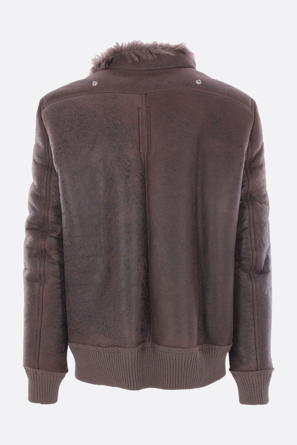 Rick Owens bomber jacket made from brown shearling. Features a high collar, asymmetric zip closure, multiple pockets, long sleeves, and ribbed knit edges.