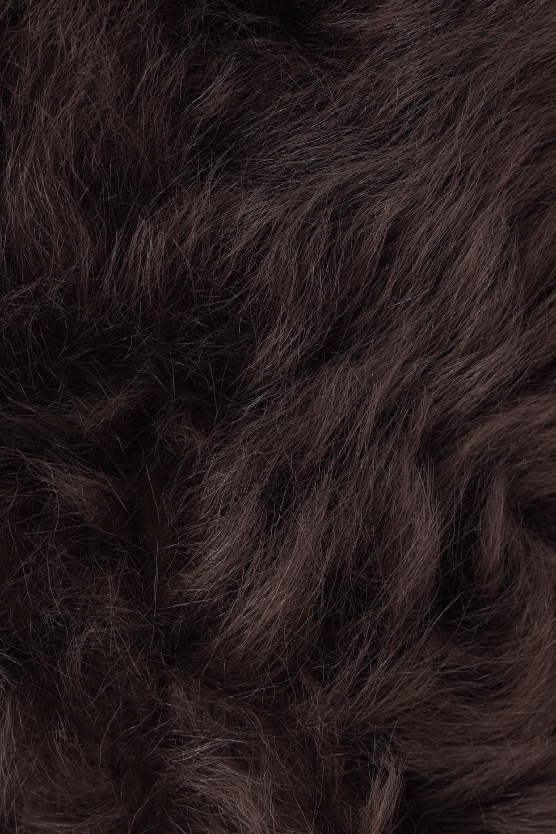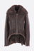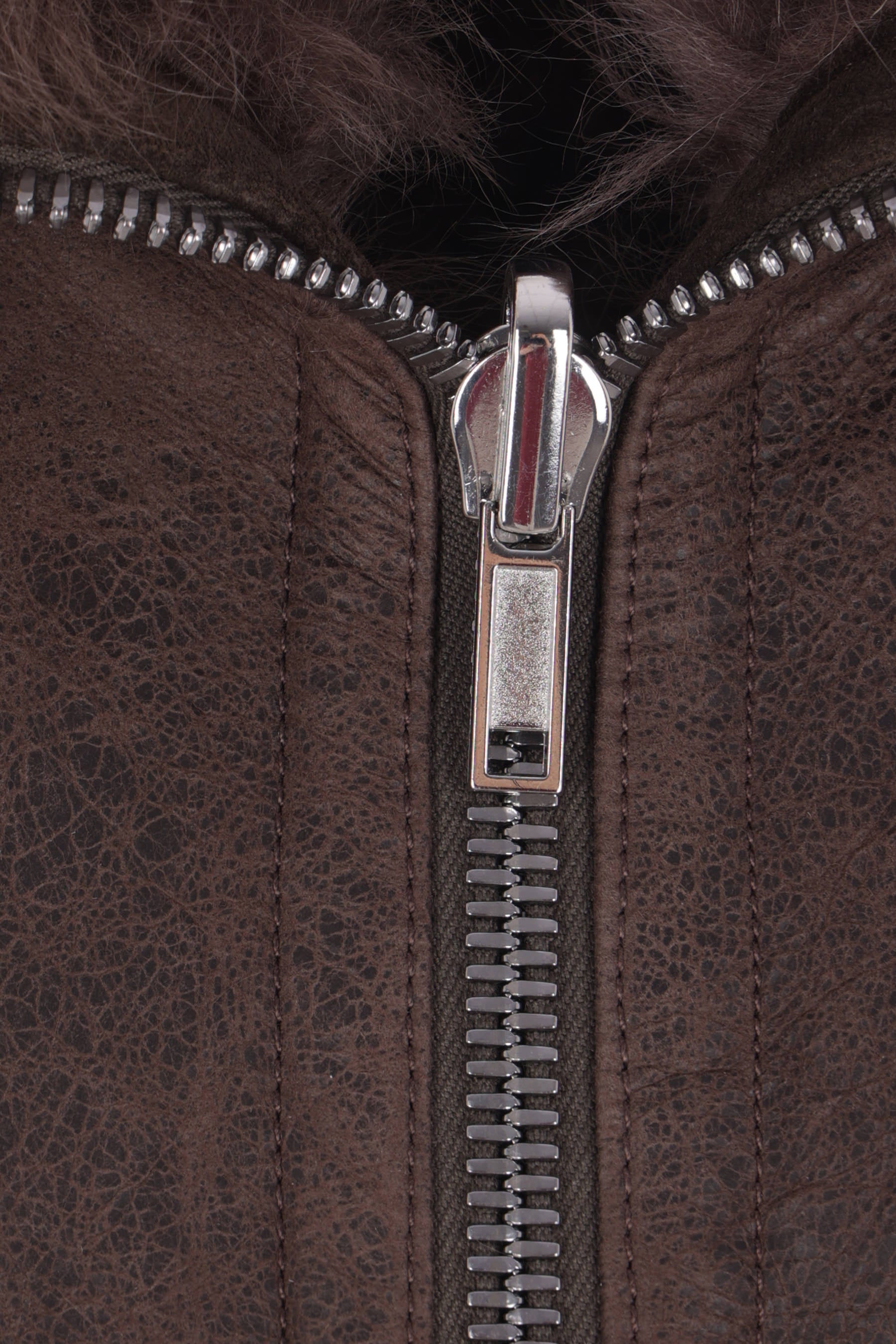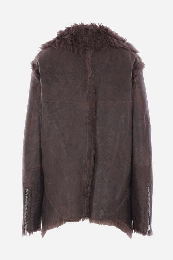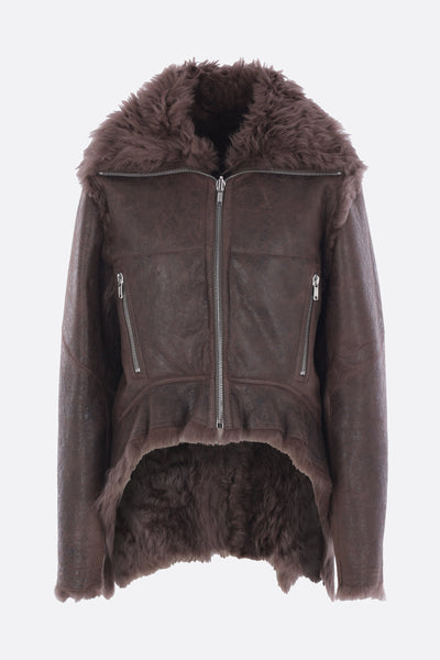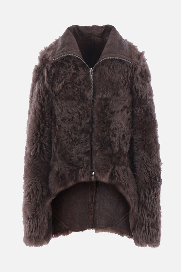 Rick Owens reversible jacket made of brown shearling. Featuring a high collar, front zip closure, side zip pockets, long sleeves with zippered cuffs, and an asymmetrical hem longer at the back.