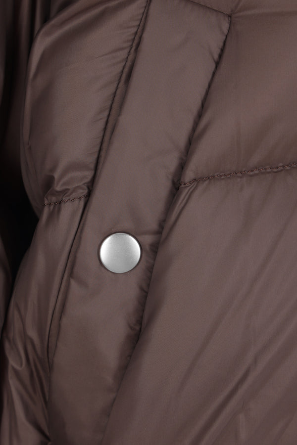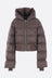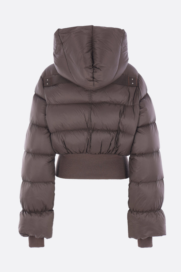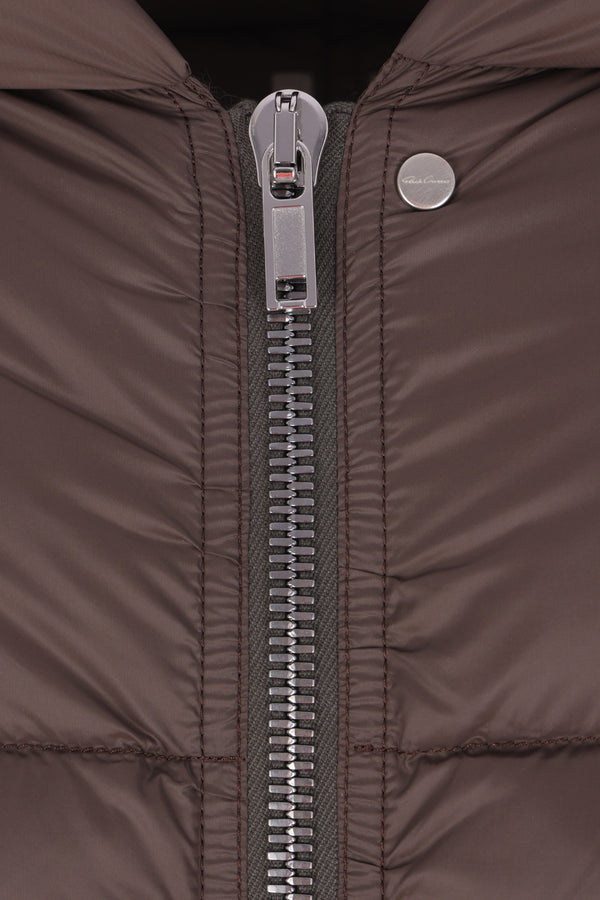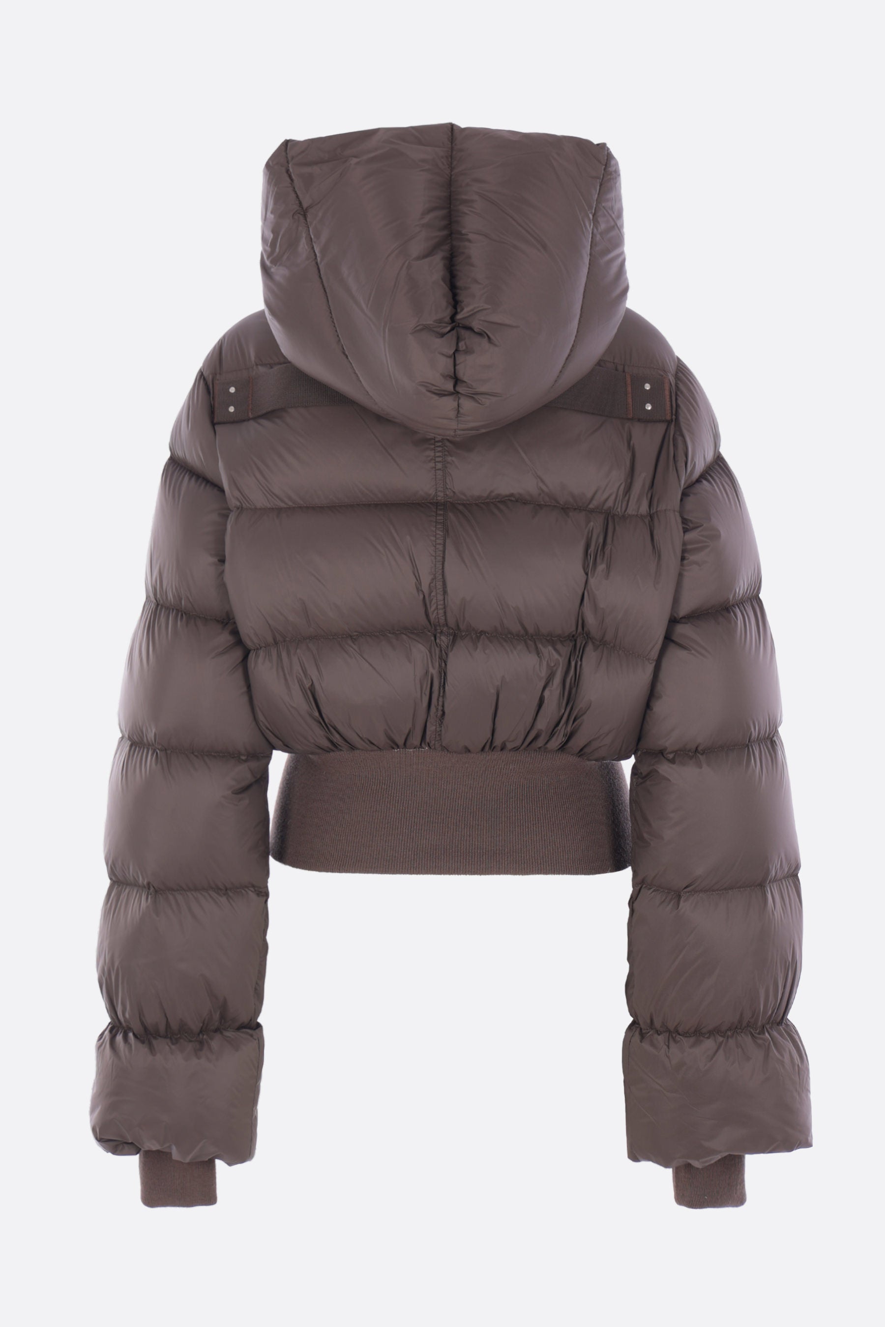 Rick Owens slightly cropped down jacket crafted from brown nylon. Featuring a classic hood, front zip fastening, welt pockets, long sleeves, and ribbed knit trims.