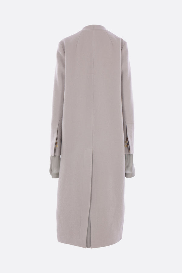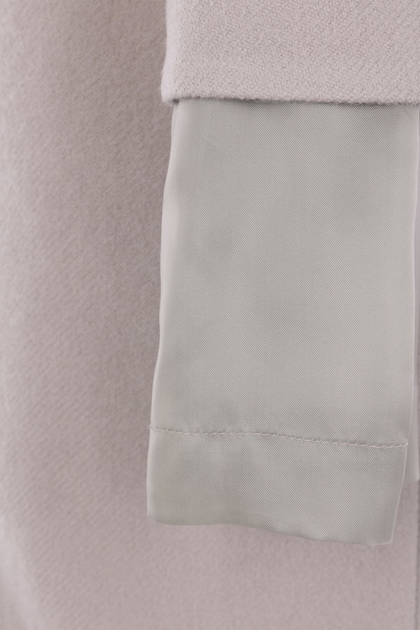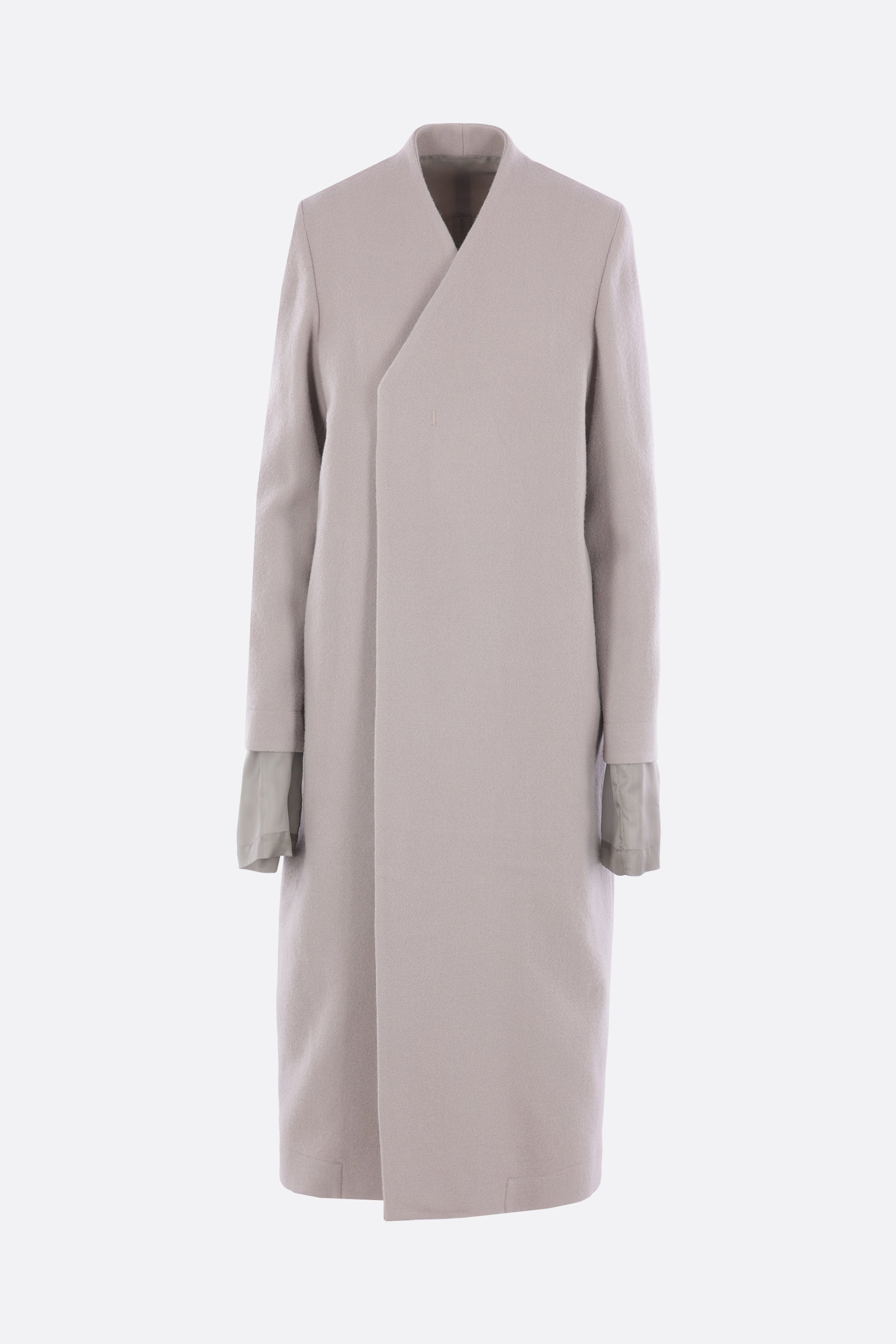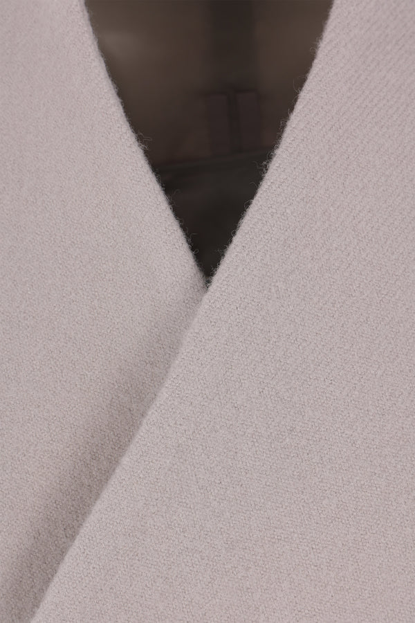 Rick Owens double-breasted coat made of pearl grey wool with exposed twill lining at the cuffs. Featuring a V-neckline, concealed button closure, slanted pockets, long sleeves with buttoned cuffs, a central back vent, and a fully lined interior.