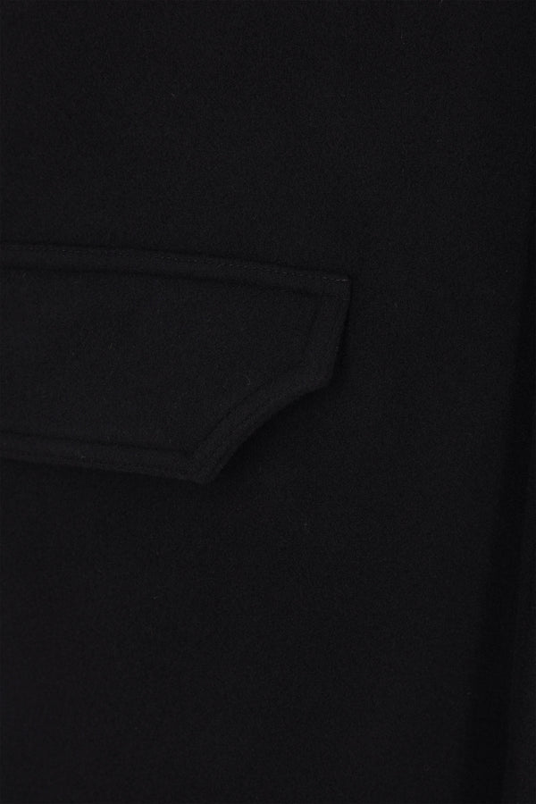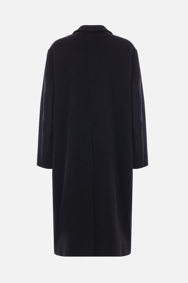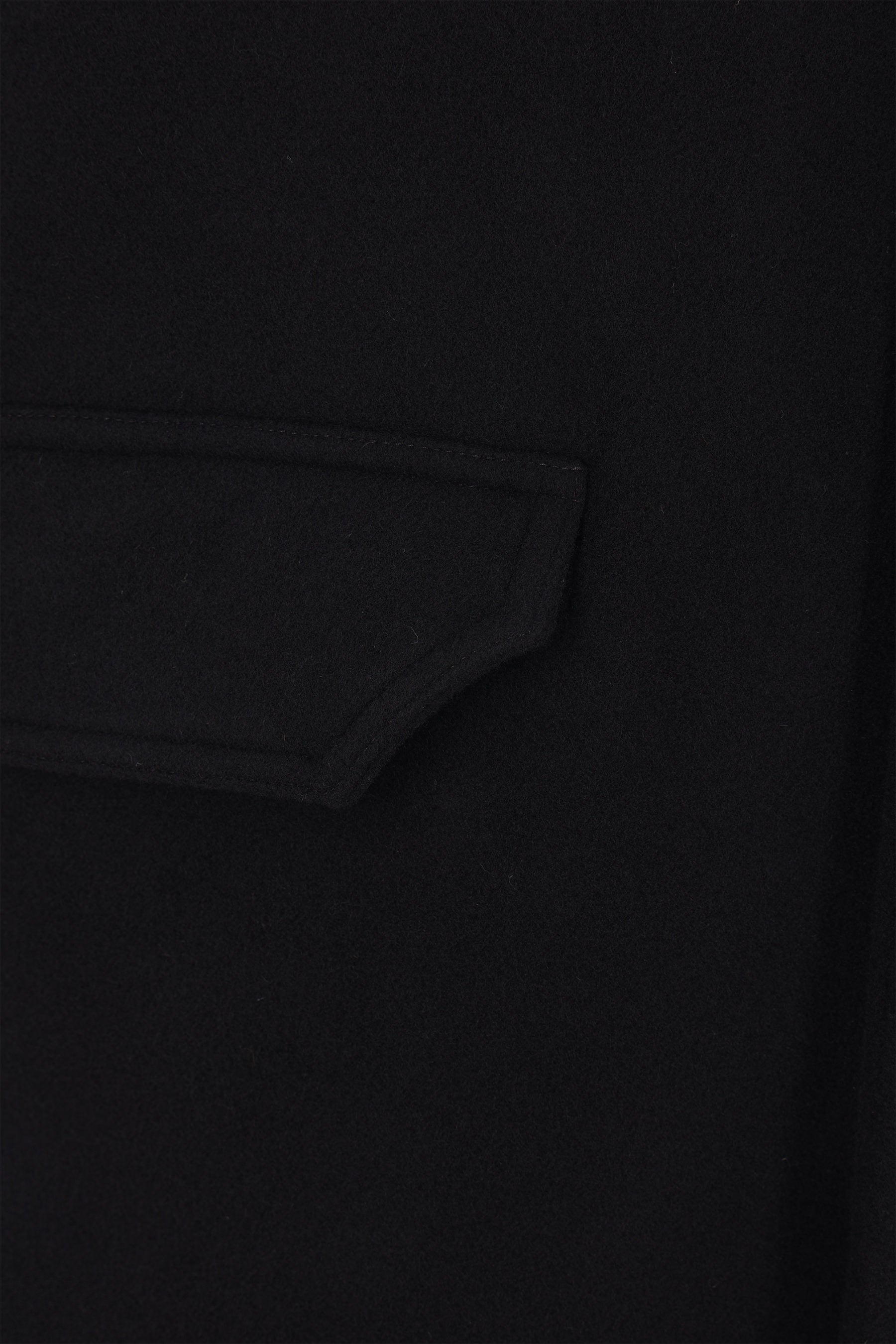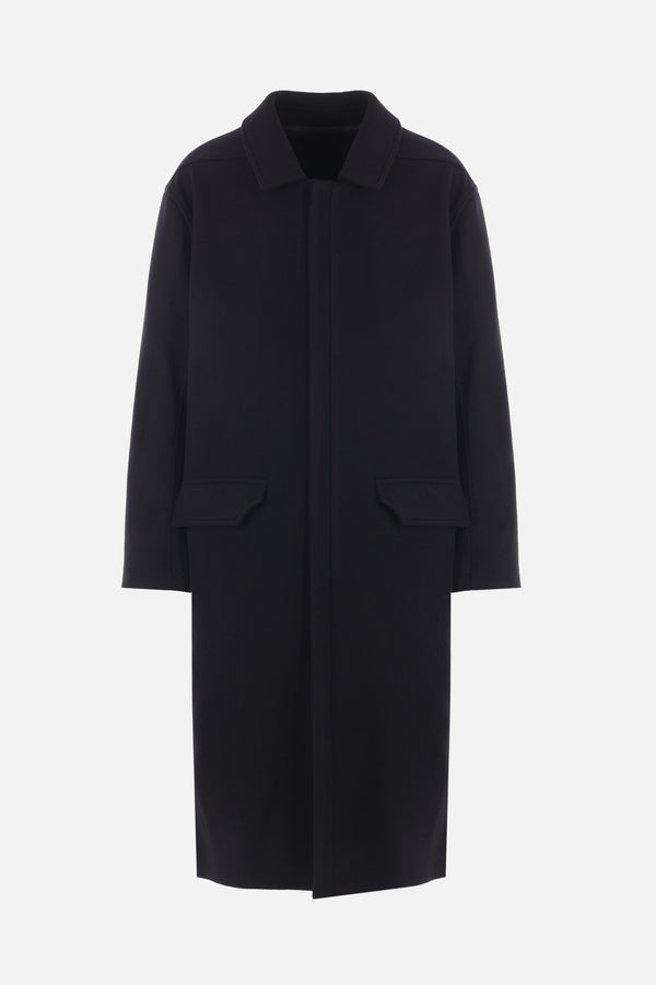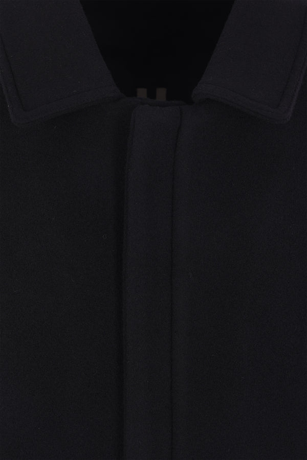 Rick Owens oversized coat made of black wool. Featuring a pointed collar, front zip closure, flap pockets, long sleeves, back vent with buttons, and a lined interior.