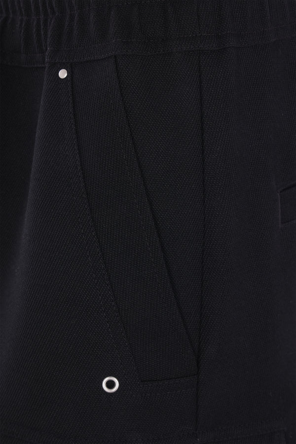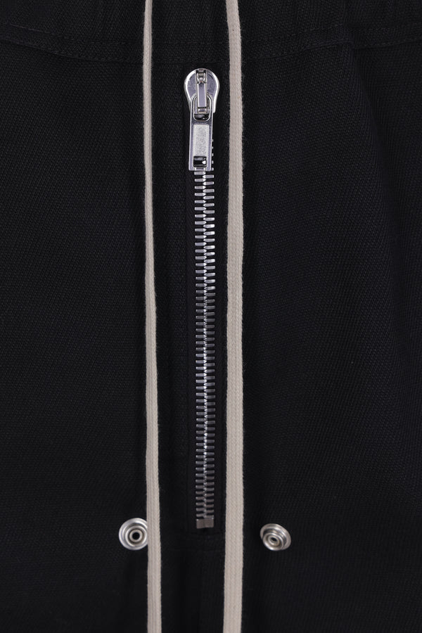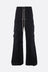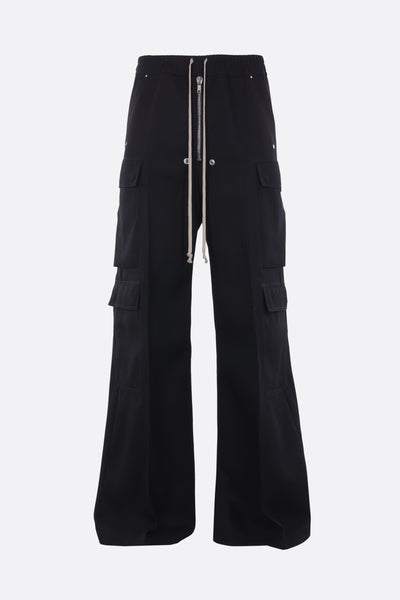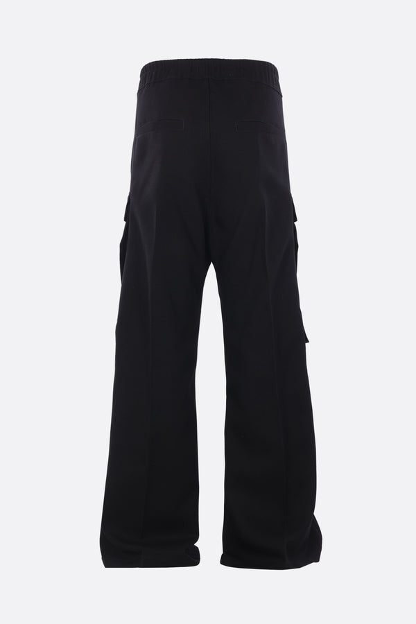 Rick Owens wide-leg cargo trousers made from black wool canvas. Features elasticated waistband with drawstring, front zip, and multiple pockets.