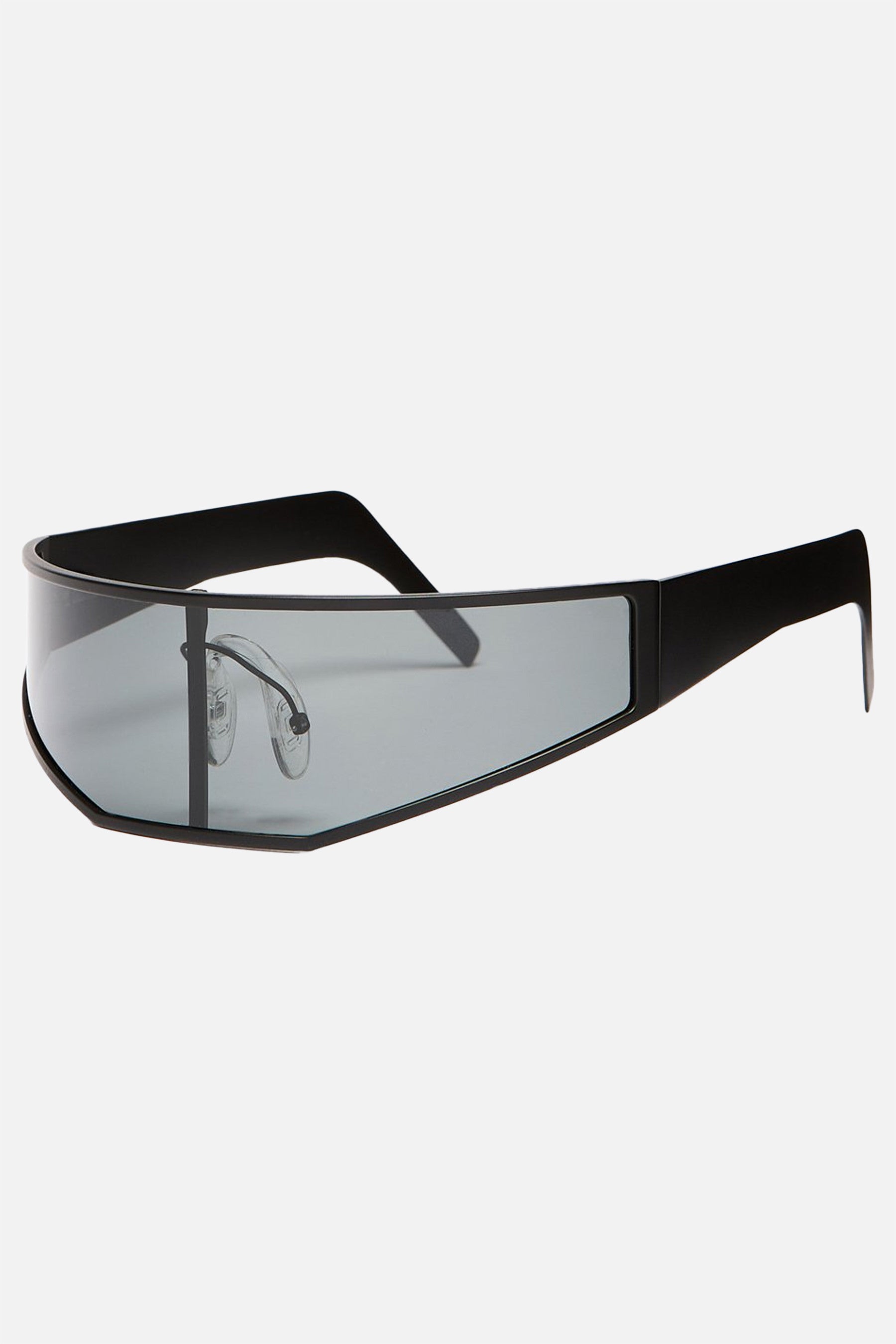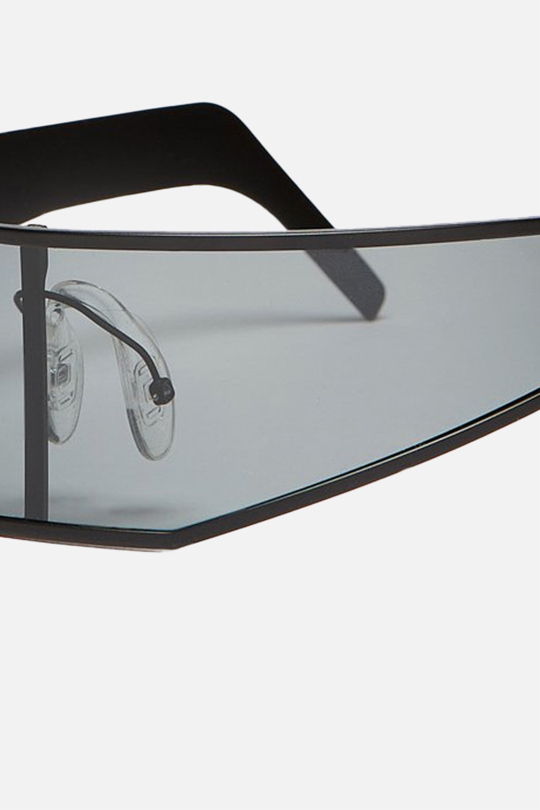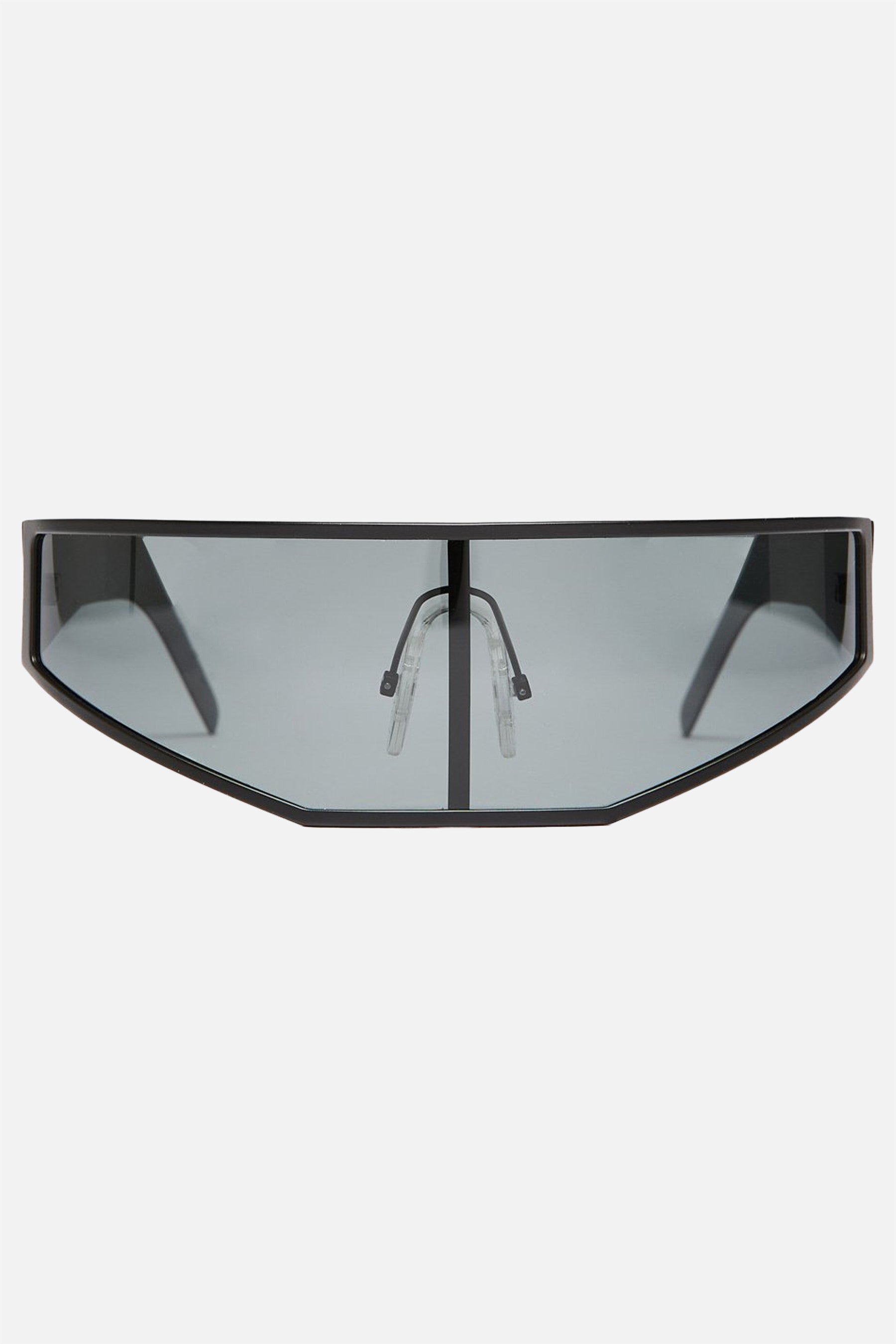 Rick Owens shield sunglasses made from black stainless steel with a single wraparound lens. Features rubber nose pads and flexible temples.