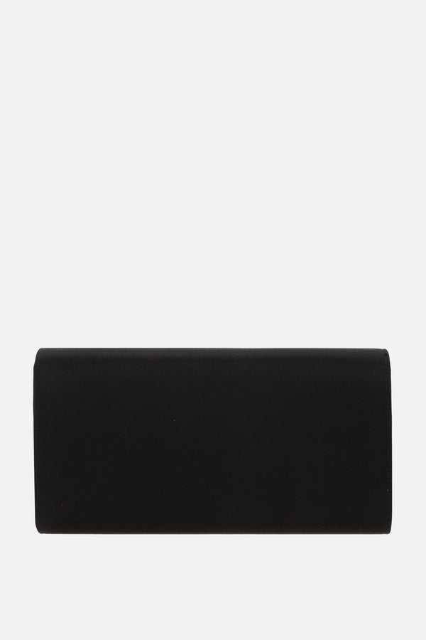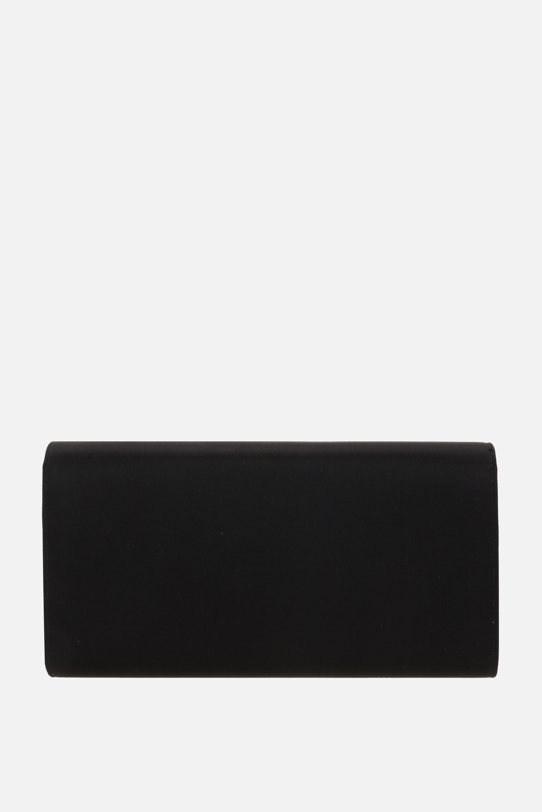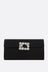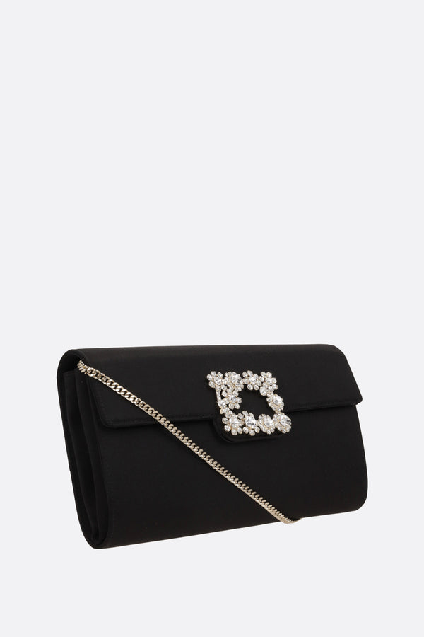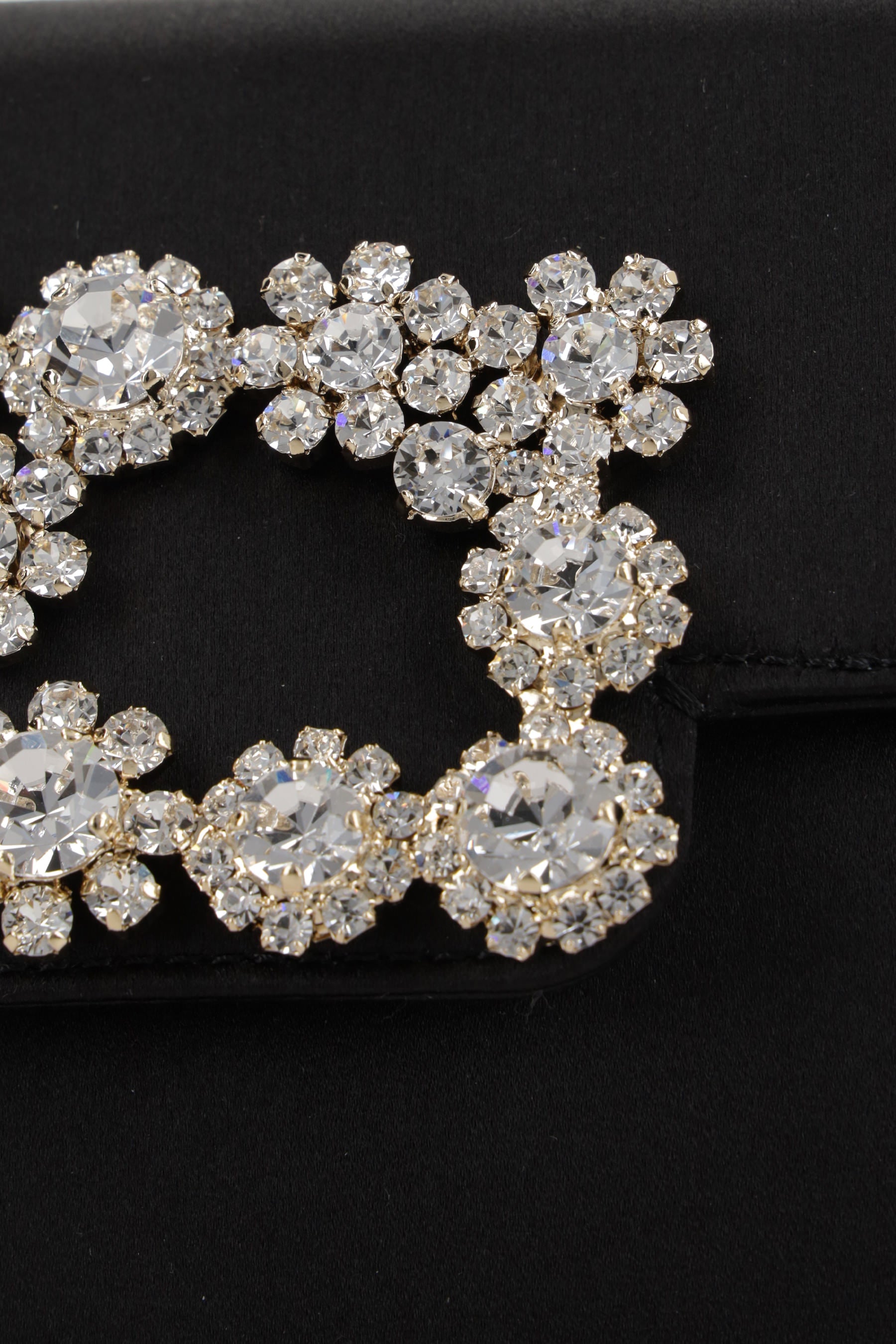 Roger Vivier clutch crafted in black satin. Featuring gold-tone hardware, a magnetic button closure on the flap, and a chain strap. The interior, lined in blush pink satin, includes two separate compartments and a card slot. The design is completed with the iconic jewel buckle on the flap.