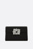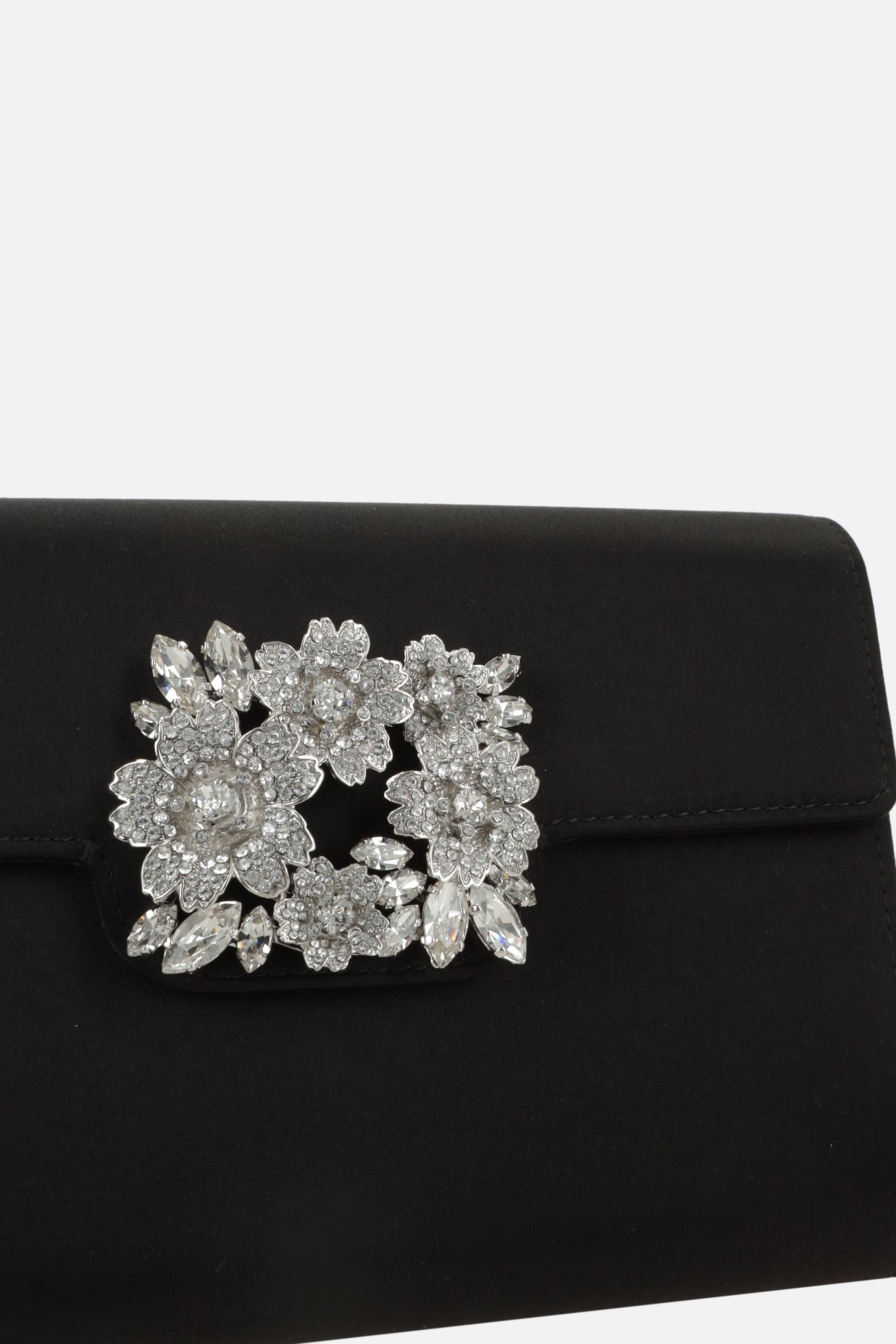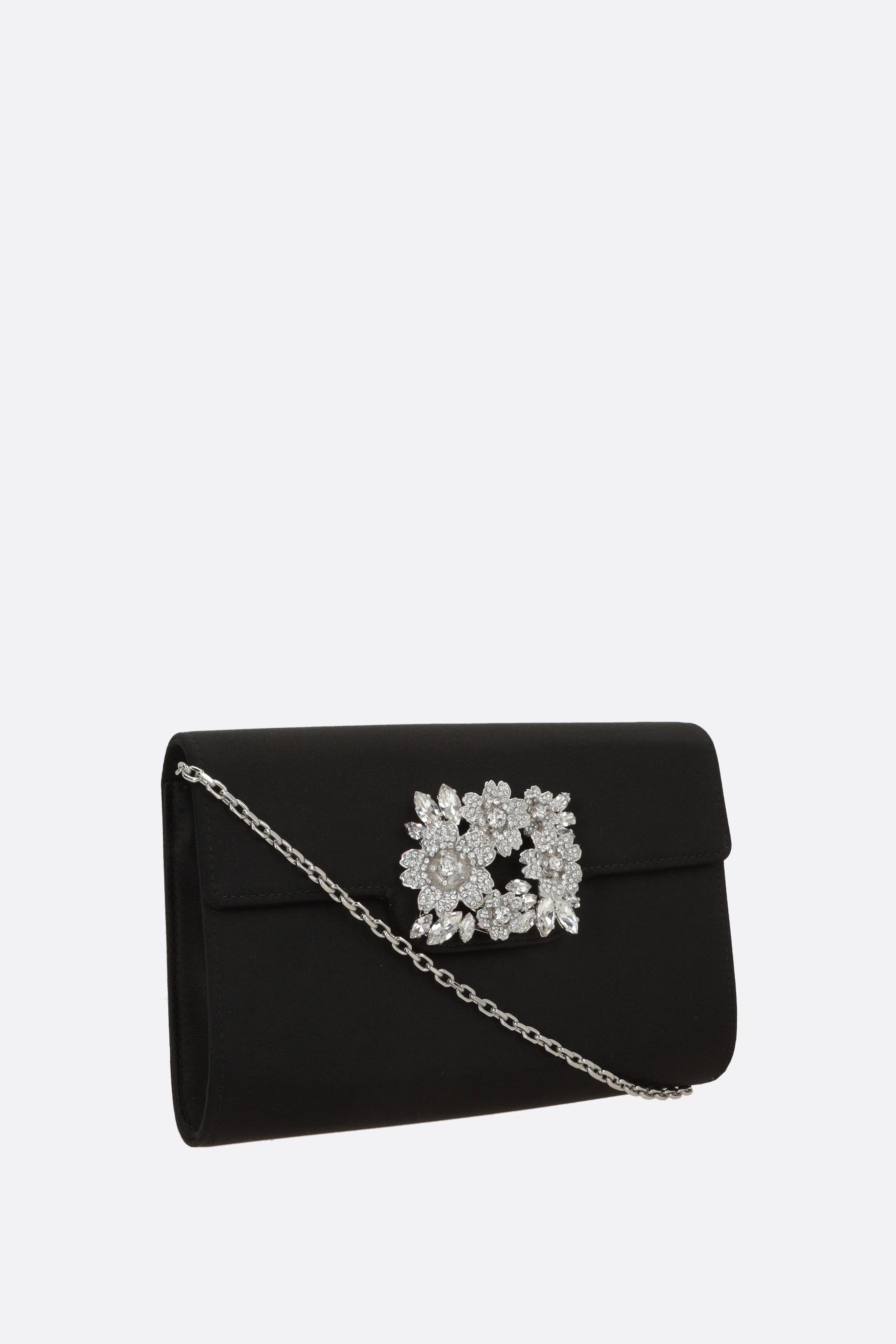 Roger Vivier clutch crafted from black satin. It features silver-tone hardware, flap with magnetic button closure, and a chain shoulder strap. The blush-pink satin-lined interior includes a card slot. The design is completed with the iconic Efflorescence buckle on the flap.