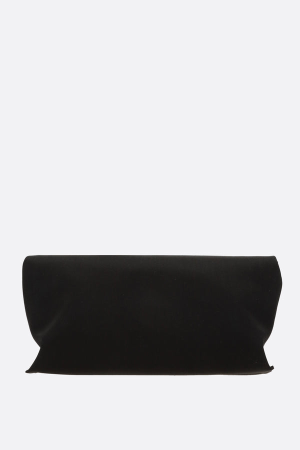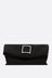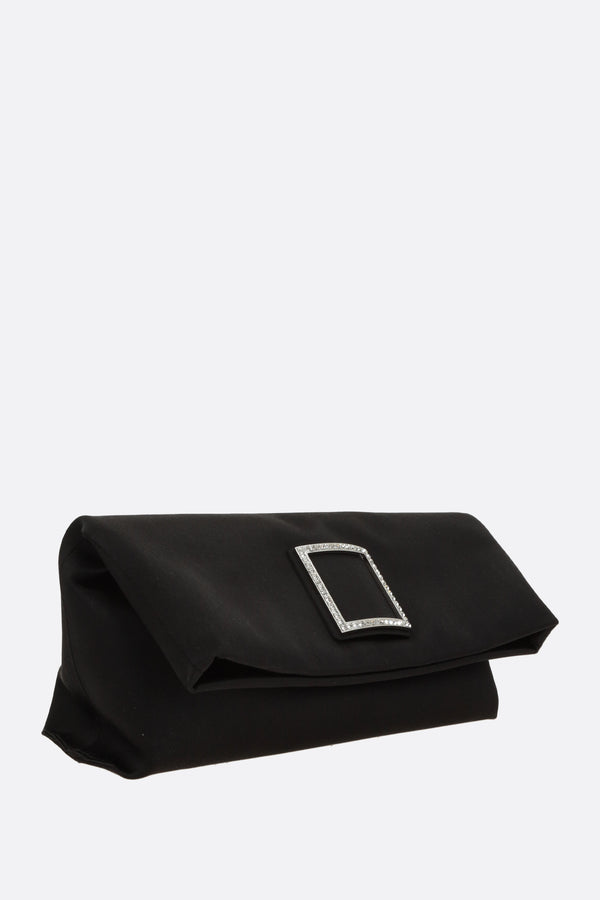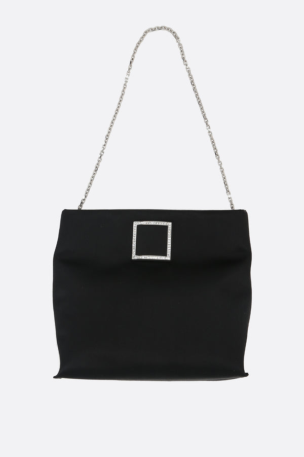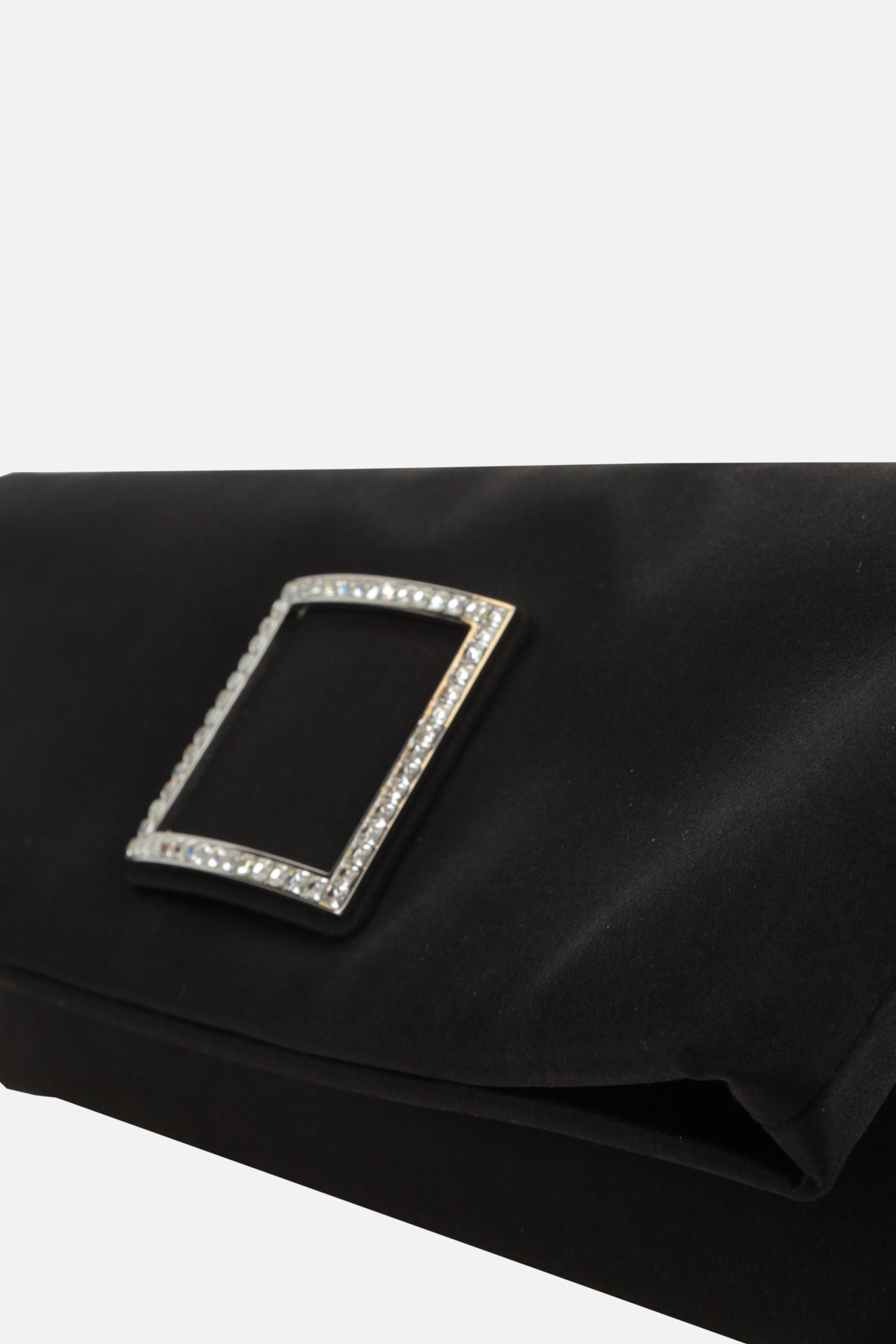 Roger Vivier clutch crafted from black satin. It features silver-tone hardware, internal magnetic button closures, and a chain handle. The satin-lined interior in pink includes a flat pocket. The design is completed with the iconic jewel buckle applied to the front.