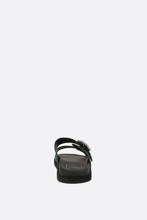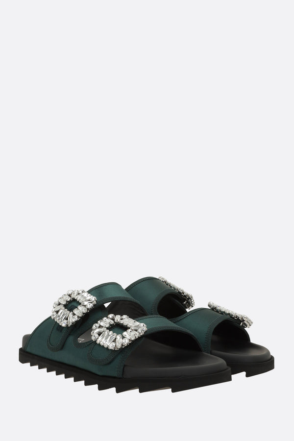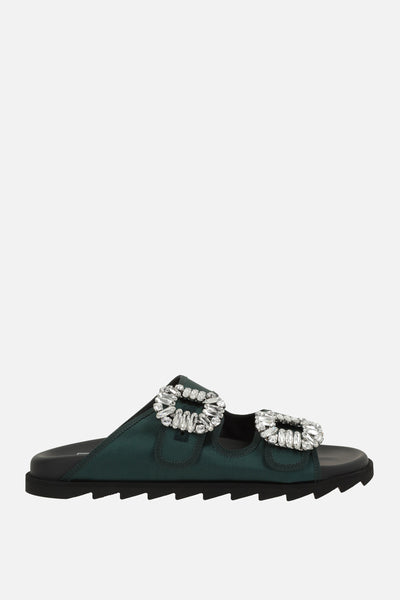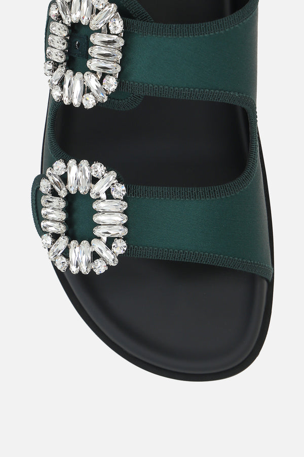 Roger Vivier flat sandals crafted from dark green satin. Featuring a round toe, double buckle embellished with crystals, leather linings, and a rubber sole.