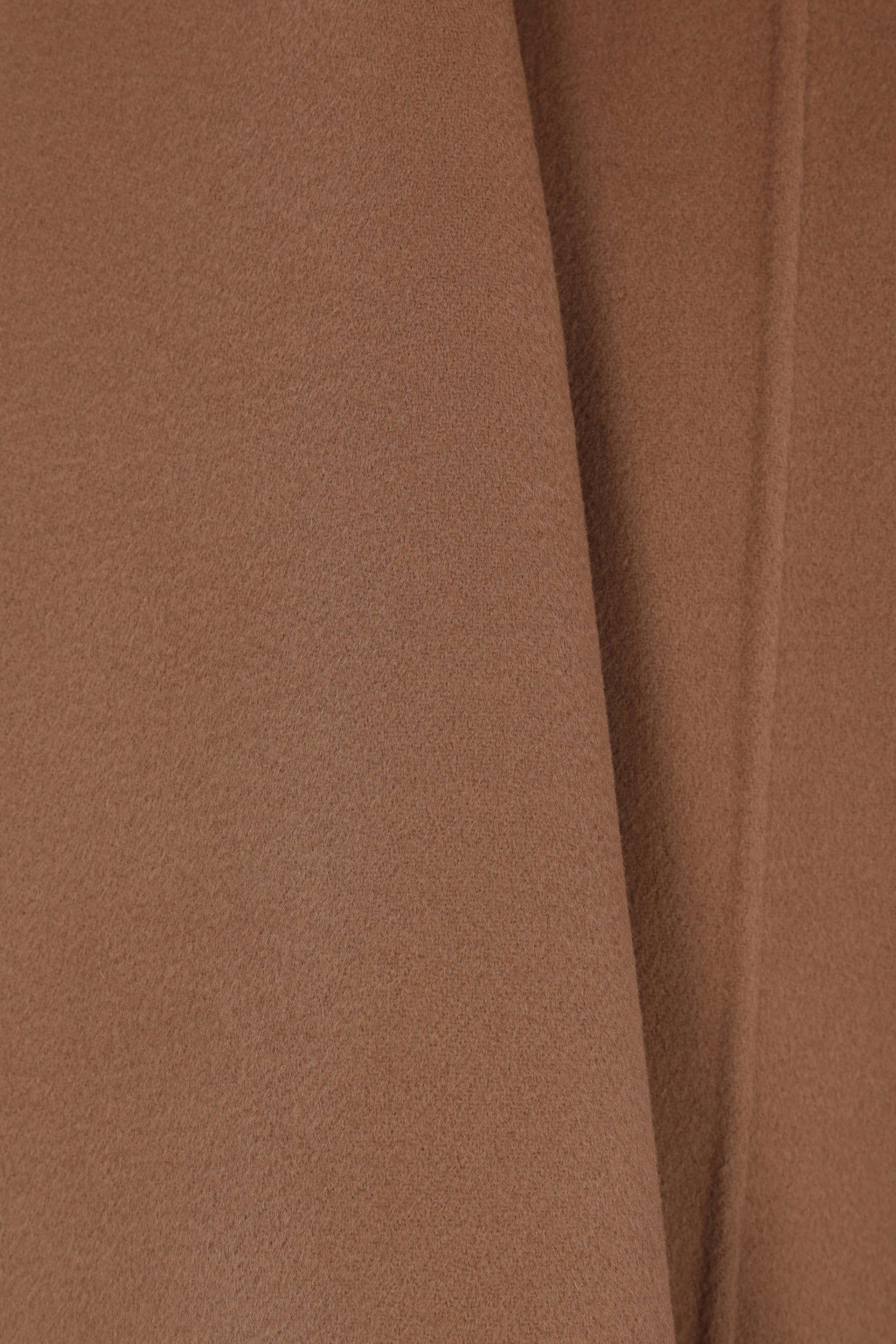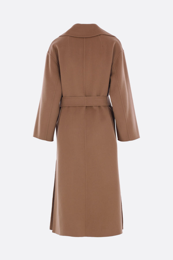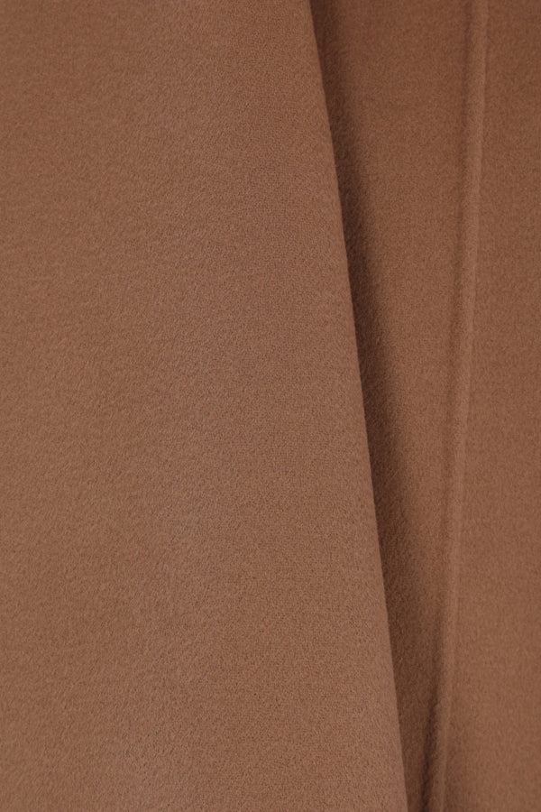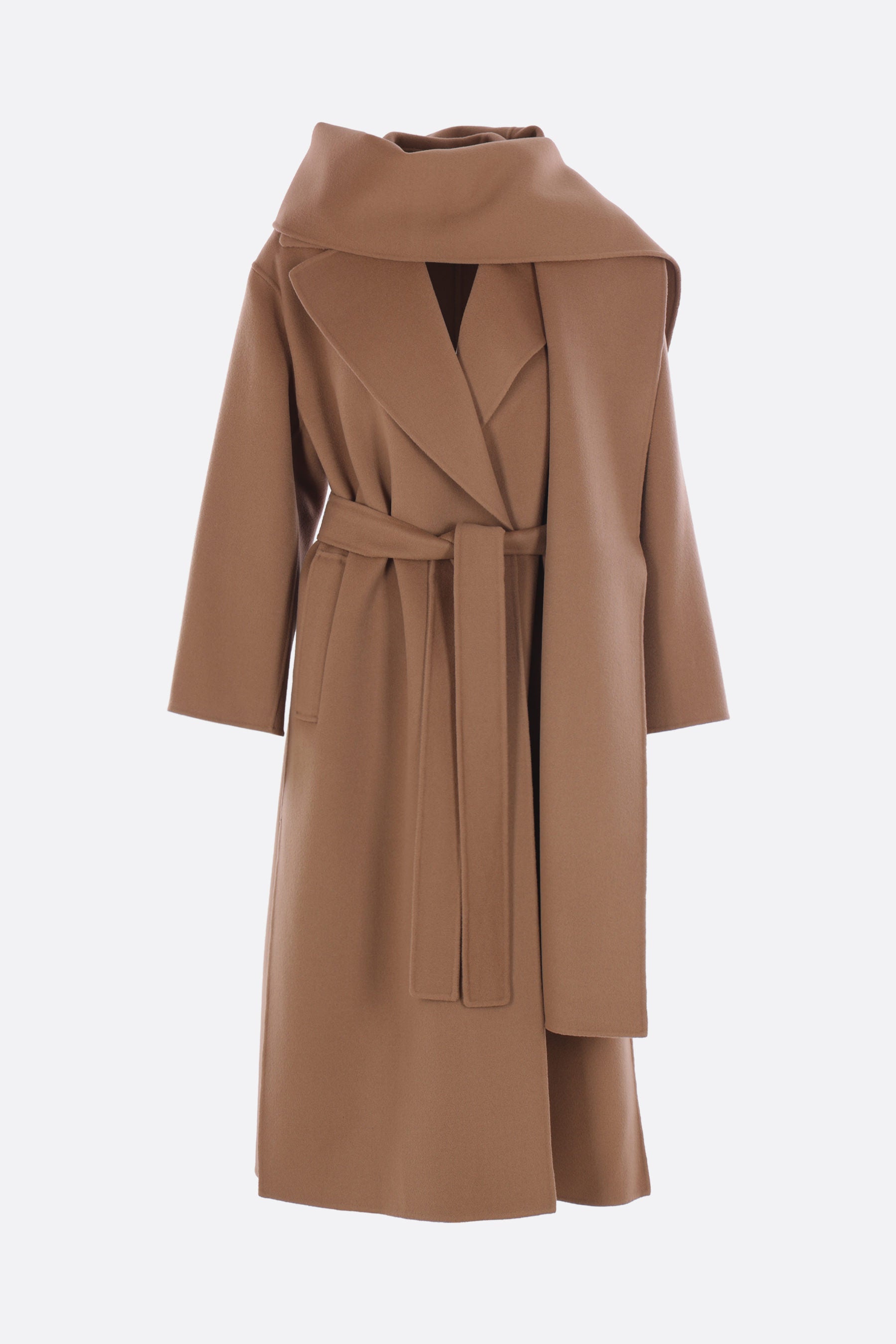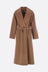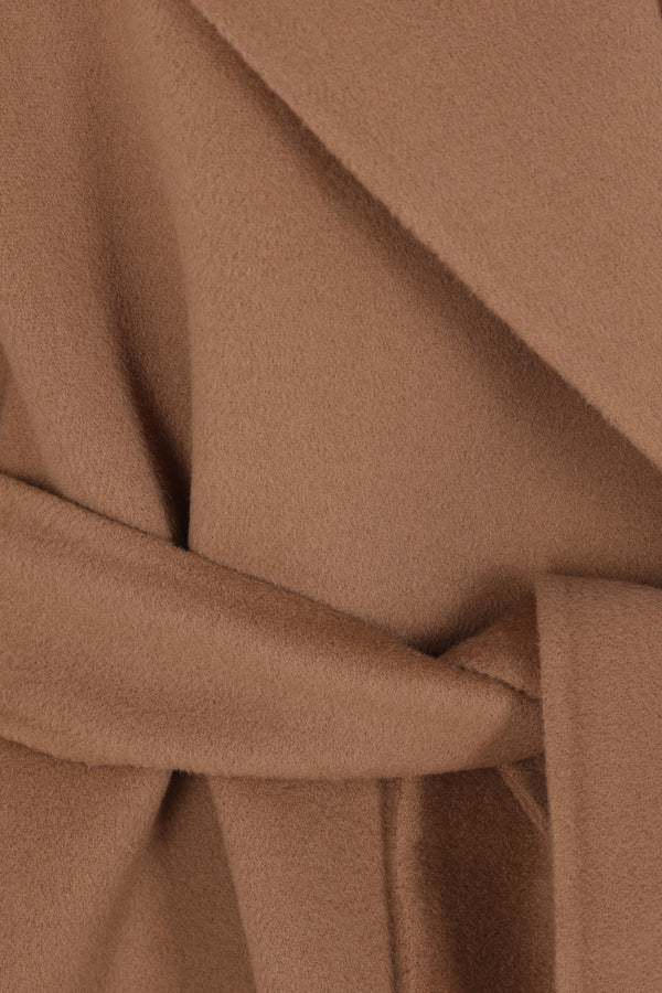 'S Max Mara wrap coat made of light brown double-faced pure wool drape. Featuring wide lapels, a matching scarf, removable belt, welt pockets, long sleeves, side slits, and a partially lined interior.