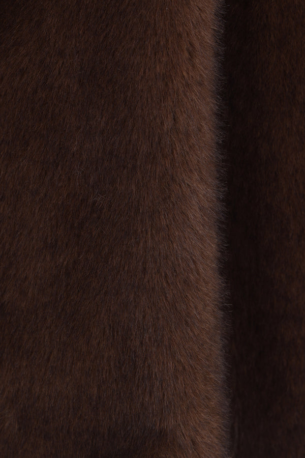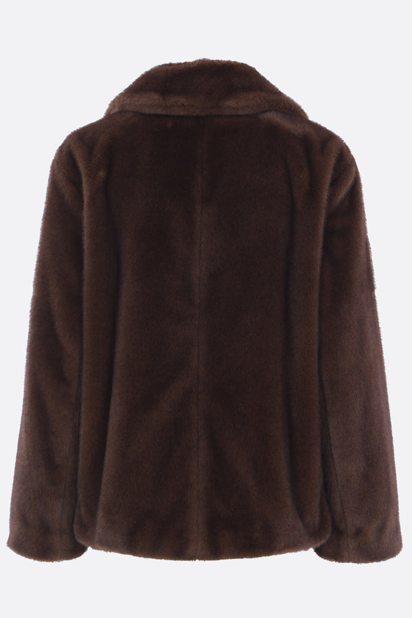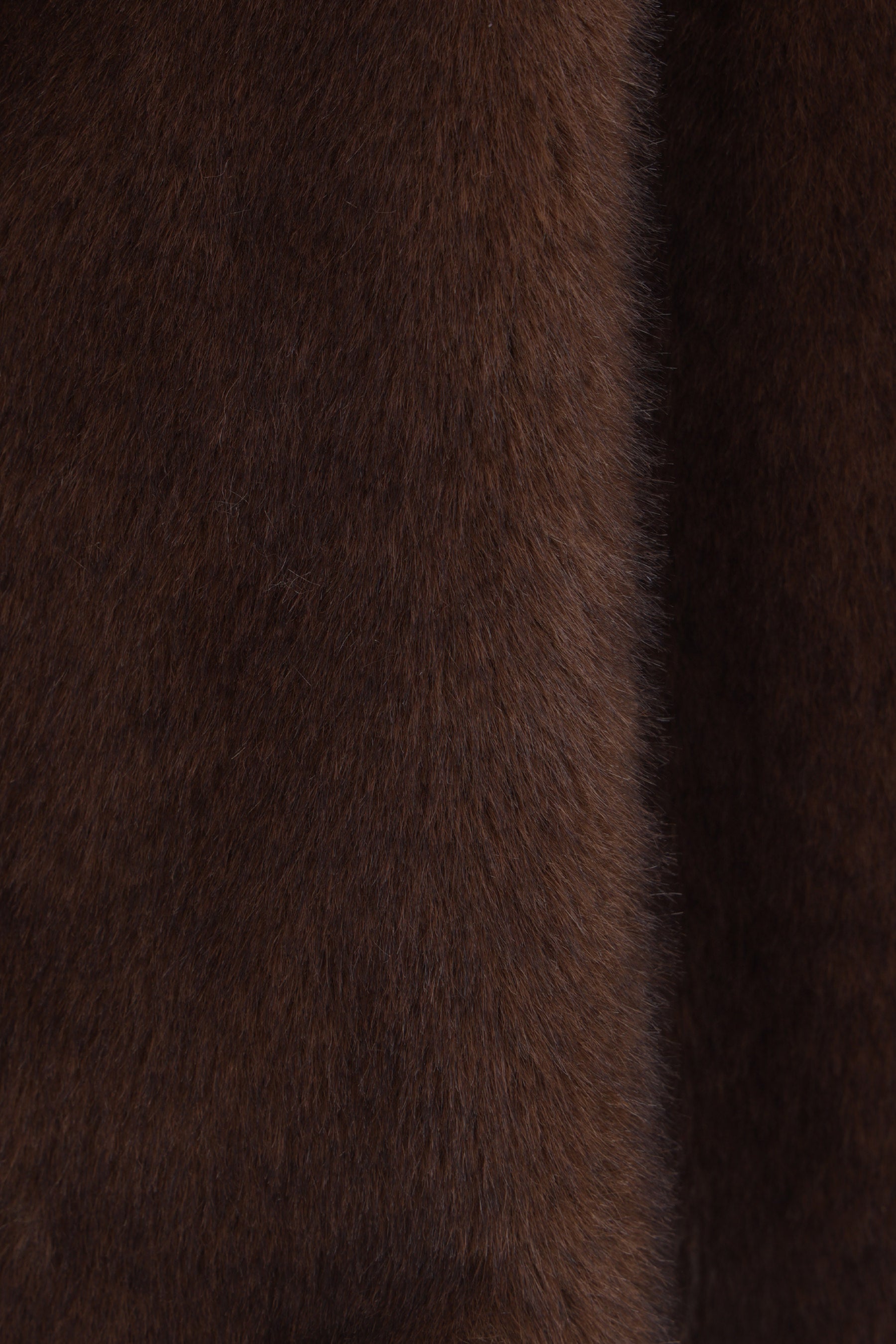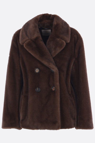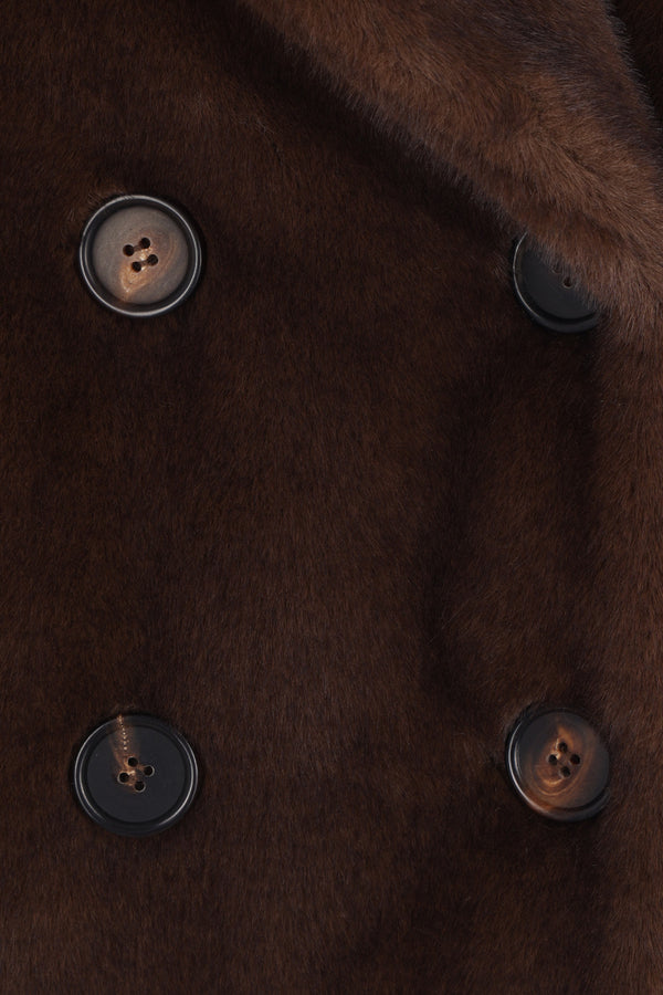 'S Max Mara double-breasted peacoat made of brown faux fur. Featuring wide lapels, front button closure, concealed side pockets, long sleeves, and a straight hem. Fully lined interior.