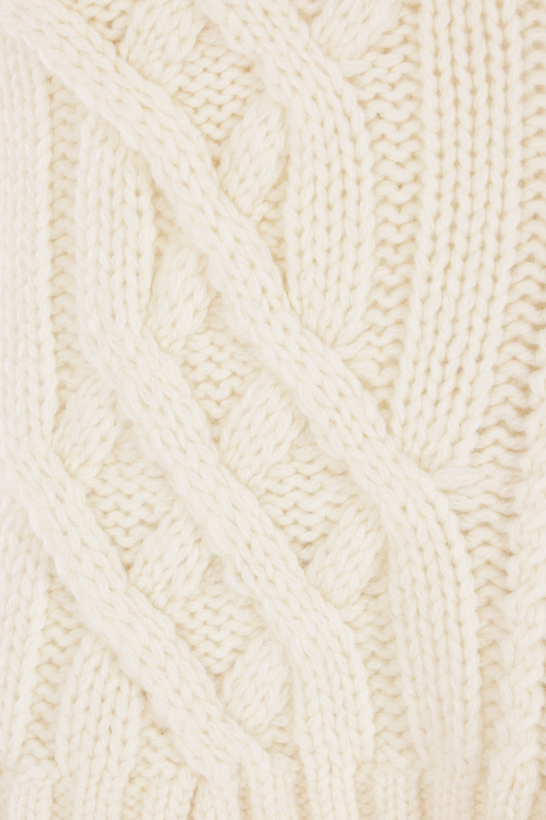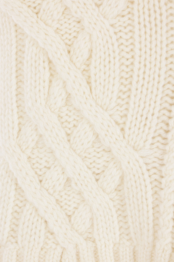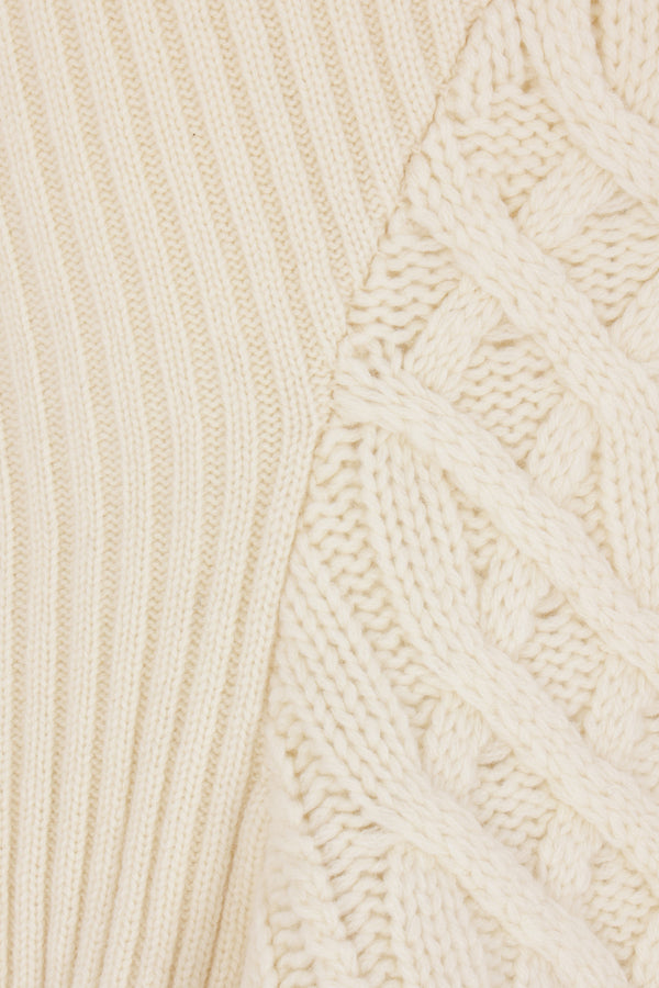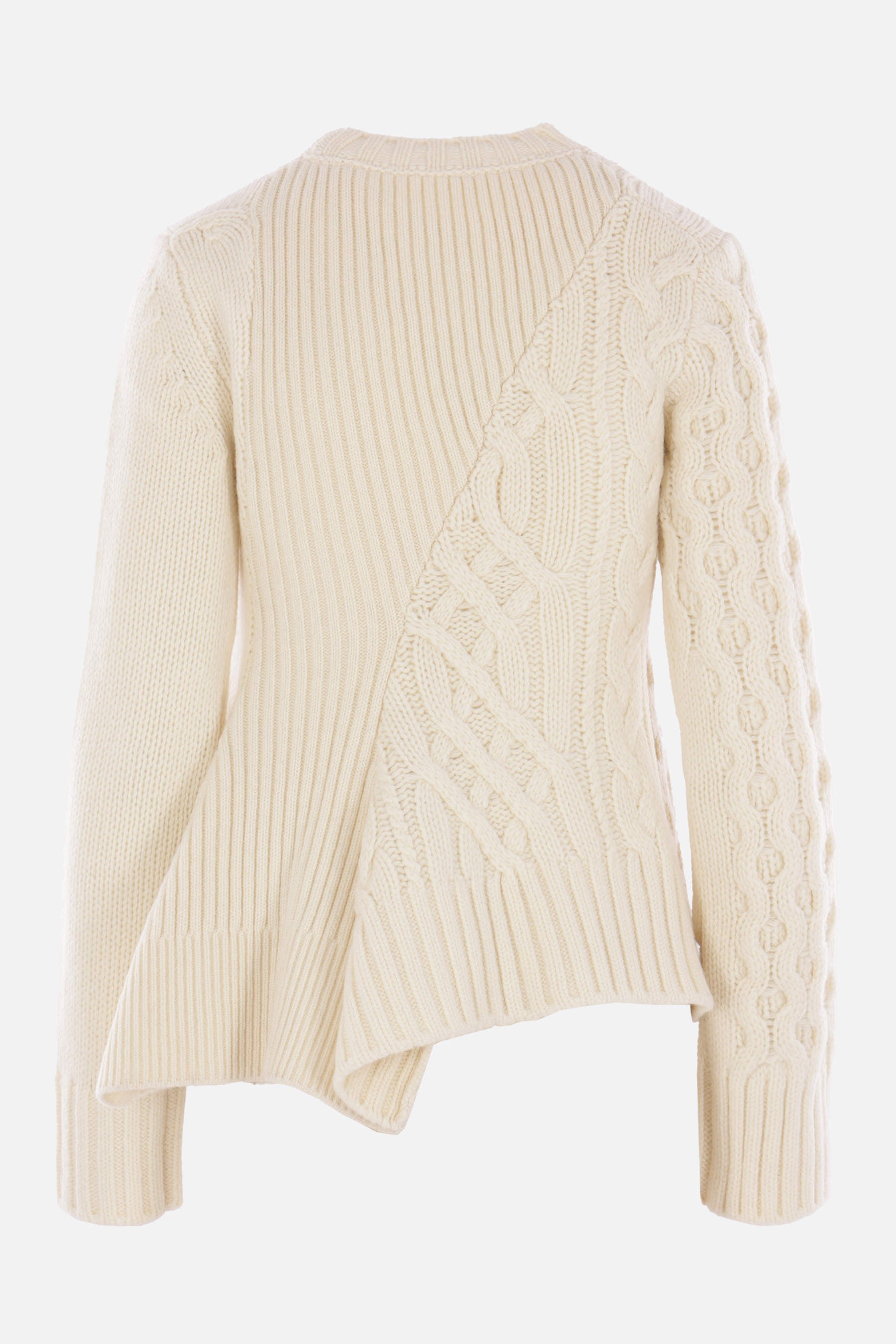 Sacai sweater crafted from ivory wool-blend with contrasting knit details. Featuring a crew neckline, long sleeves, ribbed trims, and an asymmetric hem.