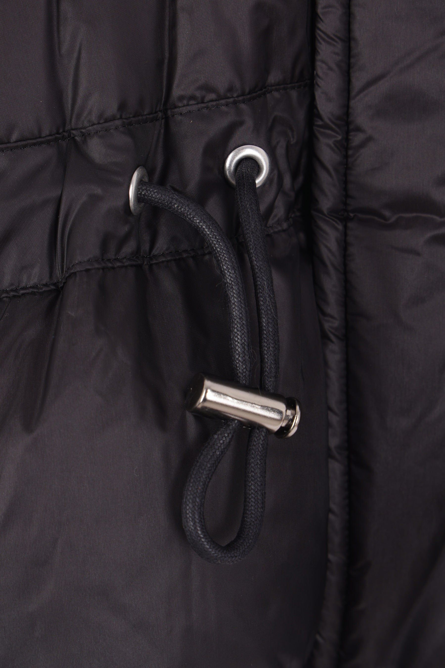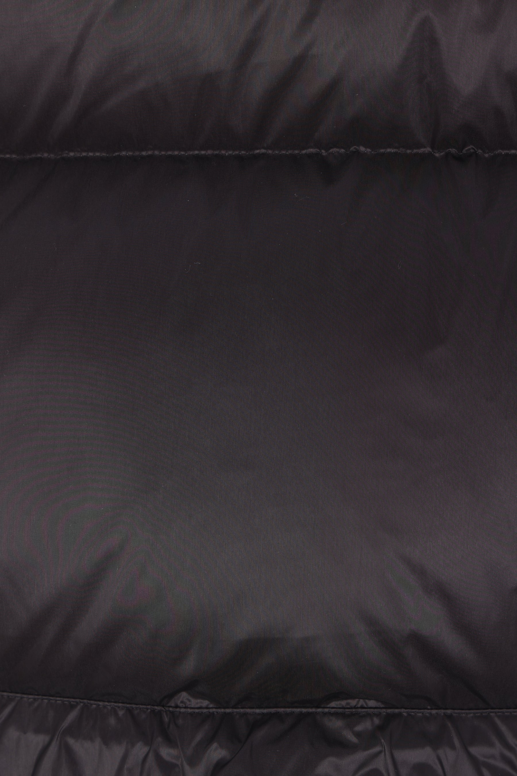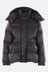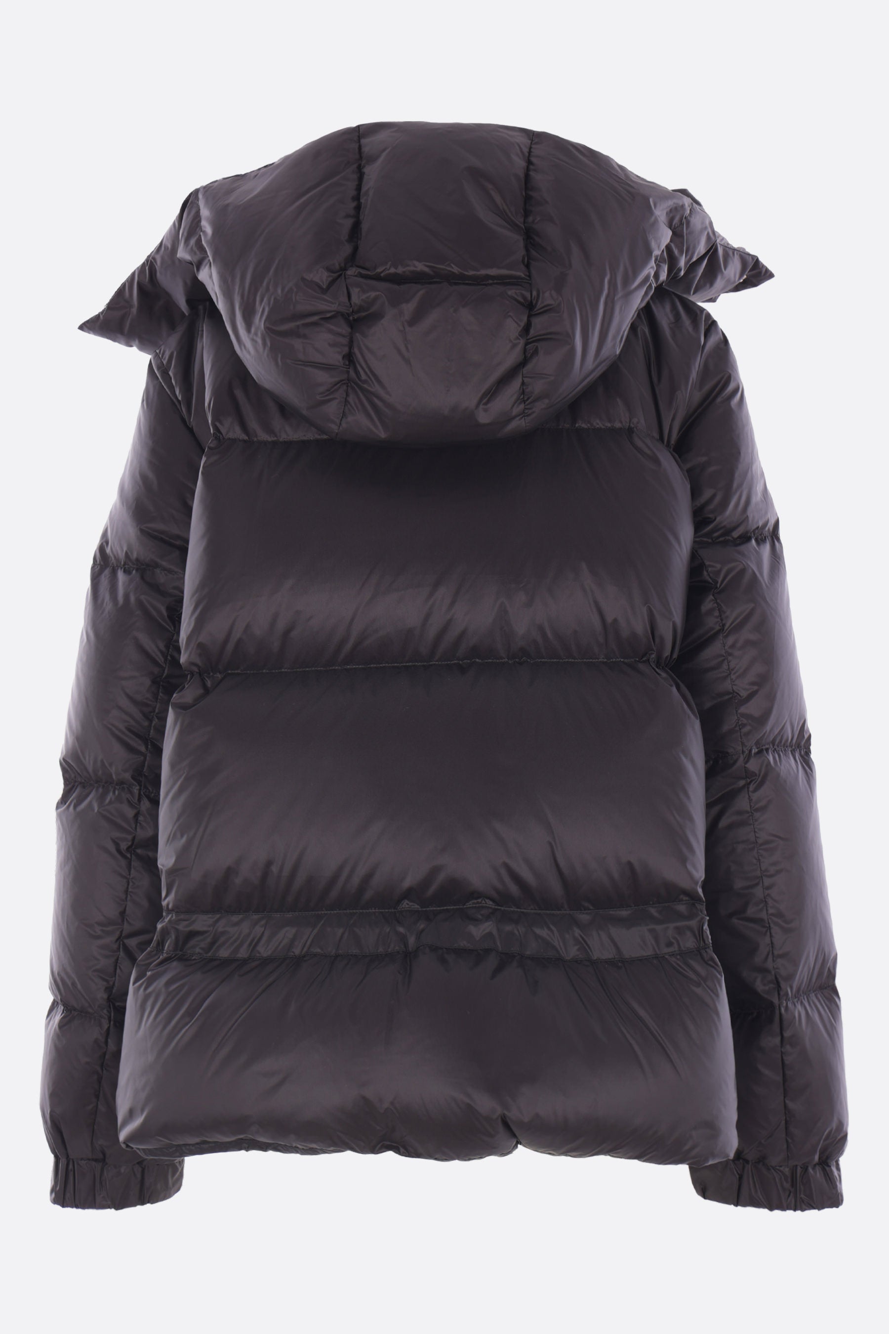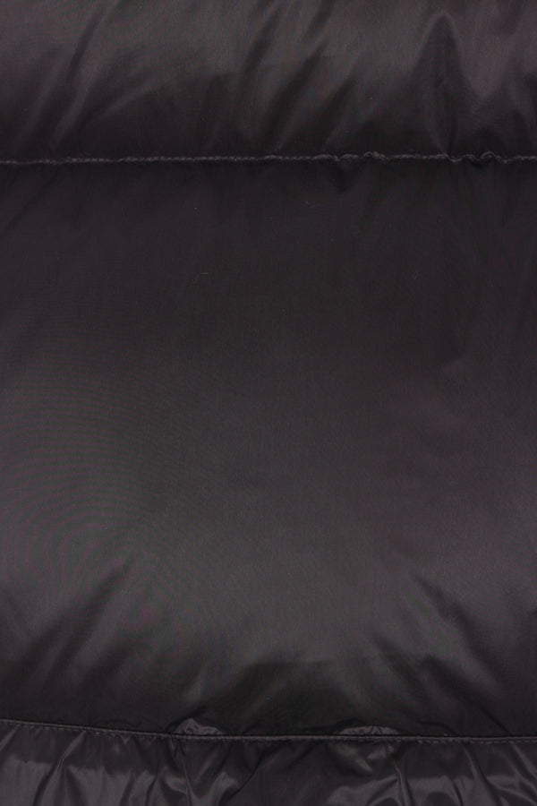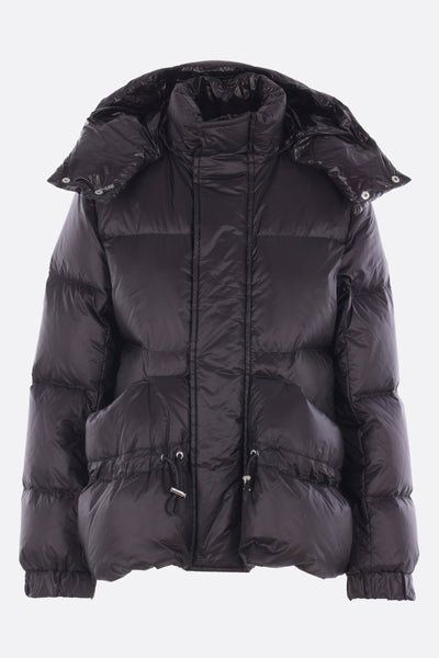 Sacai down jacket crafted from black nylon. Featuring a band collar, detachable hood, front closure with two-way zip and snap buttons, oversized pockets, long sleeves with elasticated cuffs, and a flared hem with double drawstring.