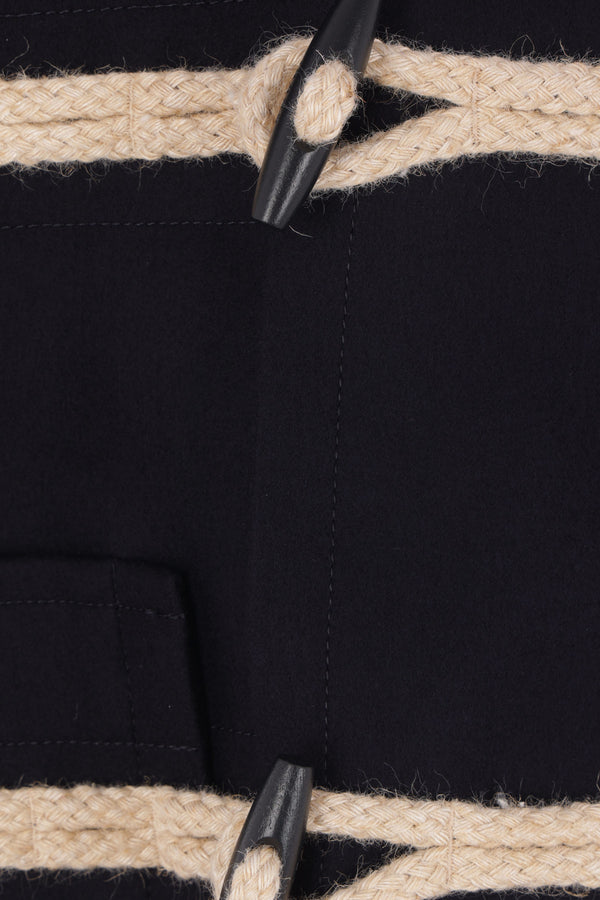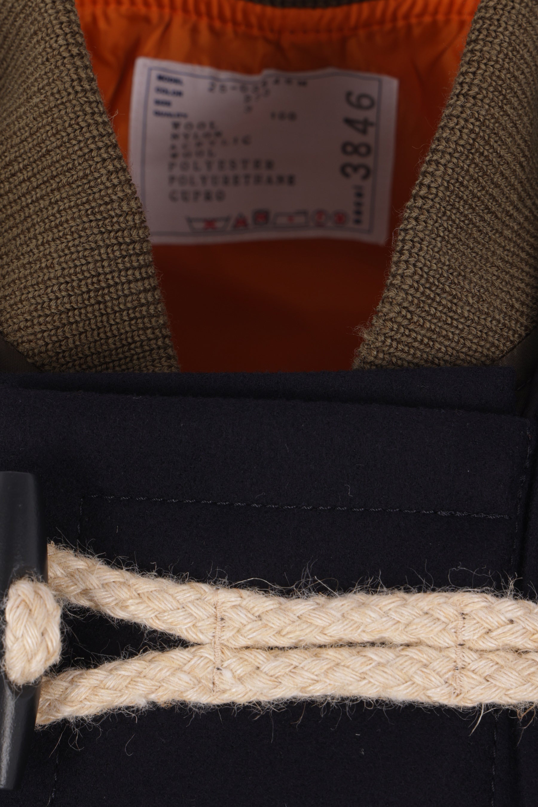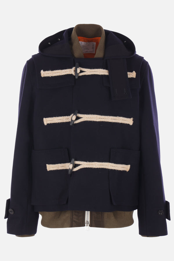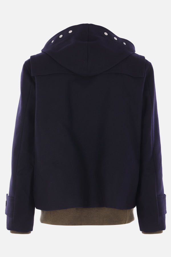 Sacai montgomery coat crafted from blue wool cloth with a bomber-style interior in khaki green nylon. Featuring a classic hood, bomber collar, toggle fastening with double-slider zip, front patch pockets, long sleeves with wrist tabs, ribbed knit trims, and a straight hem with buttoned side slits.