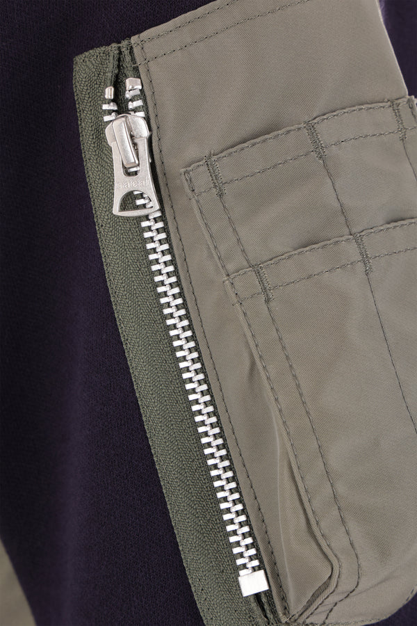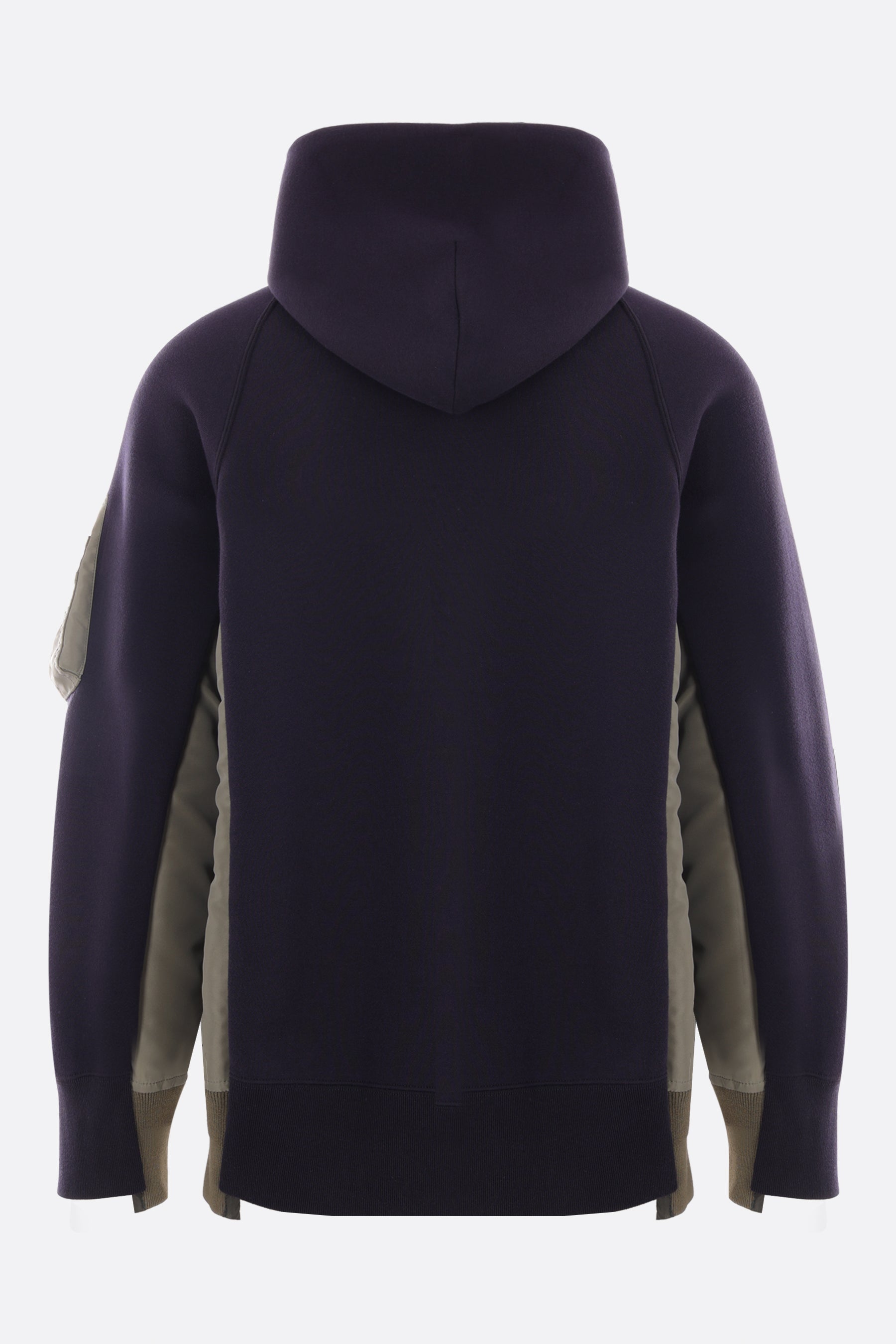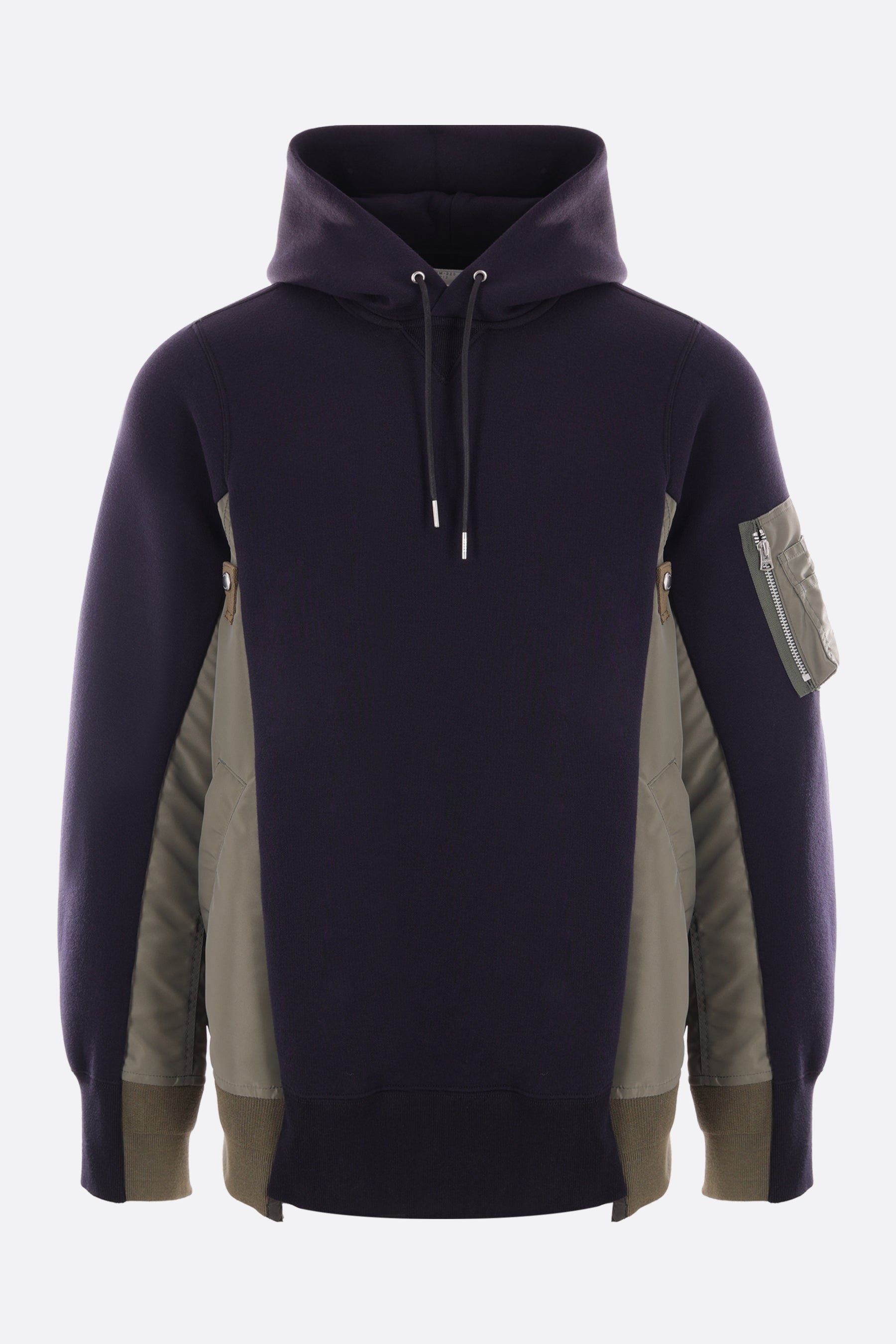 Sacai hoodie crafted in blue technical cotton jersey with side inserts in military green nylon twill. It features long sleeves, multiple pockets and ribbed edges.