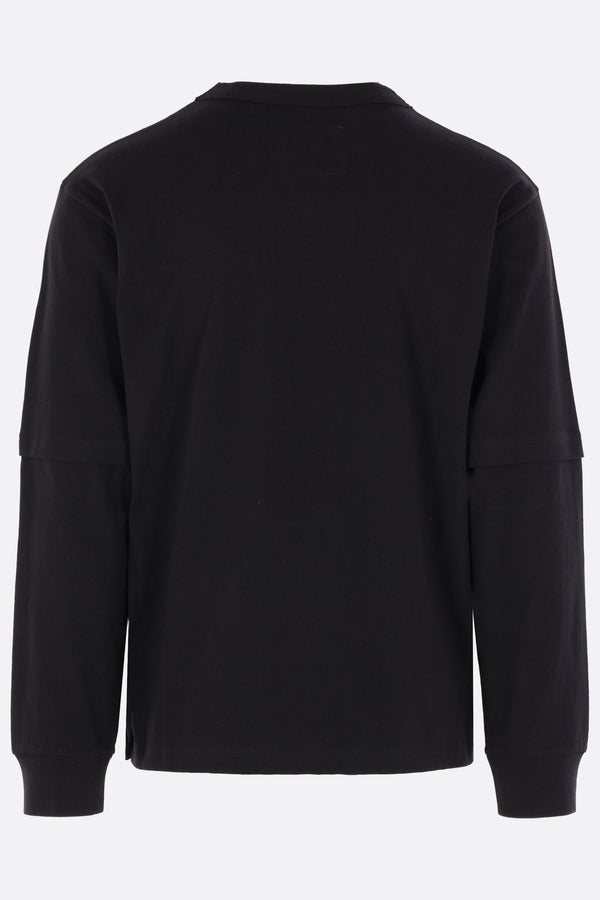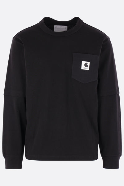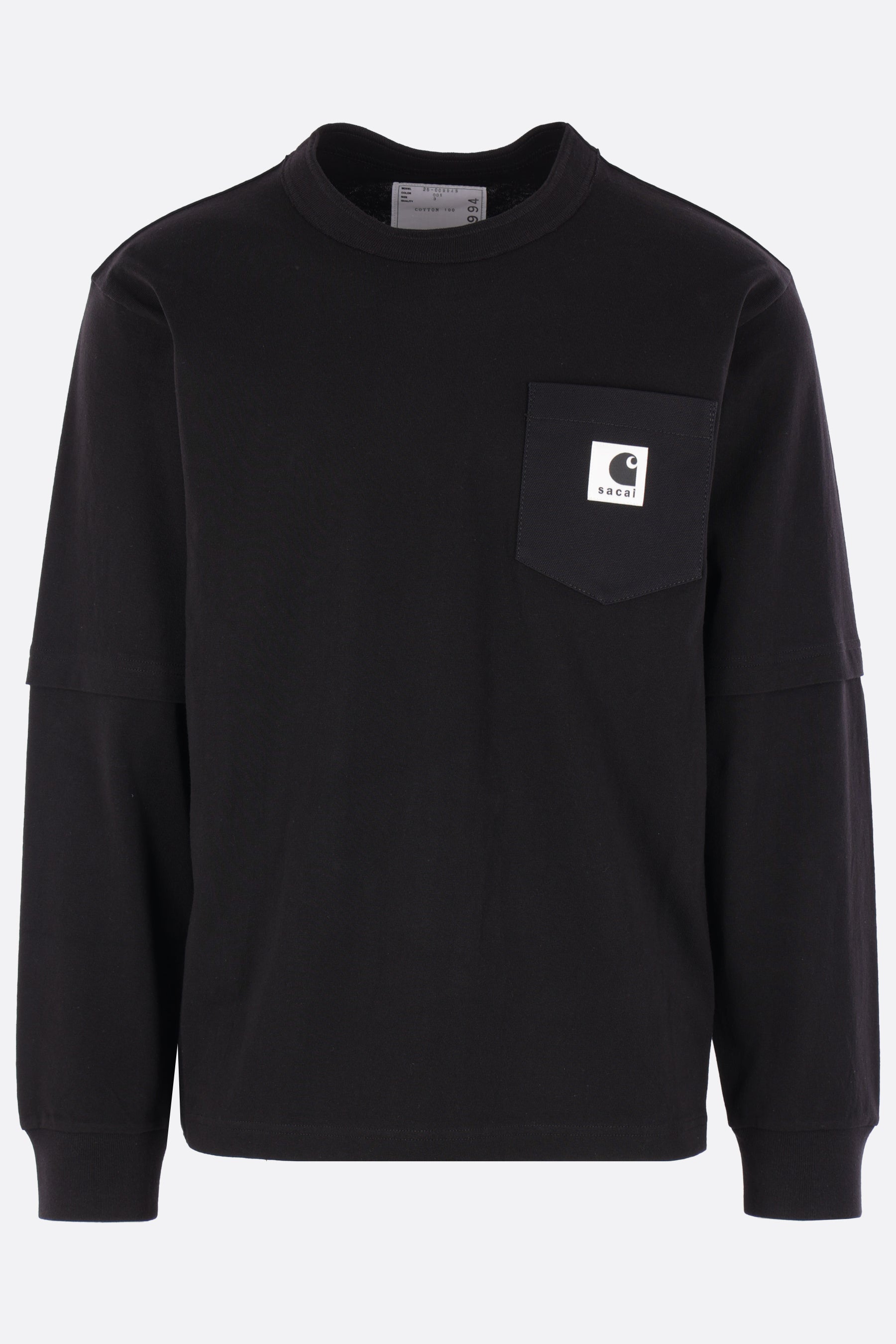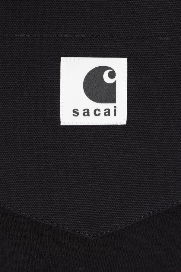Sacai x Carhartt WIP T-shirt crafted from black cotton jersey. Featuring crew neckline, long sleeves, side slits with snap buttons, and straight hem. The design is completed by a Sacai/Carhartt logo patch applied on the chest pocket.