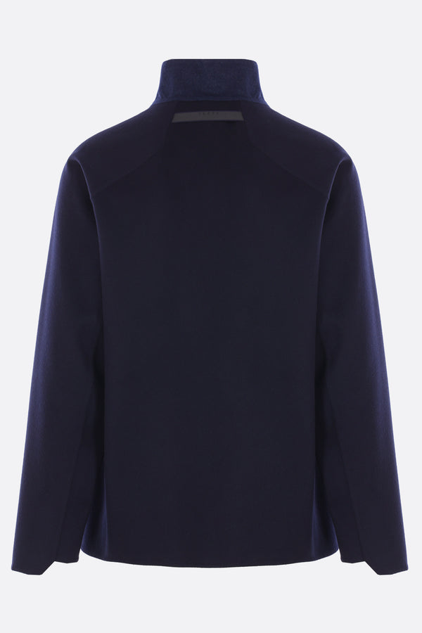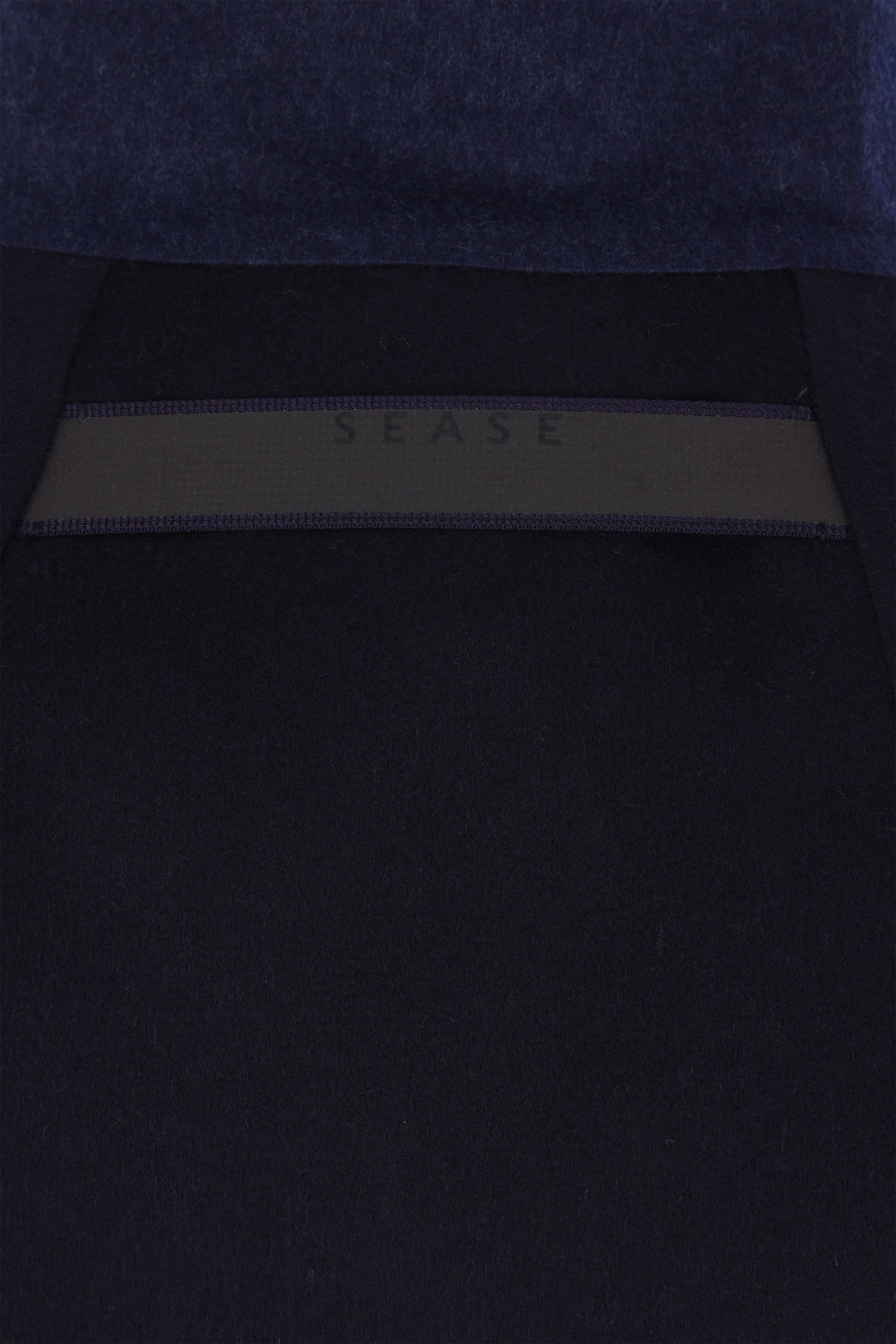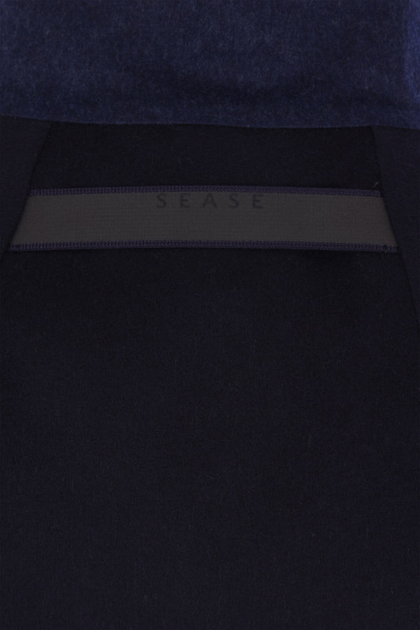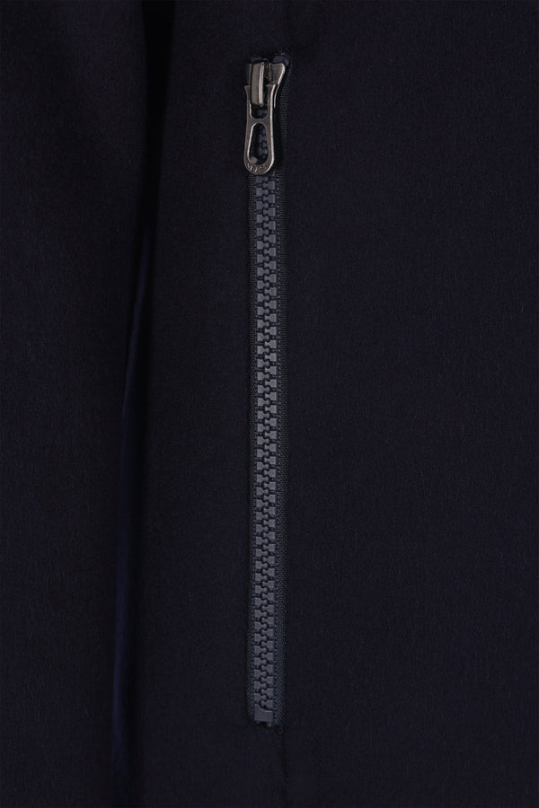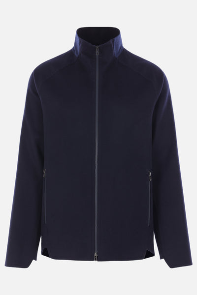 Biker jacket by Sease, crafted from wool and cashmere in navy blue. Featuring a high collar, two-way zip closure, zip pockets, long sleeves, and a straight hem. The design is completed with a logo strip on the back.