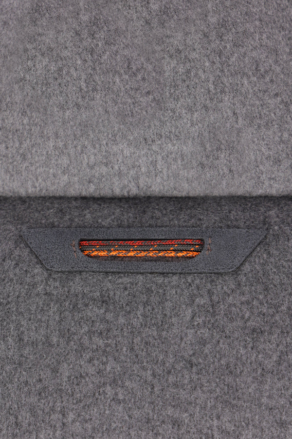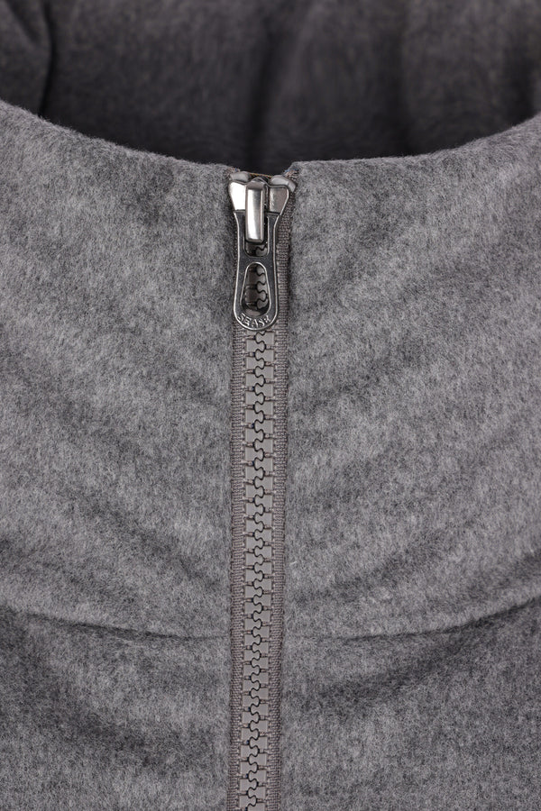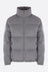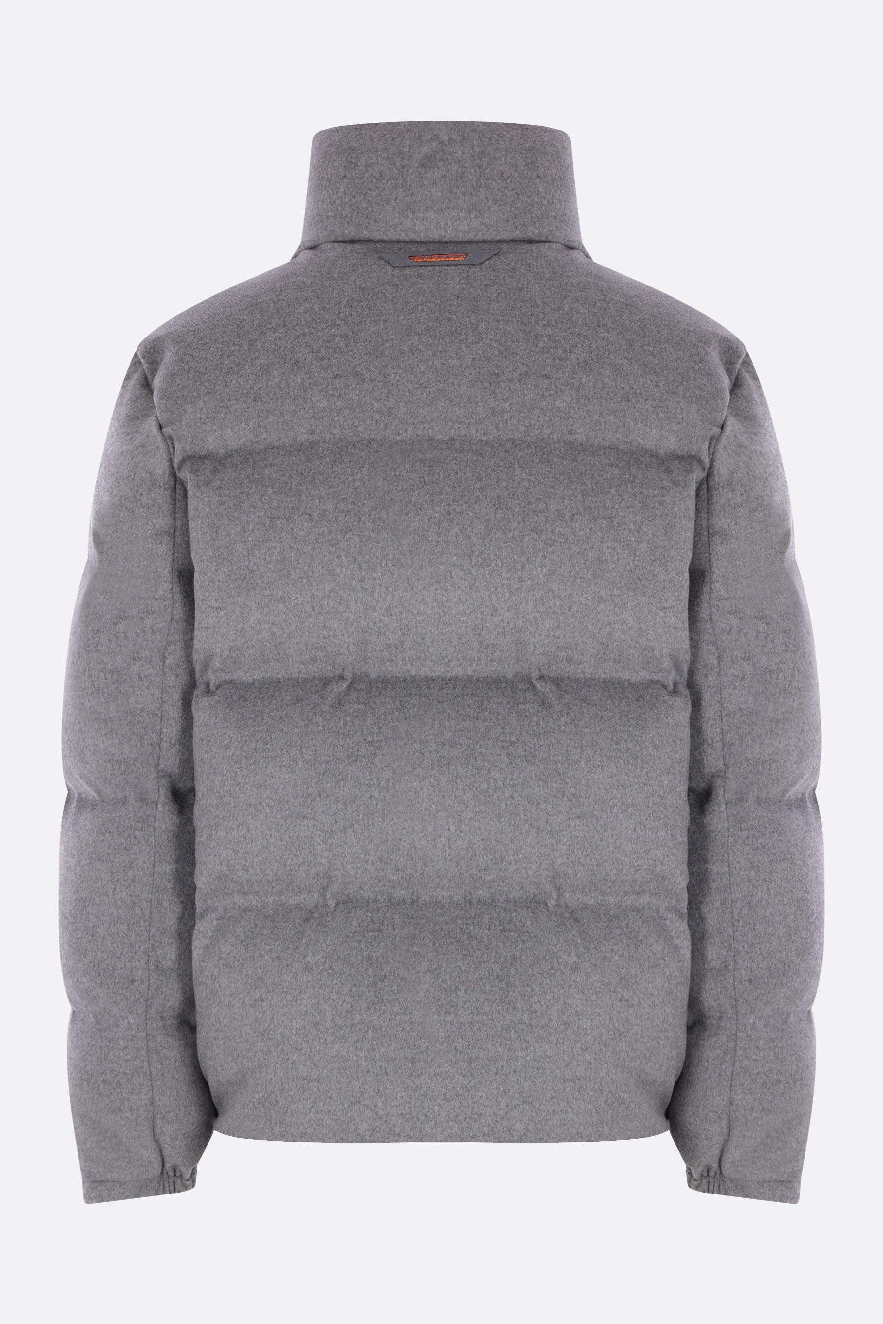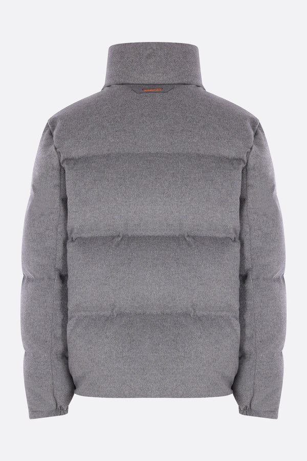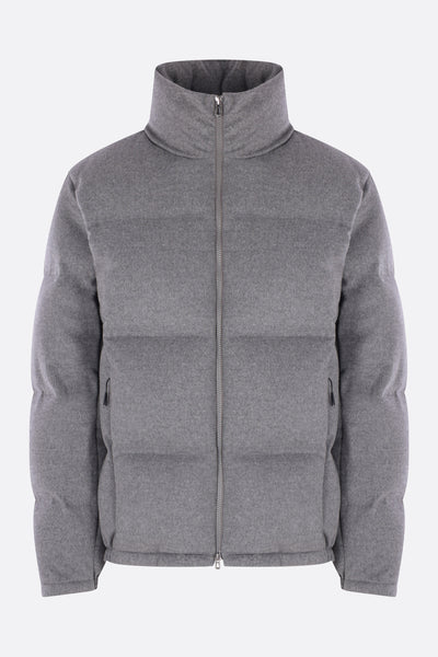 Sease down jacket crafted from grey wool and cashmere flannel. Featuring a high collar, front two-way zip closure, zip pockets, and elasticized edges. Nylon ripstop lined interior.