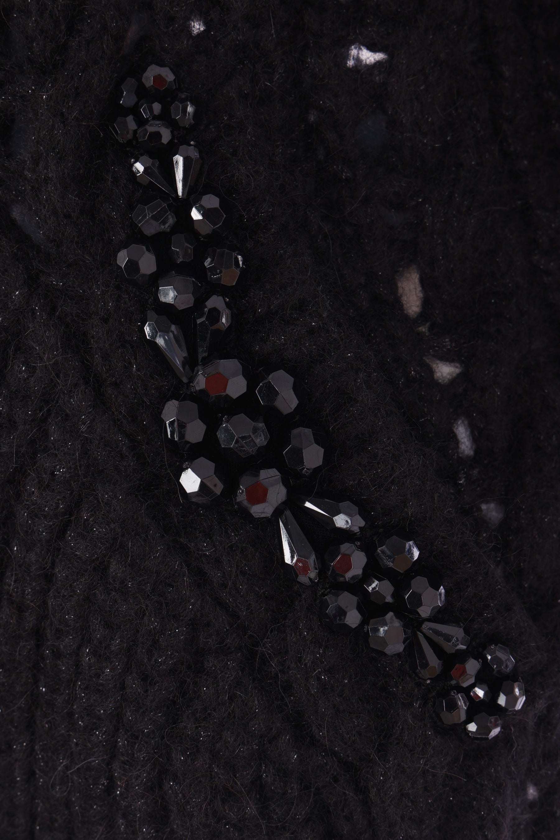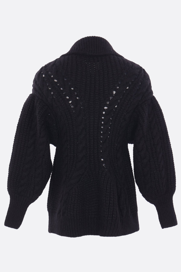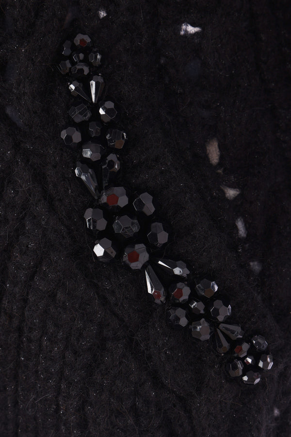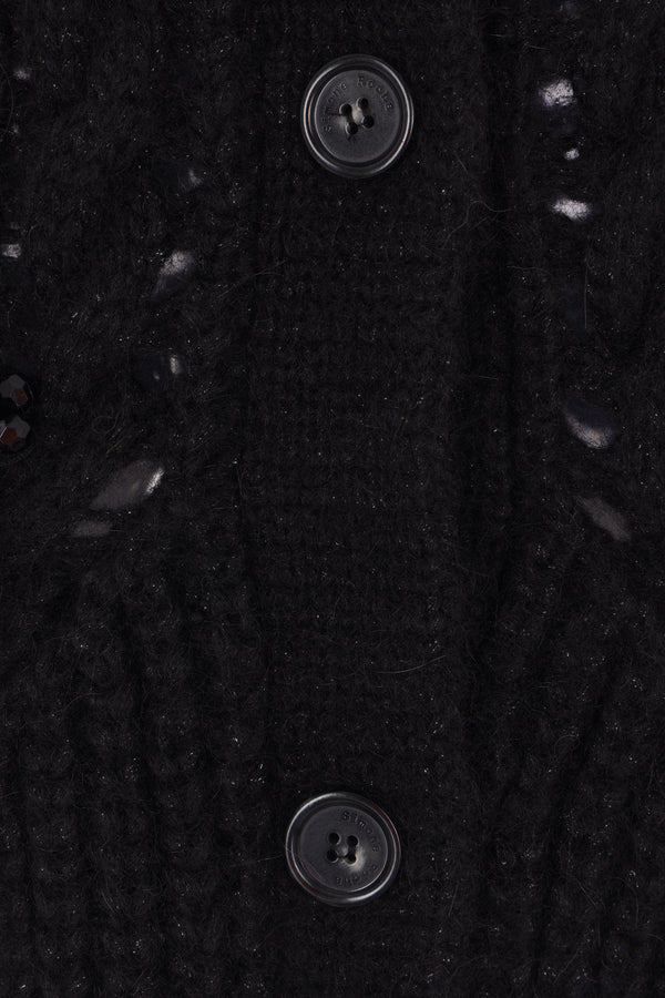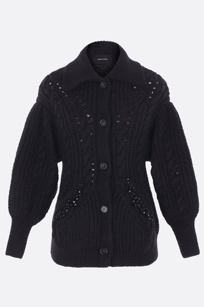 Simone Rocha cardigan crafted from black alpaca and wool-blend cable knit. Featuring a pointed collar, front button fastening, welt pockets with beaded embroidery, a sculpted waist silhouette, long sleeves, and ribbed trims.