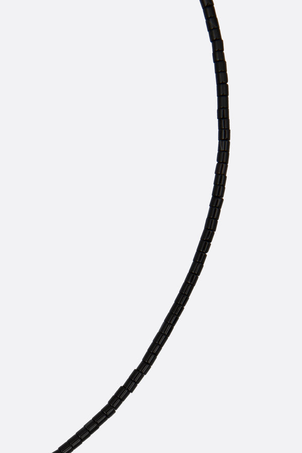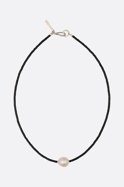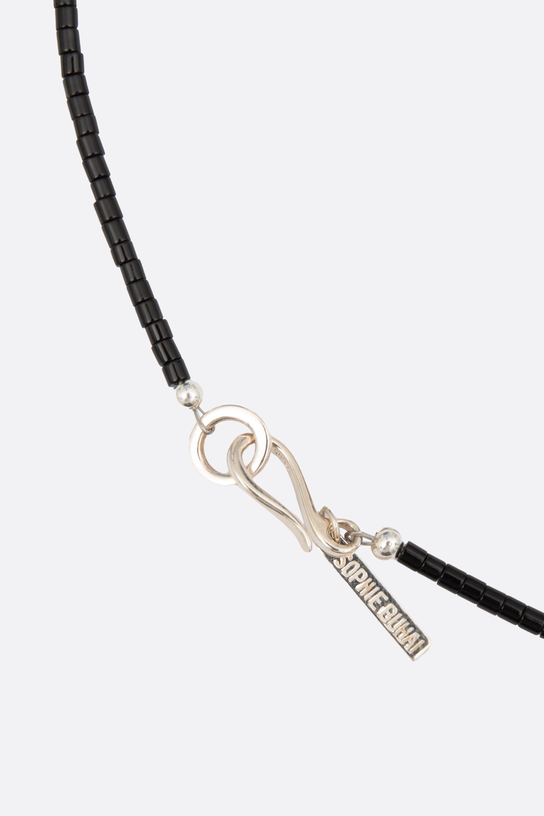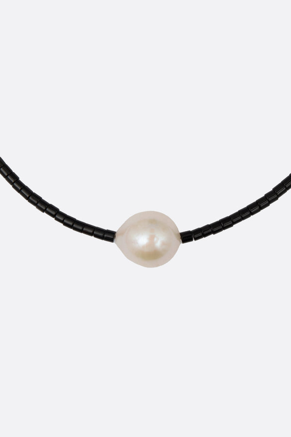 Sophie Buhai choker made with black agate seed beads and featuring a freshwater pearl at the center. It is finished with a sterling silver hook closure.