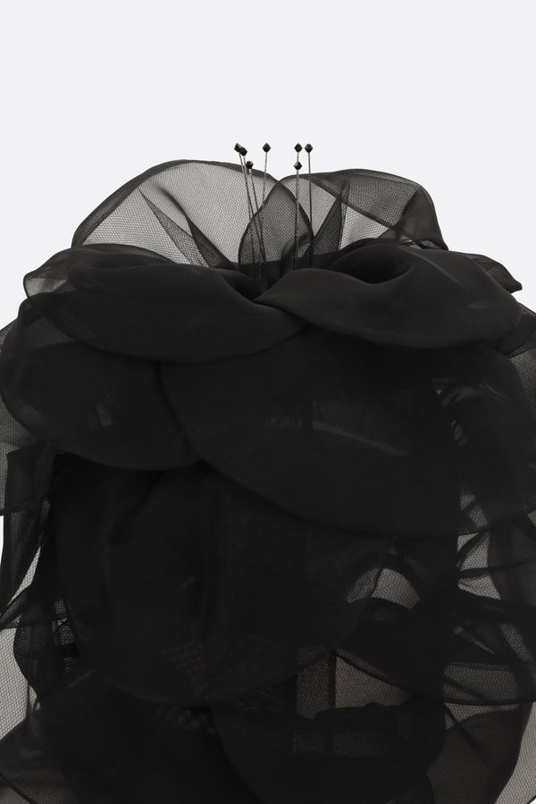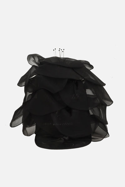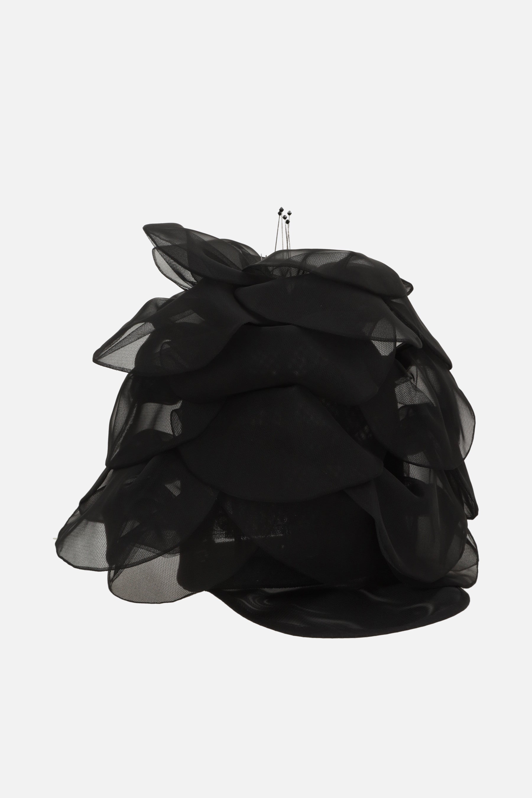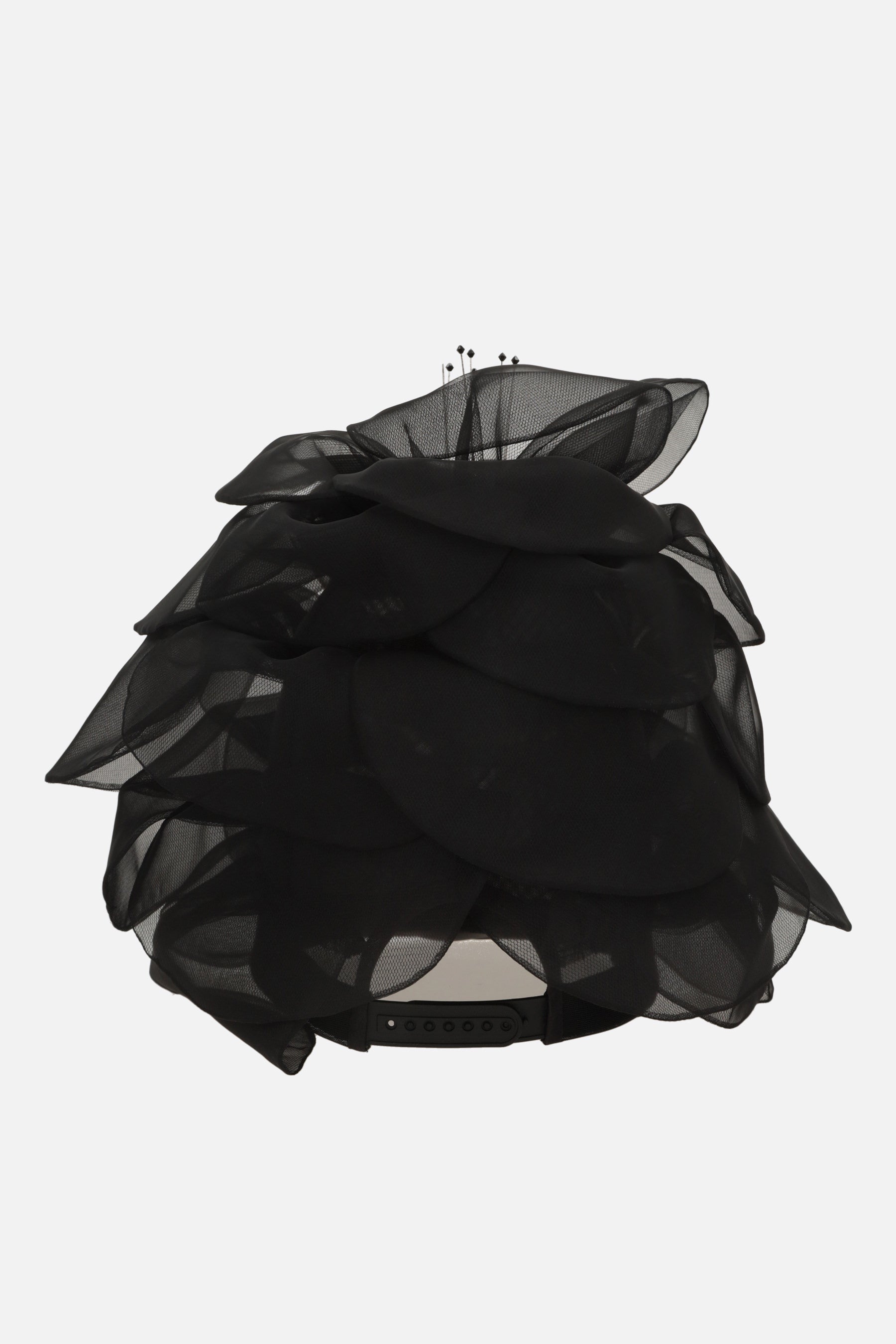 Stephen Jones hat made with black tulle and organza petals. Featuring a front visor and adjustable back closure.