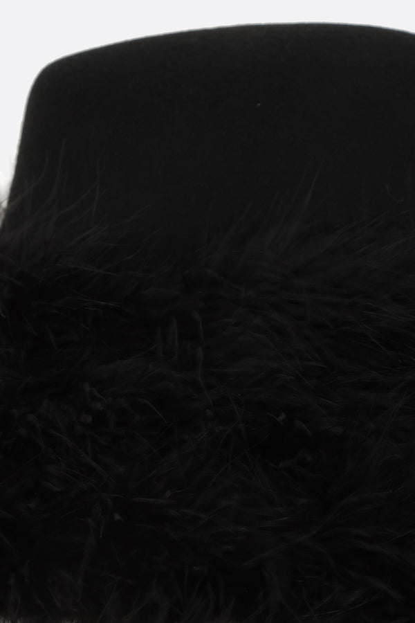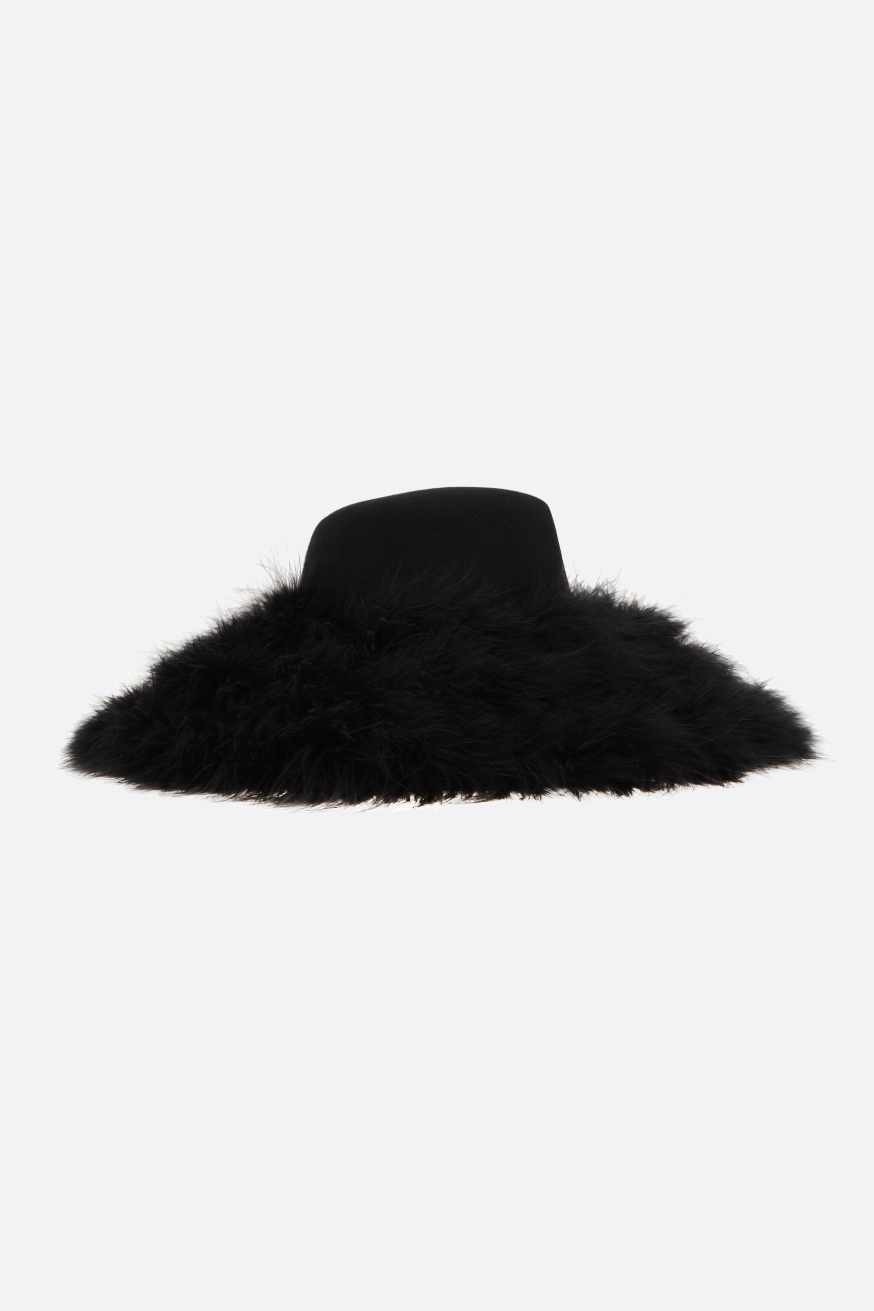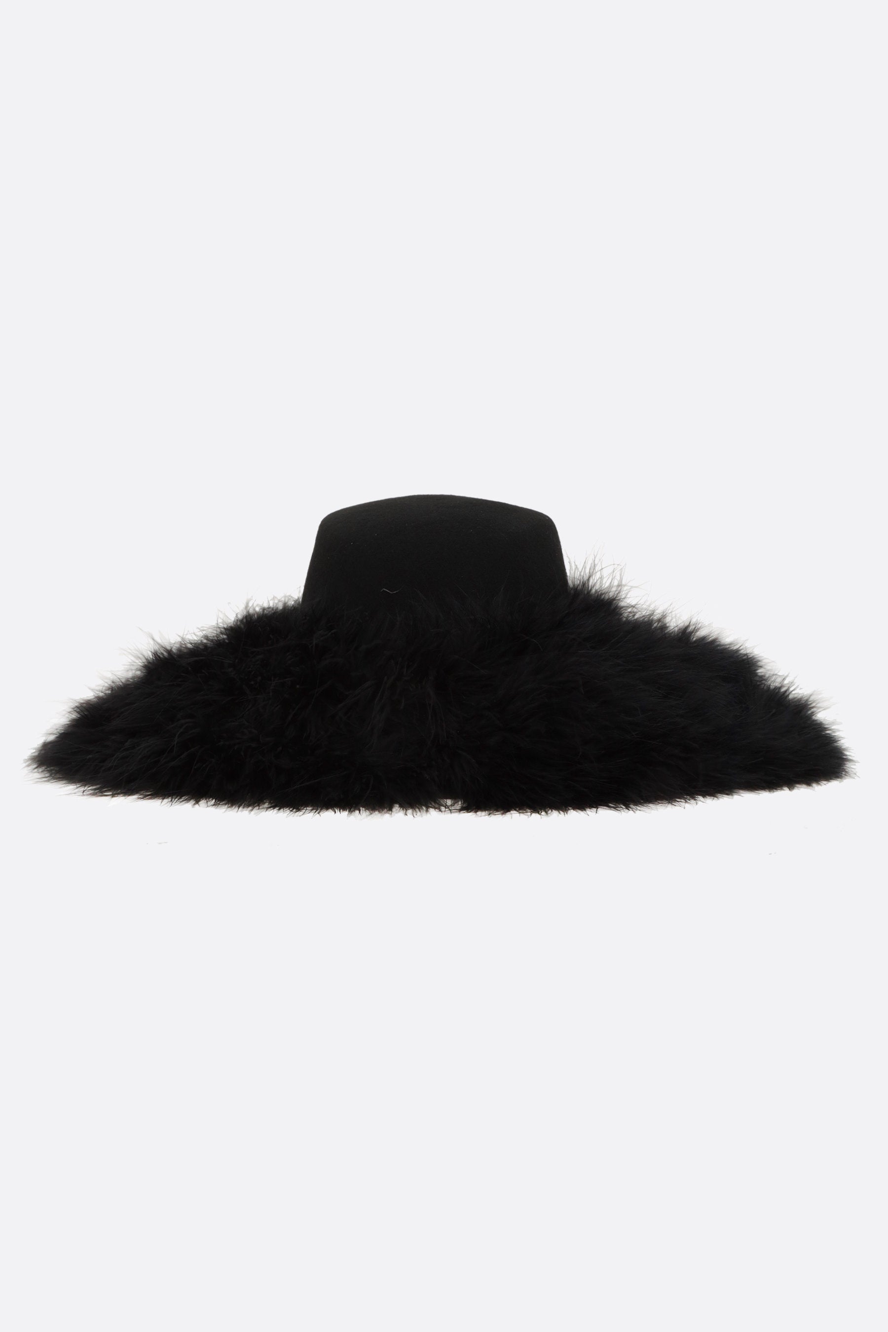 Stephen Jones hat crafted from wool felt, decorated with tone-on-tone feathers.