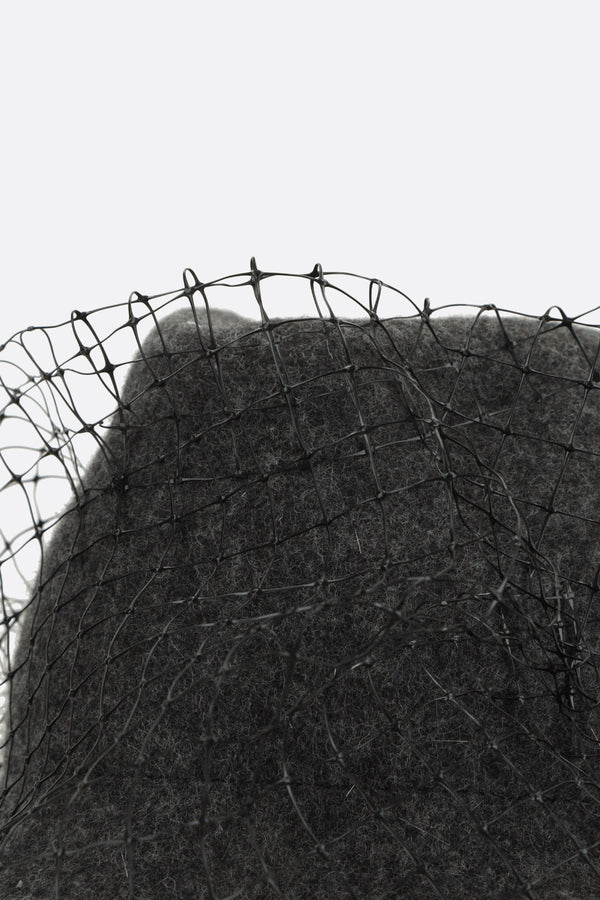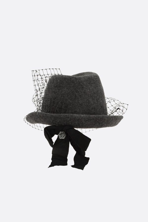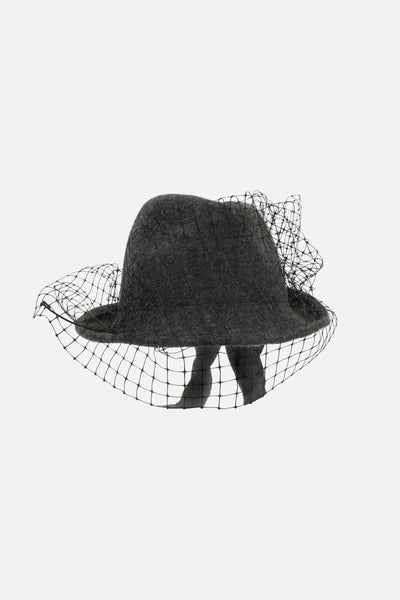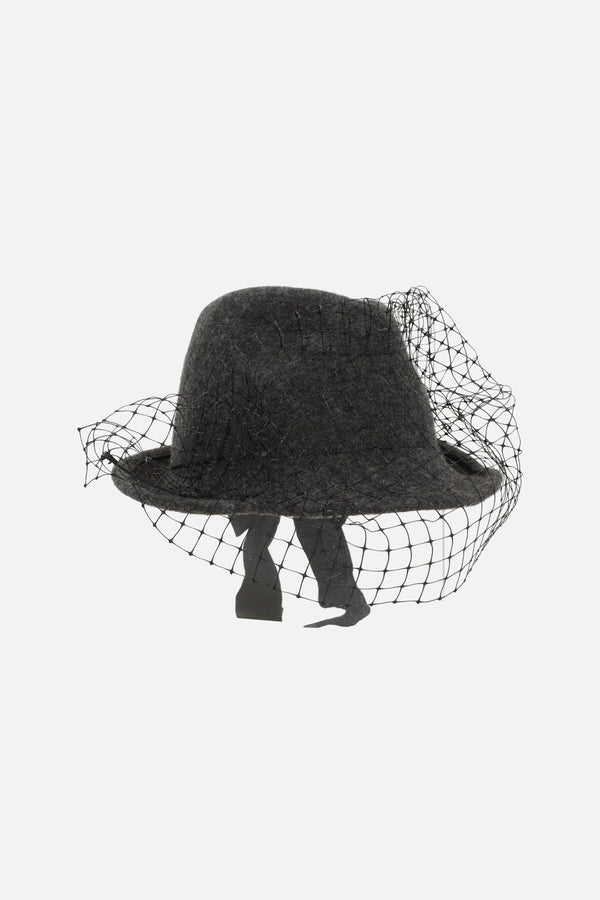 Stephen Jones trilby hat made of grey wool felt, featuring a plastic veil and a back bow in twill.