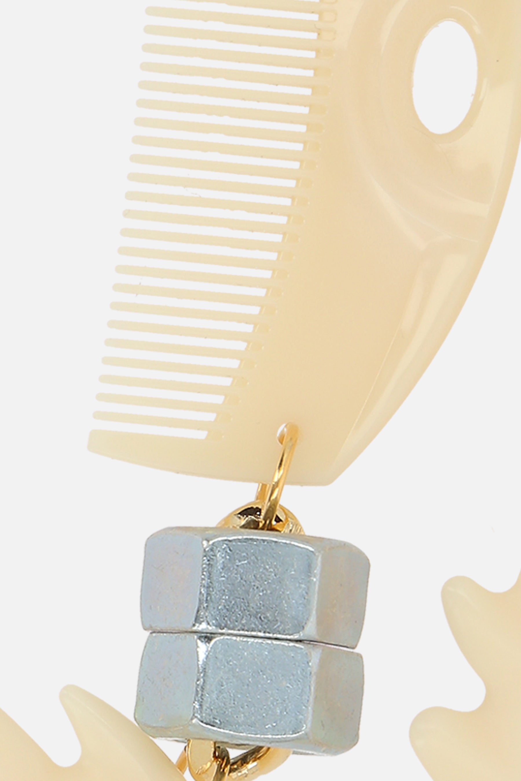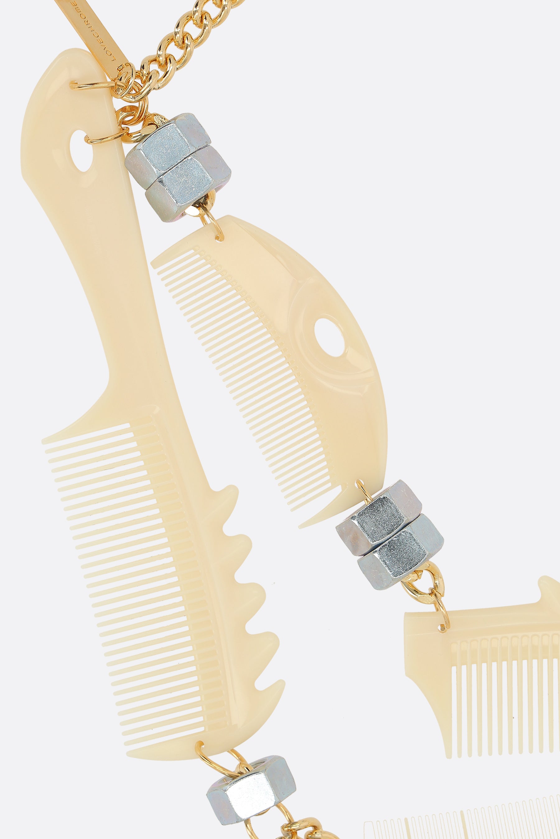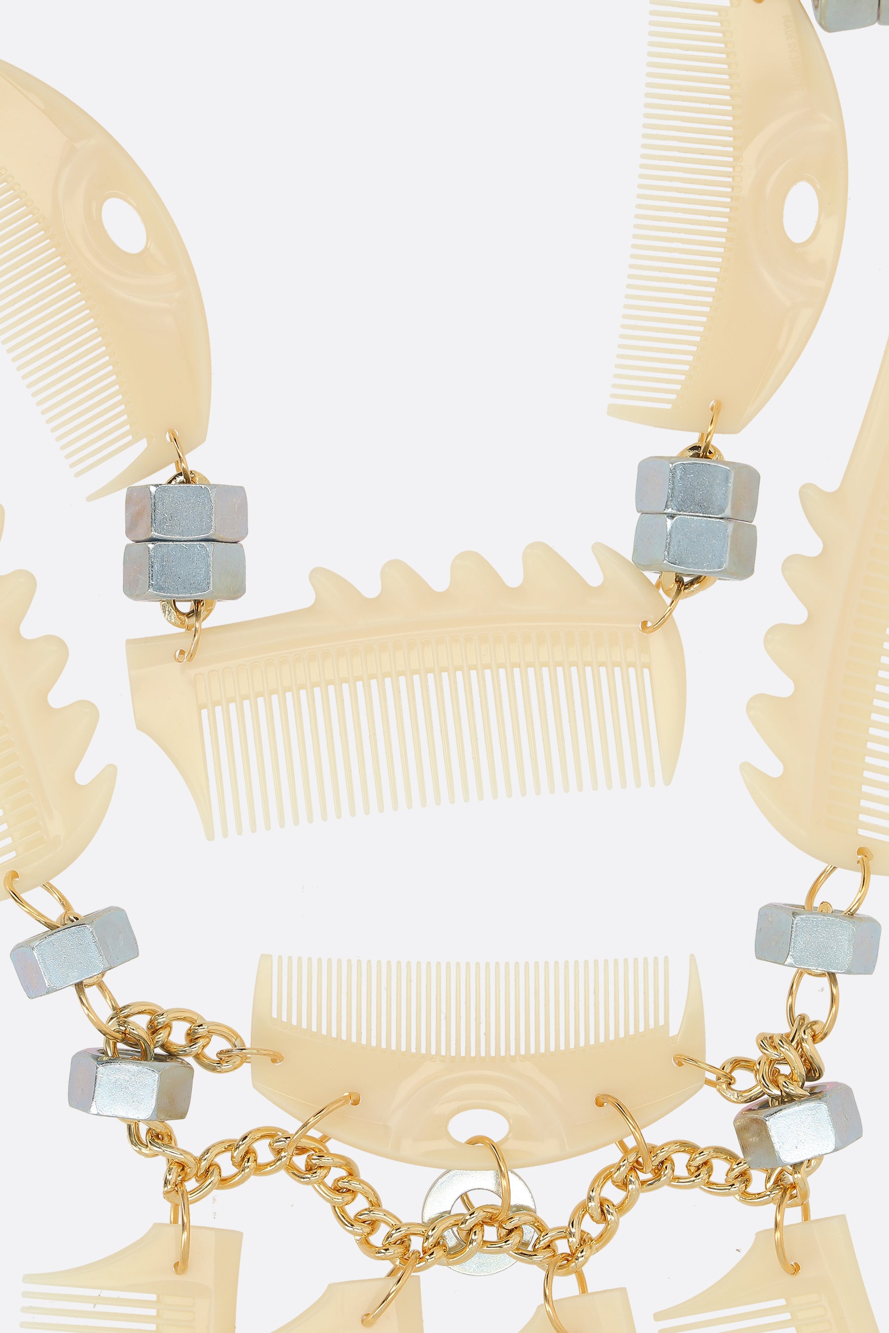 necklace featuring resin combs, bolts, and washers