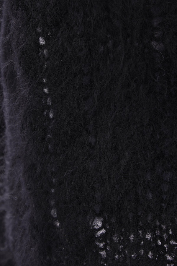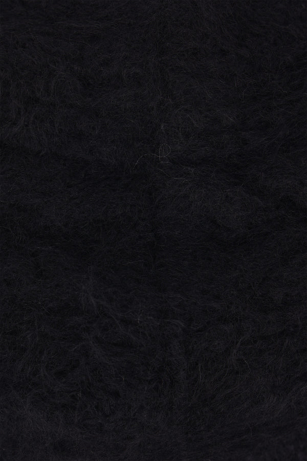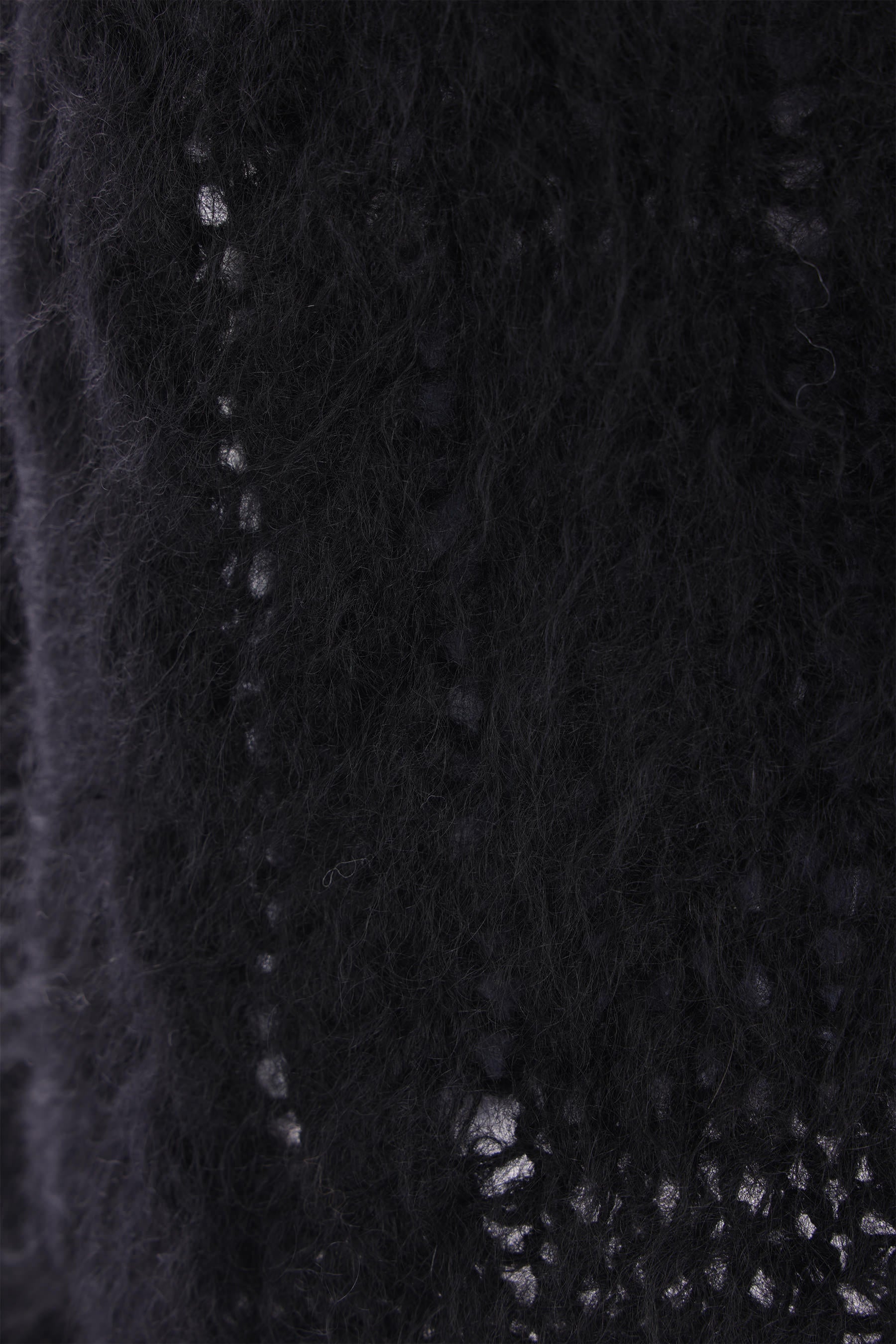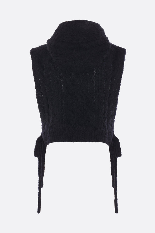 Tao Comme des Garçons vest made from black mohair and wool knit with cable detailing. Features a high collar with hood, side tie closure, and straight ribbed hem.
